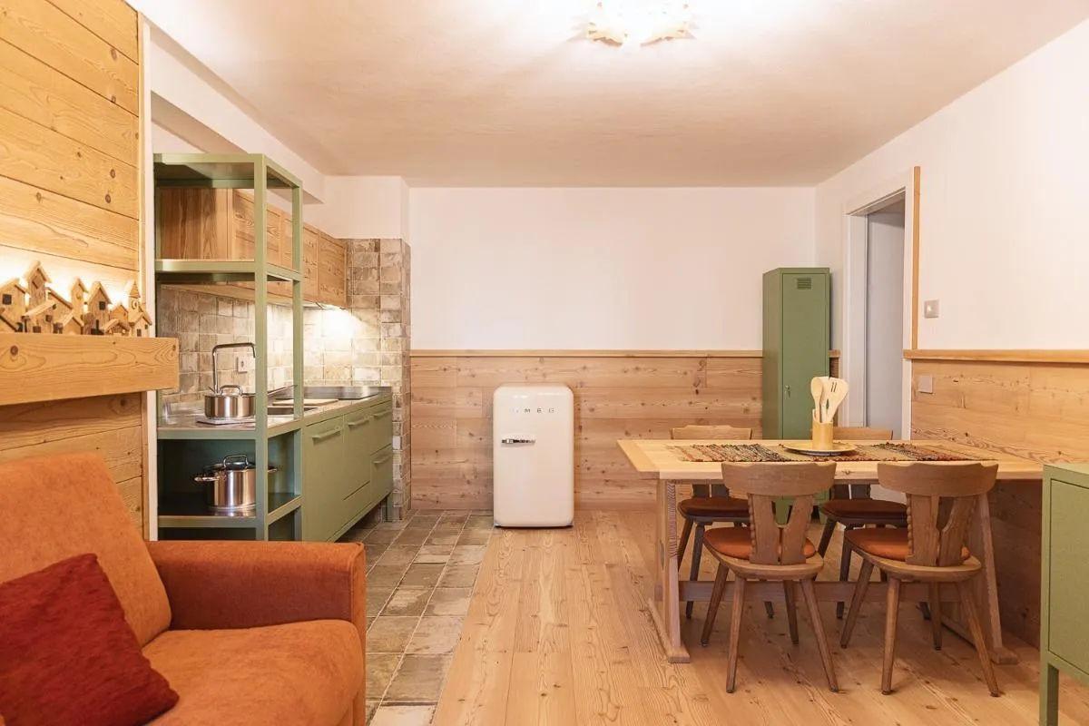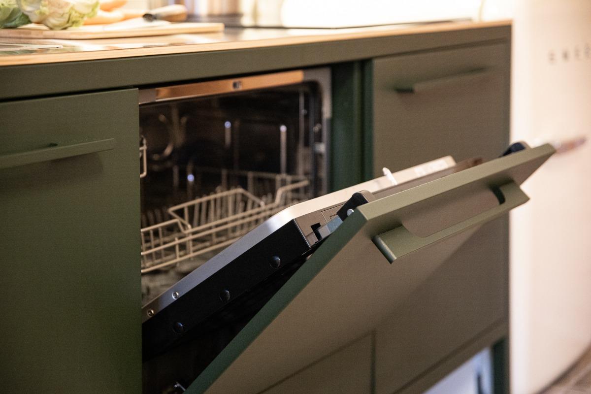 The kitchen in the apartment is equipped with a refrigerator, microwave, dishwasher, and induction hob.