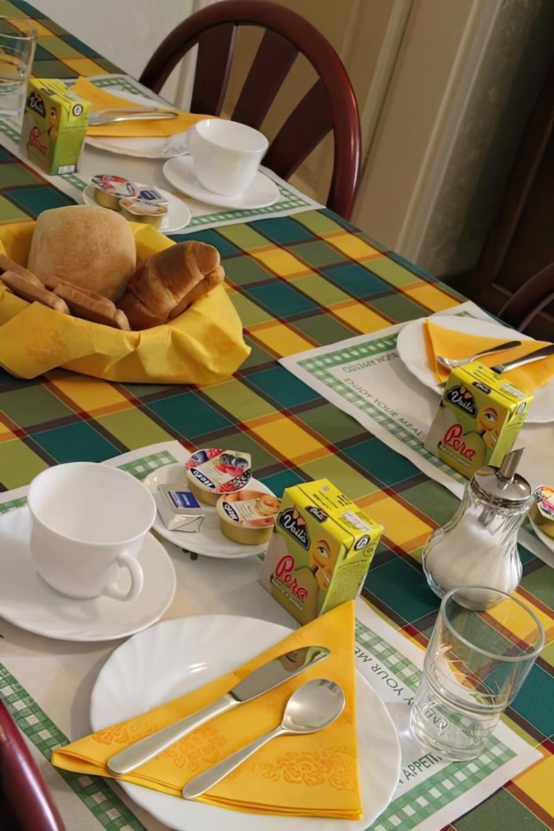 Colazione continentale: caffè, tè, latte, pane, fette biscottate, croissant, burro, marmellata, Nutella, succo di frutta.