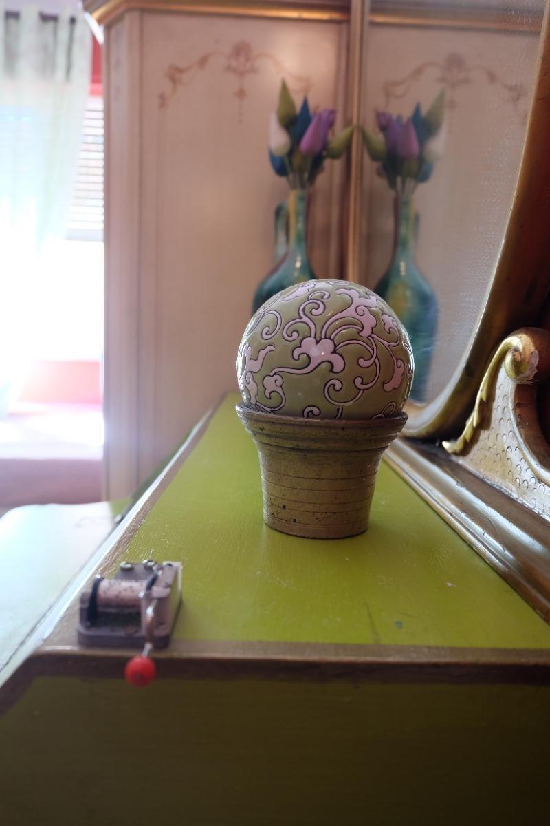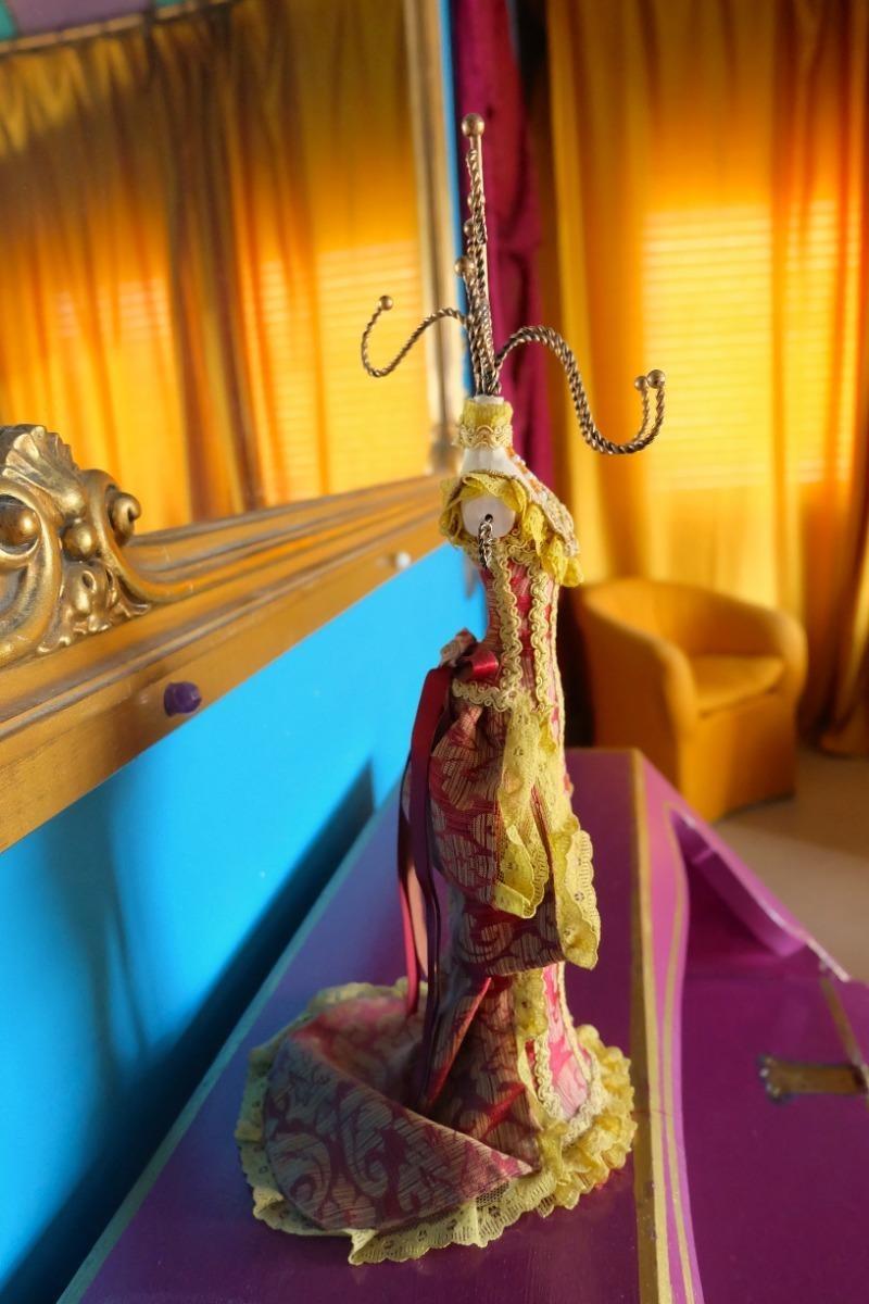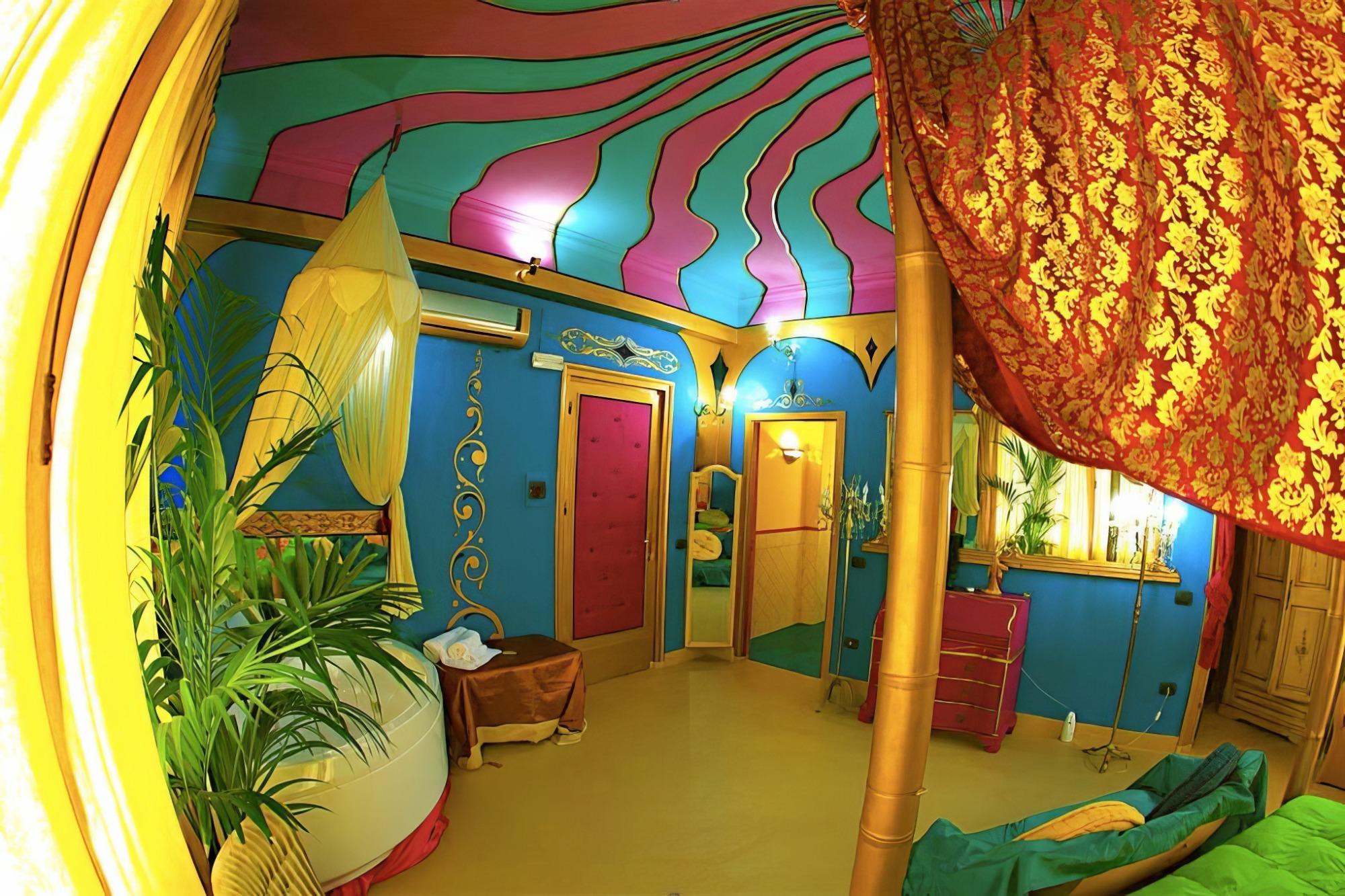 Everything here has found a new life, color, and purpose, continuously evolving with the creativity of the moment. The walls of the rooms change hues, the American-style furniture that transforms into desks—crafted from serious walnut veneer salvaged from the historic Hotel delle Palme, one of Palermo’s oldest and most prestigious hotels—now showcase the many colors of the Sultanate, becoming an integral part of the experience. The music boxes in the rooms come from a Parisian market, while hot air balloons, having traveled from distant lands, seem to have paused for a brief rest as they adorn the ceilings.