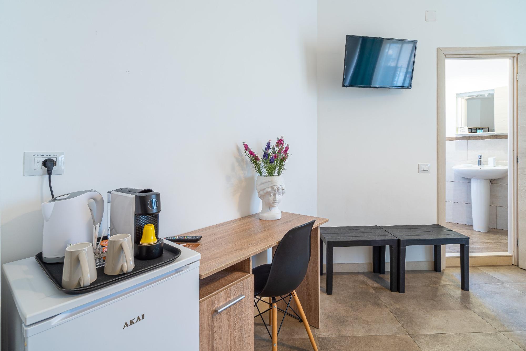 The stylish and contemporary rooms all feature a furnished balcony, a private bathroom with a shower and bidet, and large windows that allow for plenty of natural light. Each room also includes: daily cleaning with complimentary towel changes, independent air conditioning, a refrigerator, a TV, a coffee machine, WIFI internet connection, complimentary toiletries, and a hairdryer. Additionally, there is a shared dining area equipped with a microwave and seating.