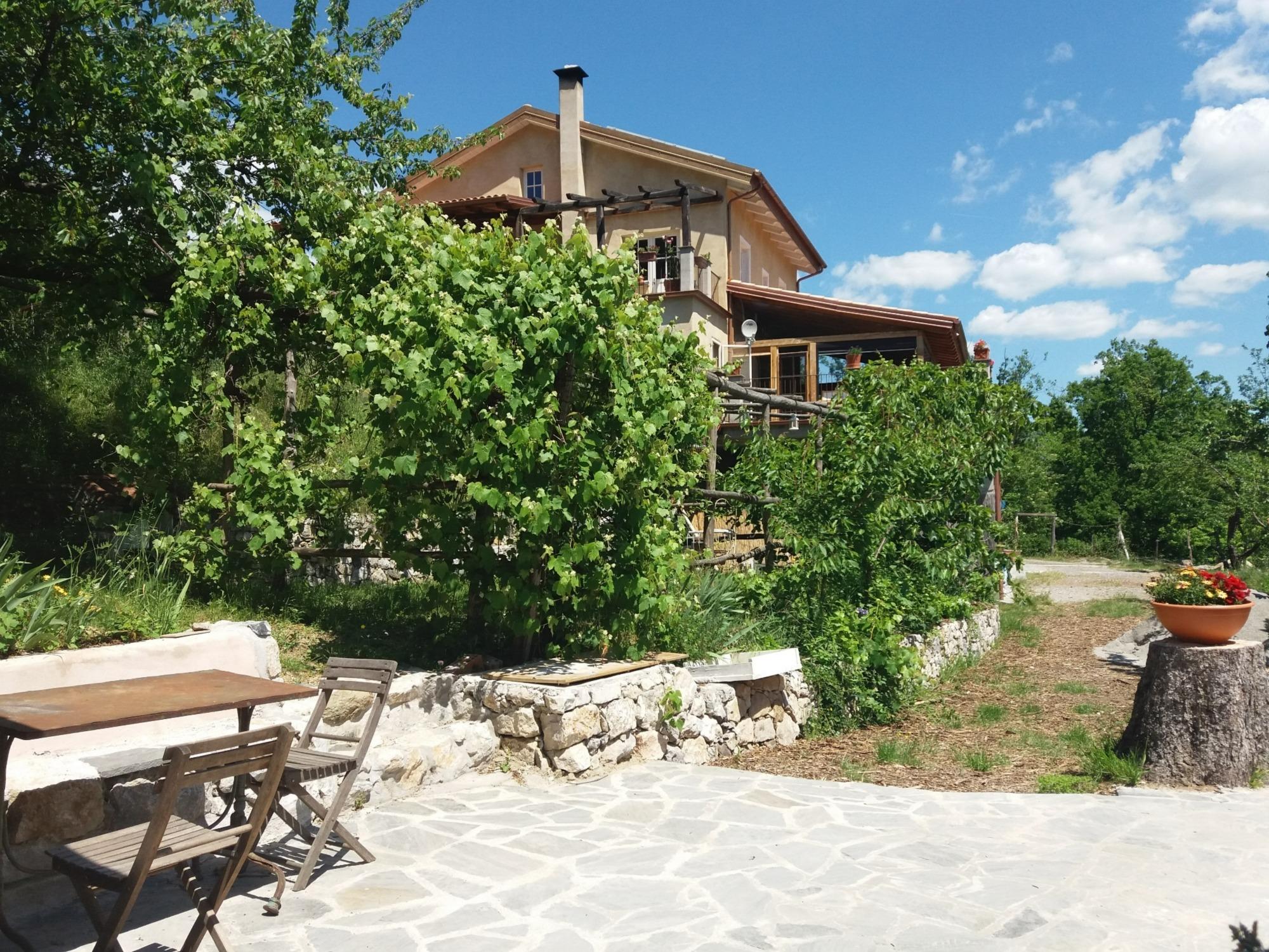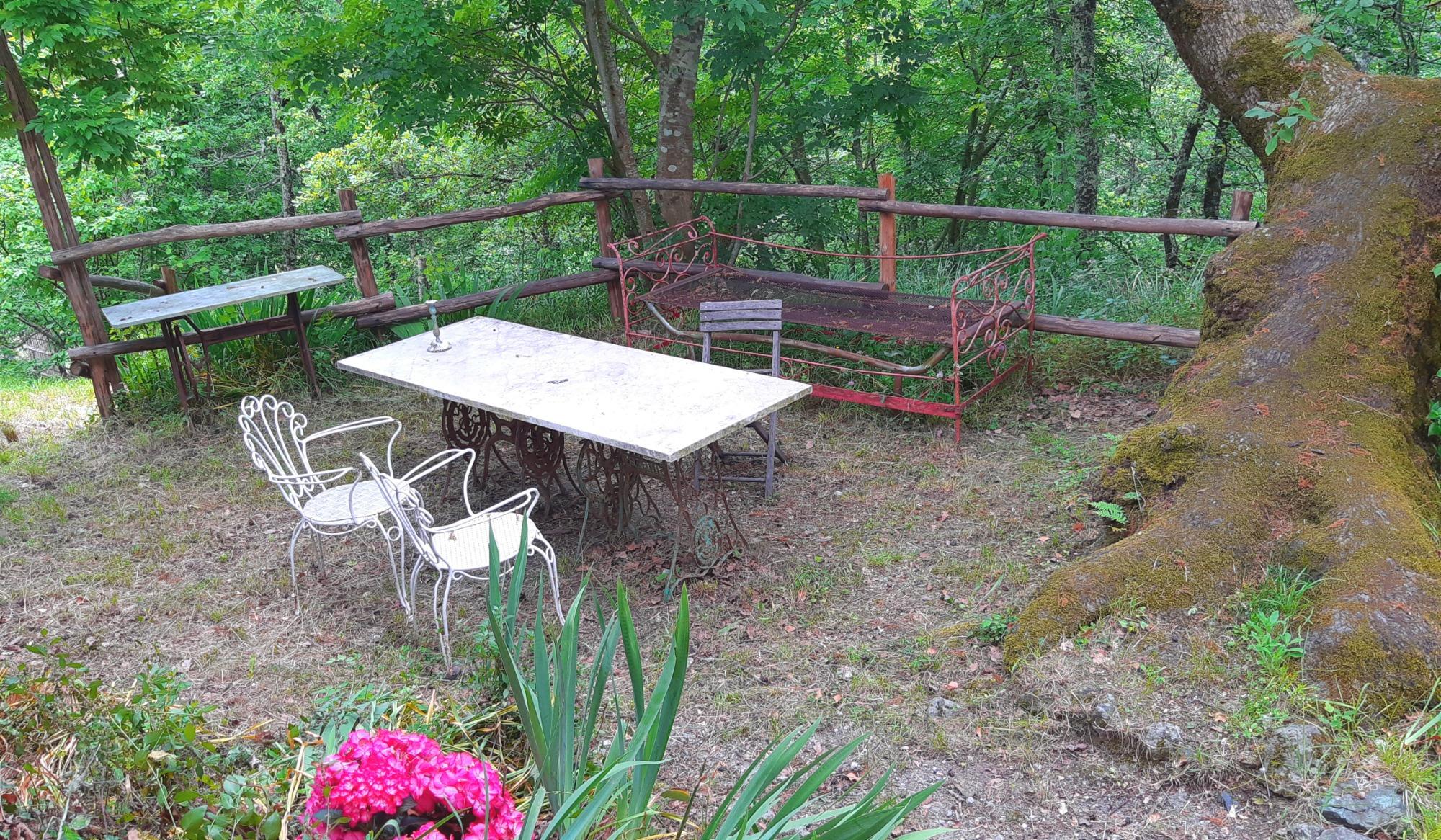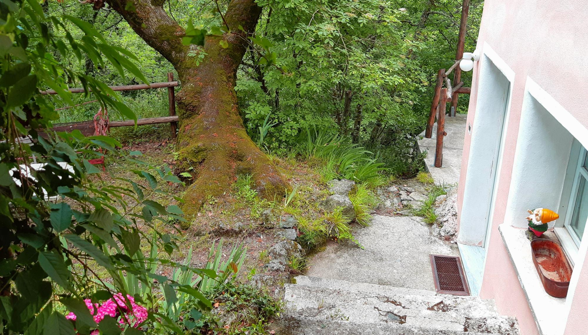 Open space con angolo cottura, roccia a vista, terrazza, giardino e vista sul bosco.