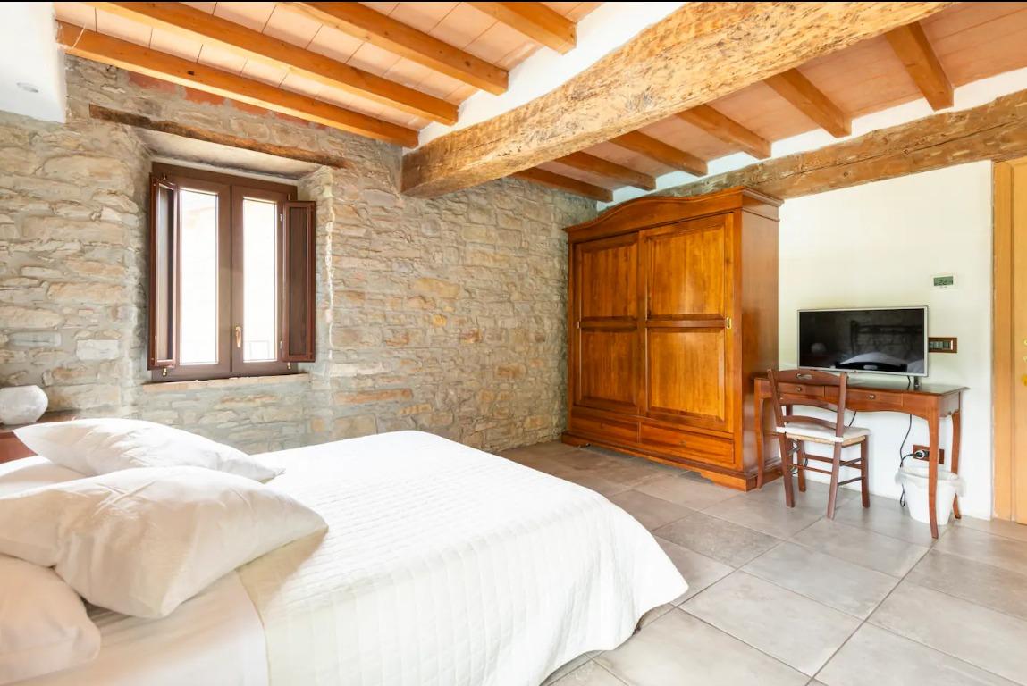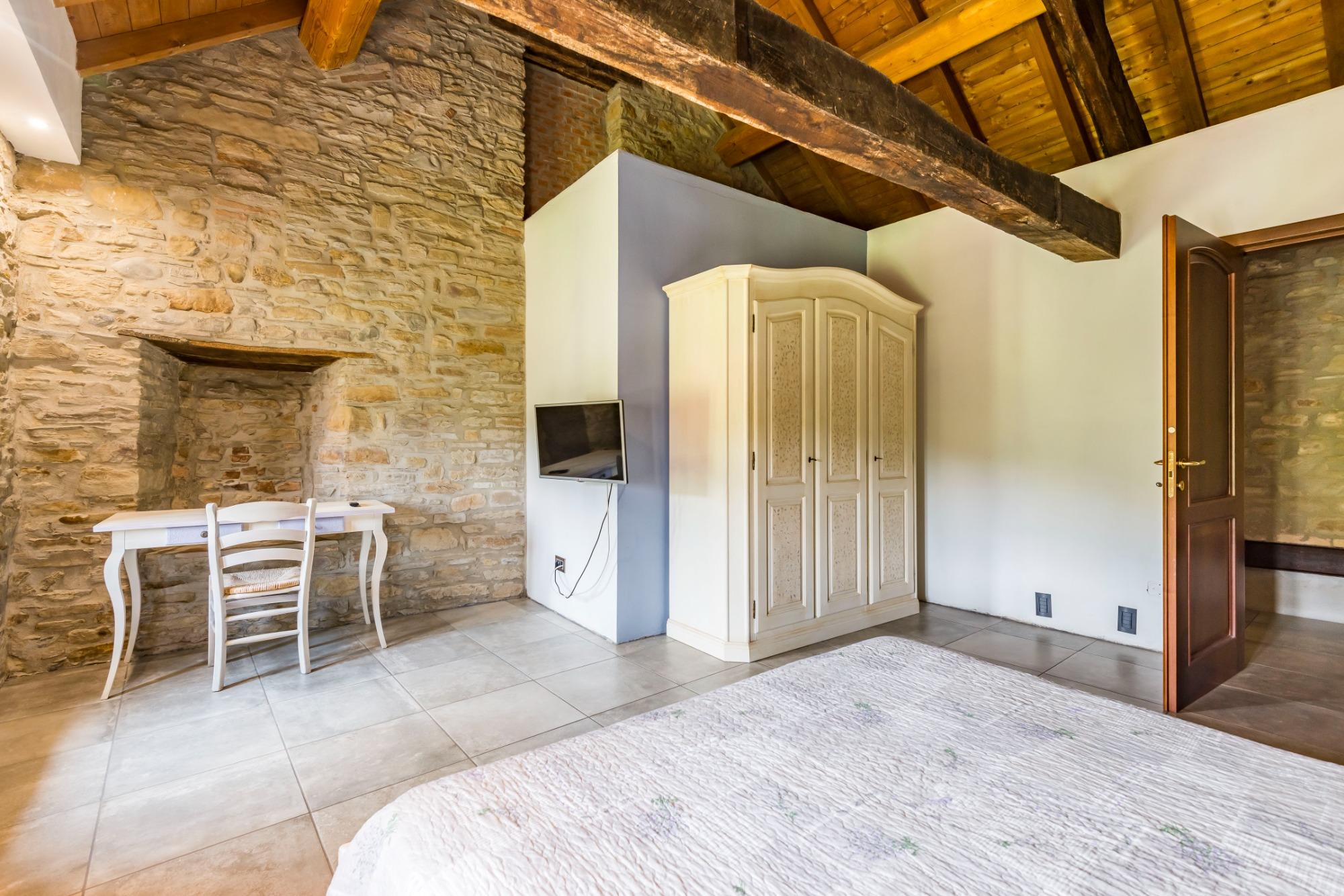La camera Viola di Parma è situata al primo piano della struttura con affaccio direttamente sull’orto e sul recinto dei cavalli. Vanta un alto soffitto con travi a vista. Il bagno privato ha un’ampia doccia a filo pavimento. La camera è caratterizzata dal colore Viola di Parma.
