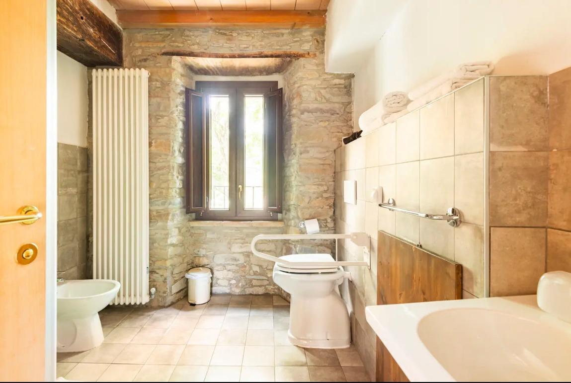 La camera presenta accorgimenti indispensabili per i disabili o per coloro che usufruiscono della carrozzina, infatti le maniglie delle finestre sono ribassate, l’anta del mobile è scorrevole, spazi di manovra per accostarsi al letto, porte ampie per il passaggio, bagno con maniglioni, doccia senza porta per facilitare l’entrata e l’uscita dalla stessa.