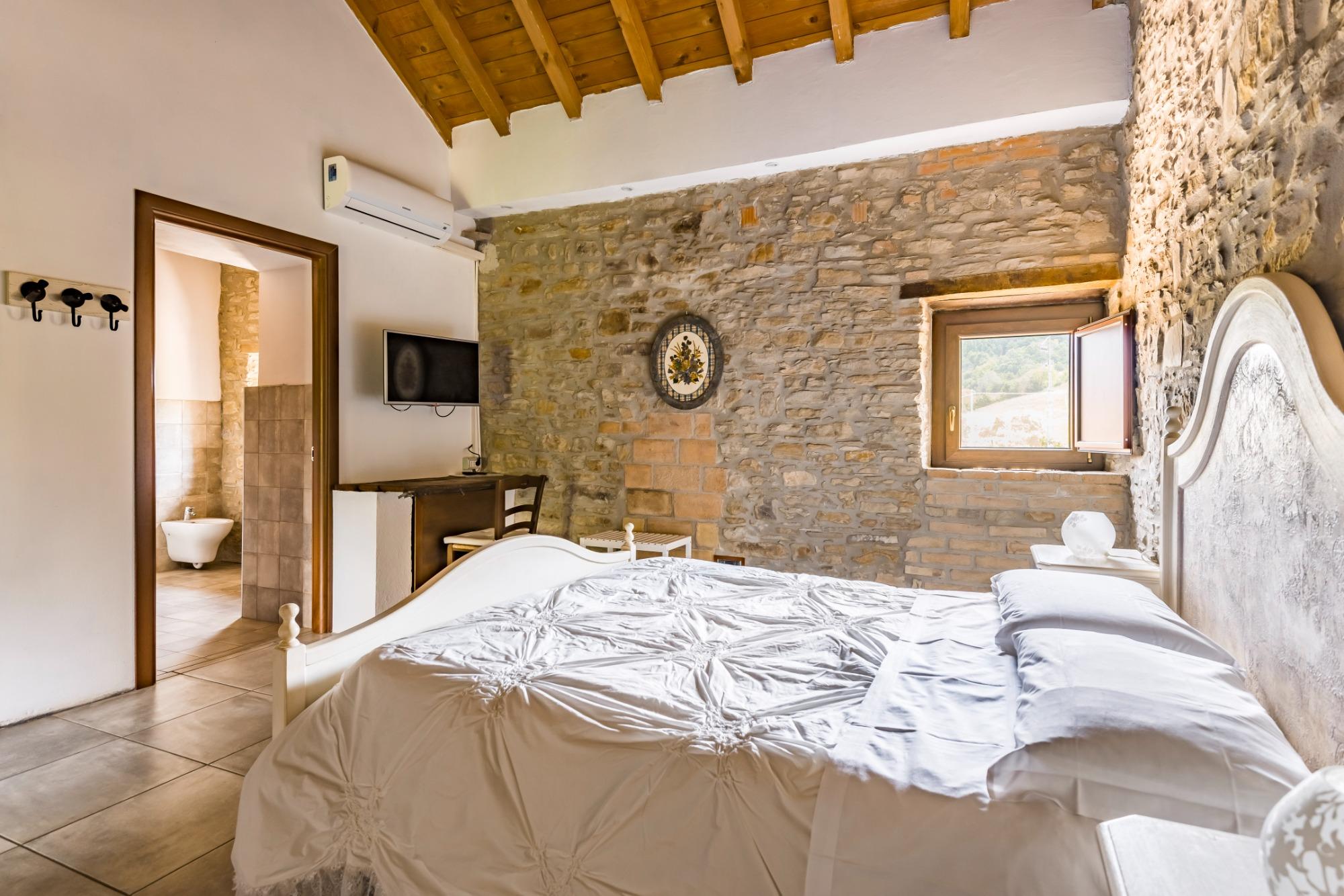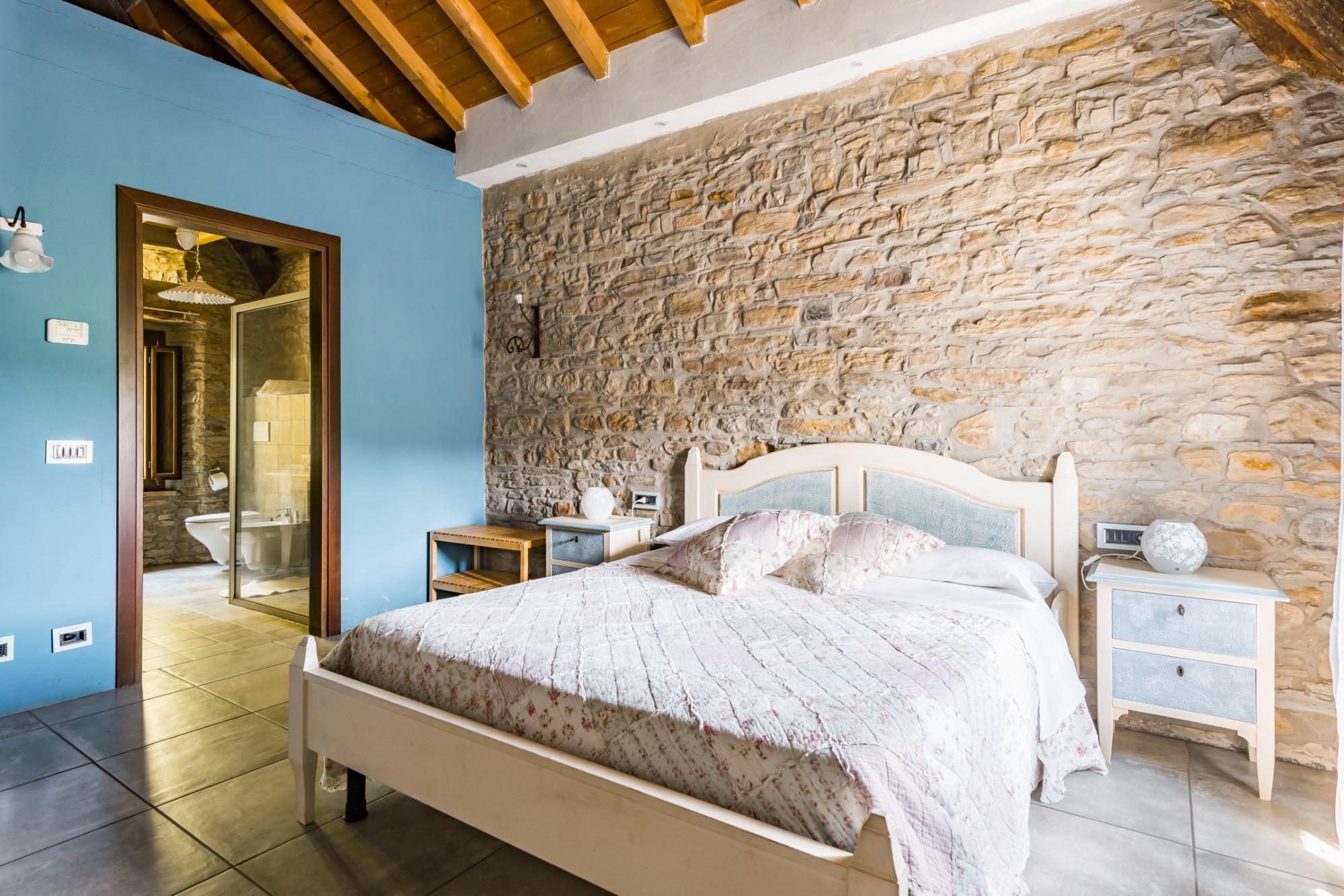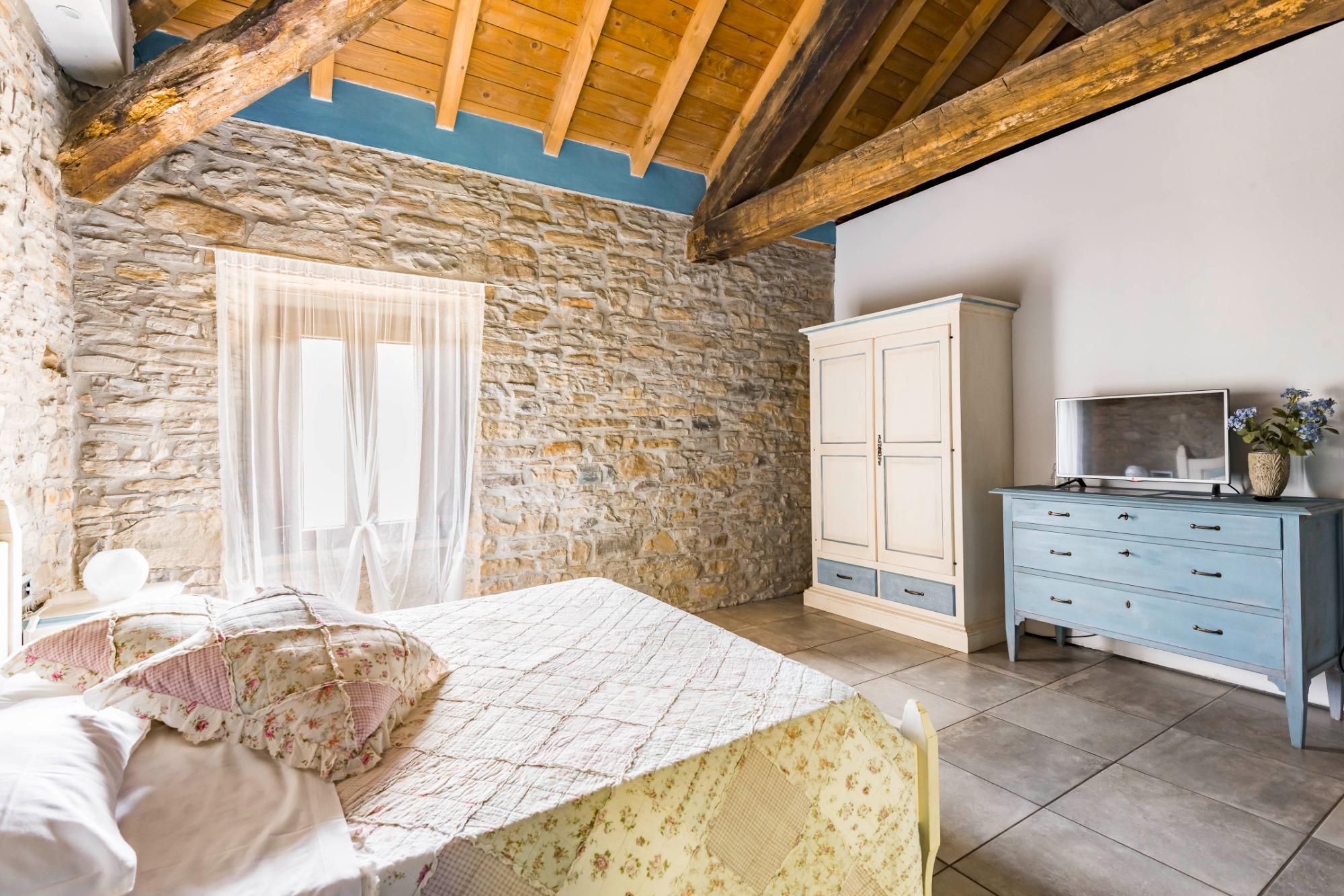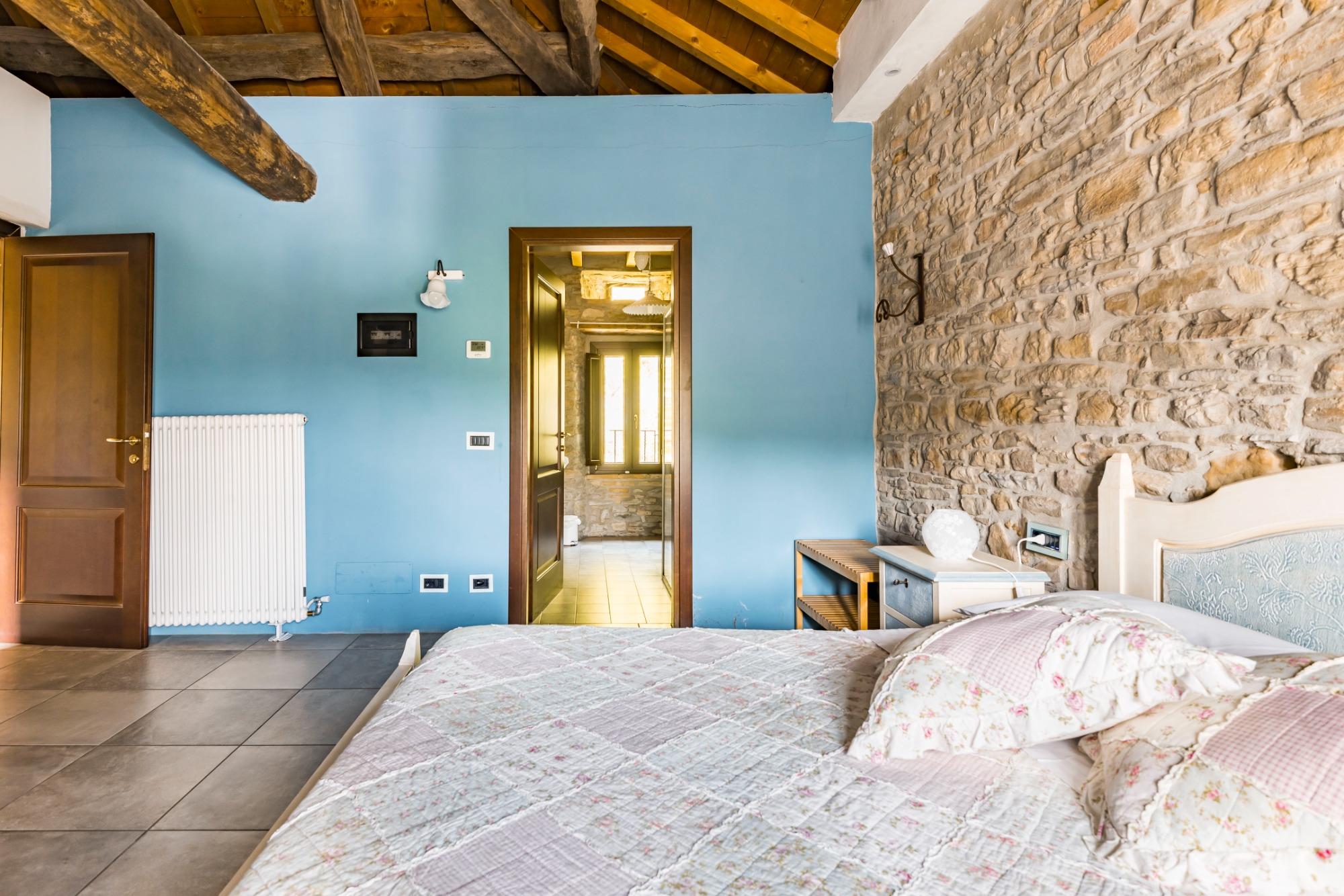 La camera Non ti scordar di me è situata al primo piano della struttura con affaccio sui campi circostanti. Collocandosi nella parte finale della struttura il gioco delle travi rende questa camera la più bella grazie anche all’atmosfera del sasso a vista. Il bagno privato ha un’ampia doccia a filo pavimento. La camera è caratterizzata dal colore del fiore Non ti scordar di me ovvero su un azzurro pastello molto rilassante.