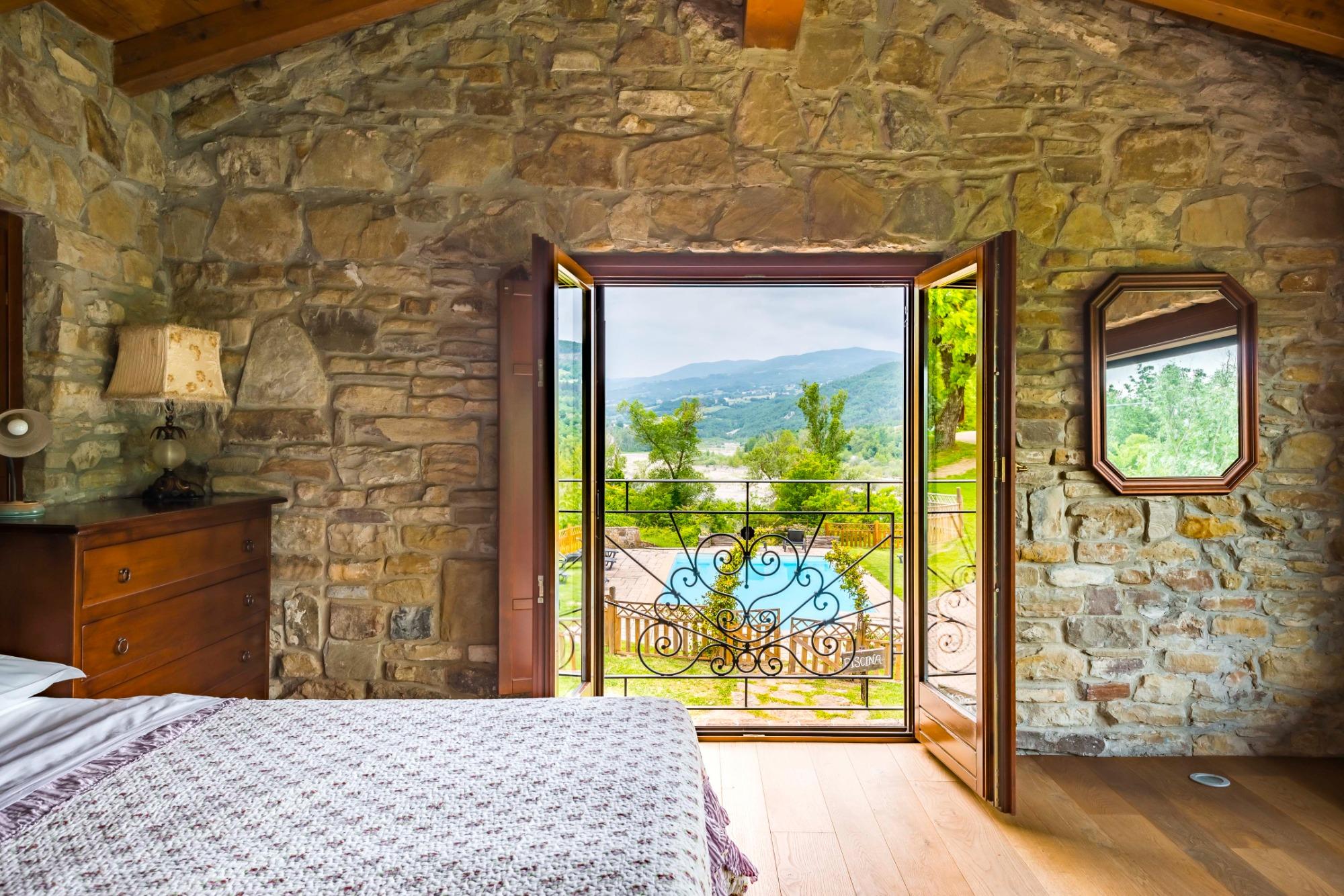La camera Girasole è la camera più luminosa che abbiamo grazie alle 3 finestre di cui dispone, una delle quali rivolta verso la piscina e il fiume sottostante.