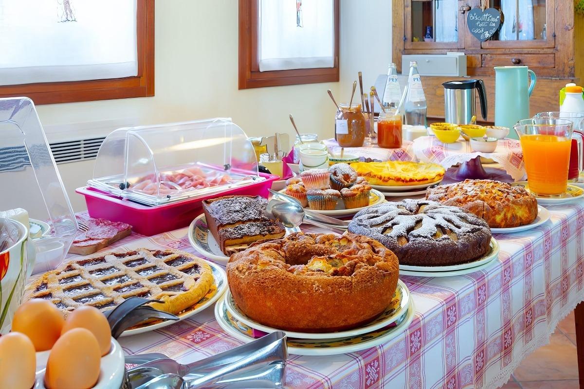 Le délicieux et copieux petit-déjeuner buffet est préparé avec soin en utilisant des produits locaux et de proximité de l'exploitation agricole. Pendant la belle saison, vous pourrez savourer cette délicatesse en plein air, à l'ombre des pergolas. Voici une sélection des délices authentiques qui vous attendent :