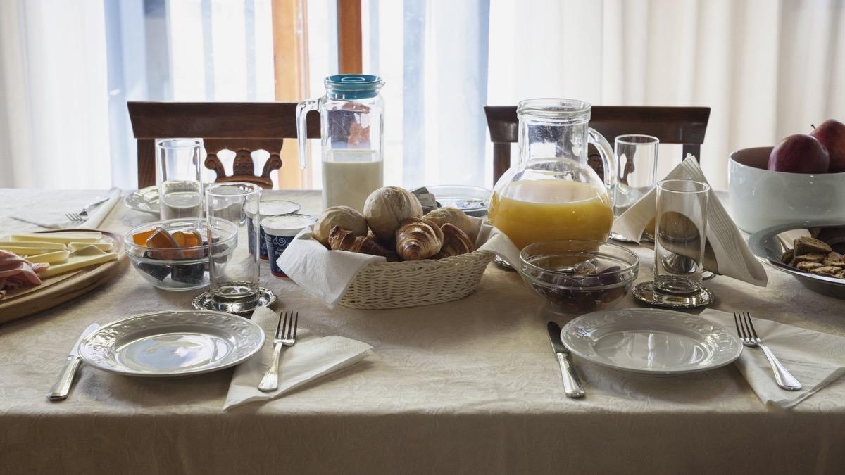 Orange juice, butter, gluten-free jam, mixed yoghurt, corn flakes and chocolate corn flakes, ham, salami, cheese, freshly baked croissants and warm bread and moka coffee.