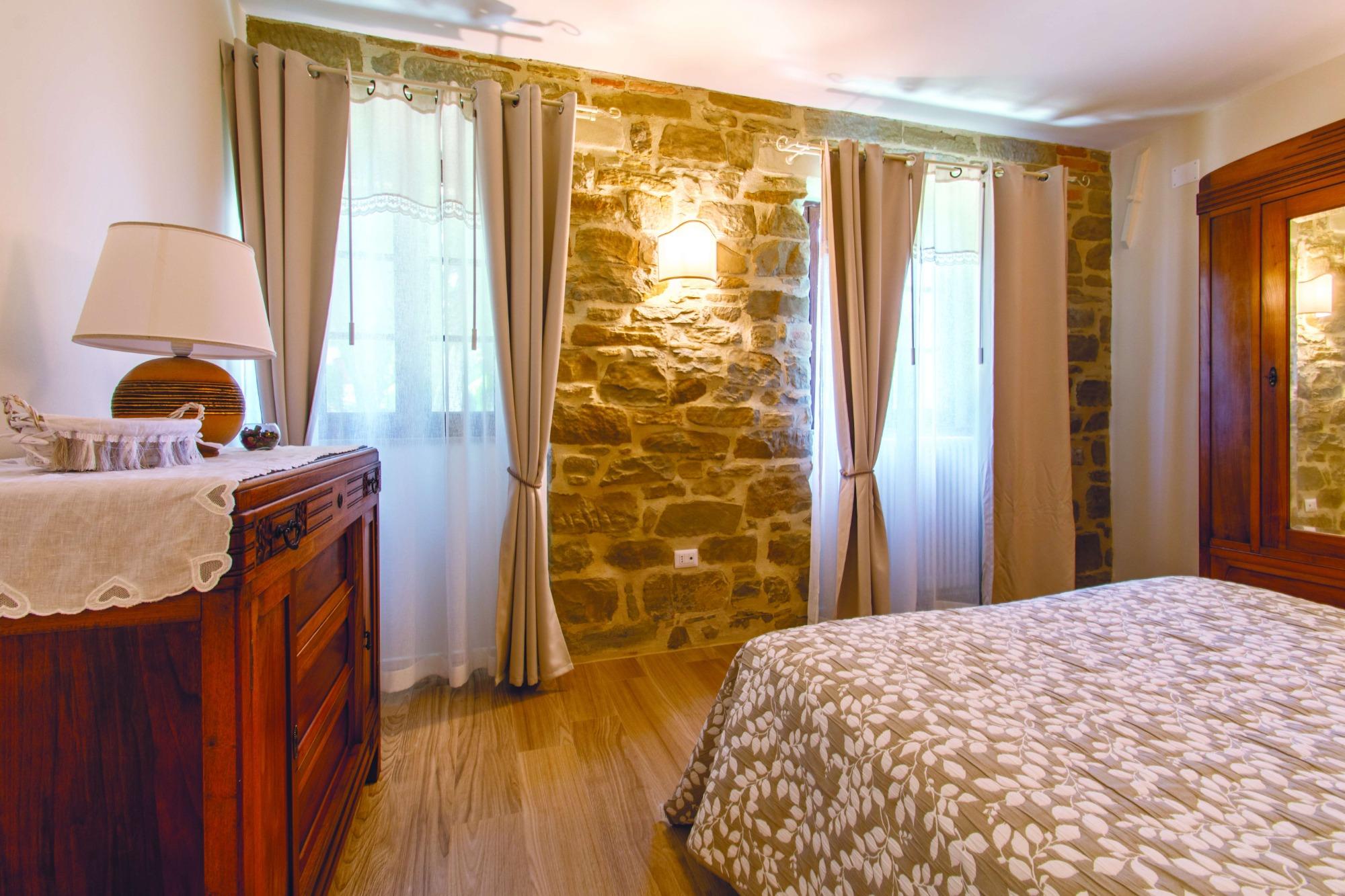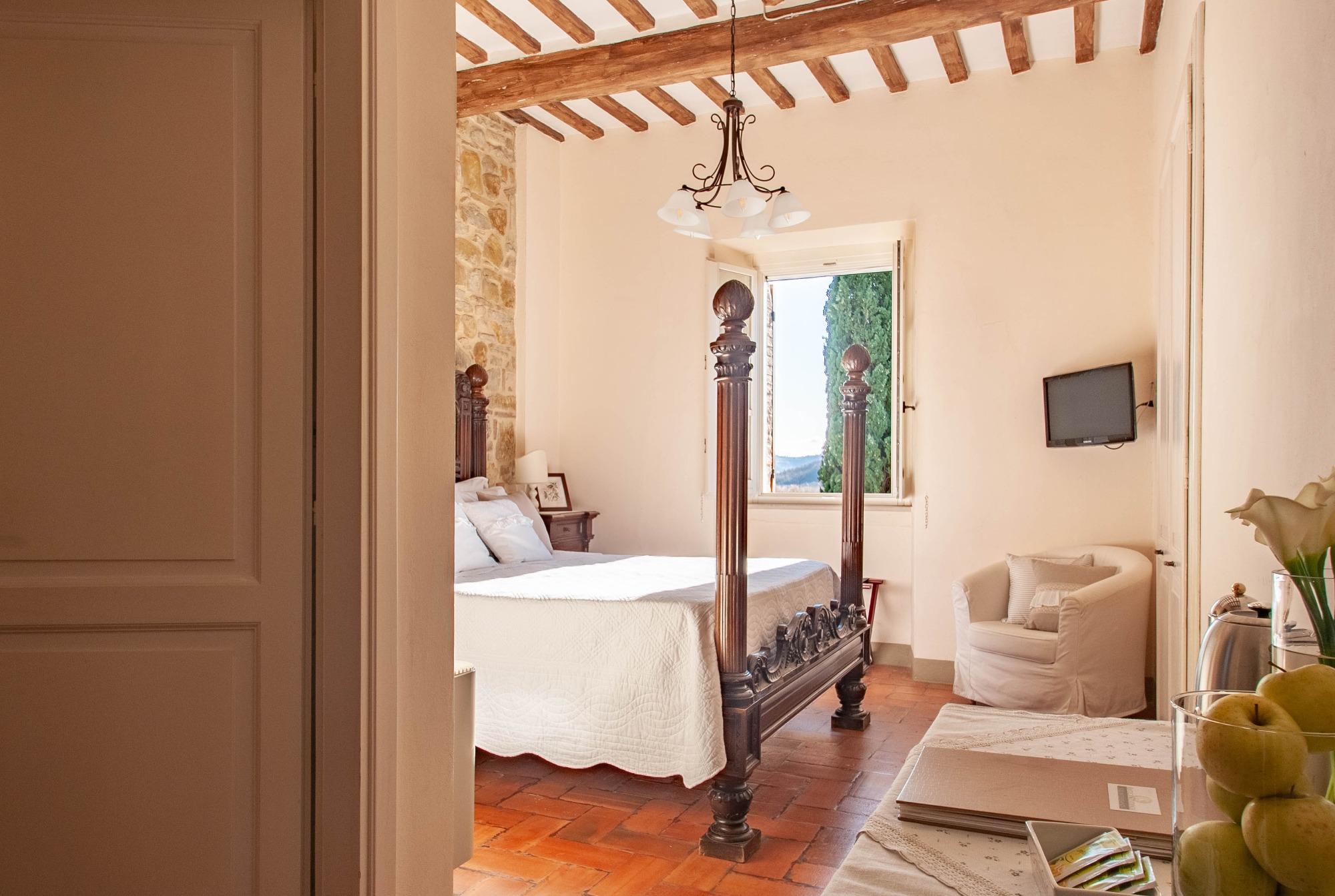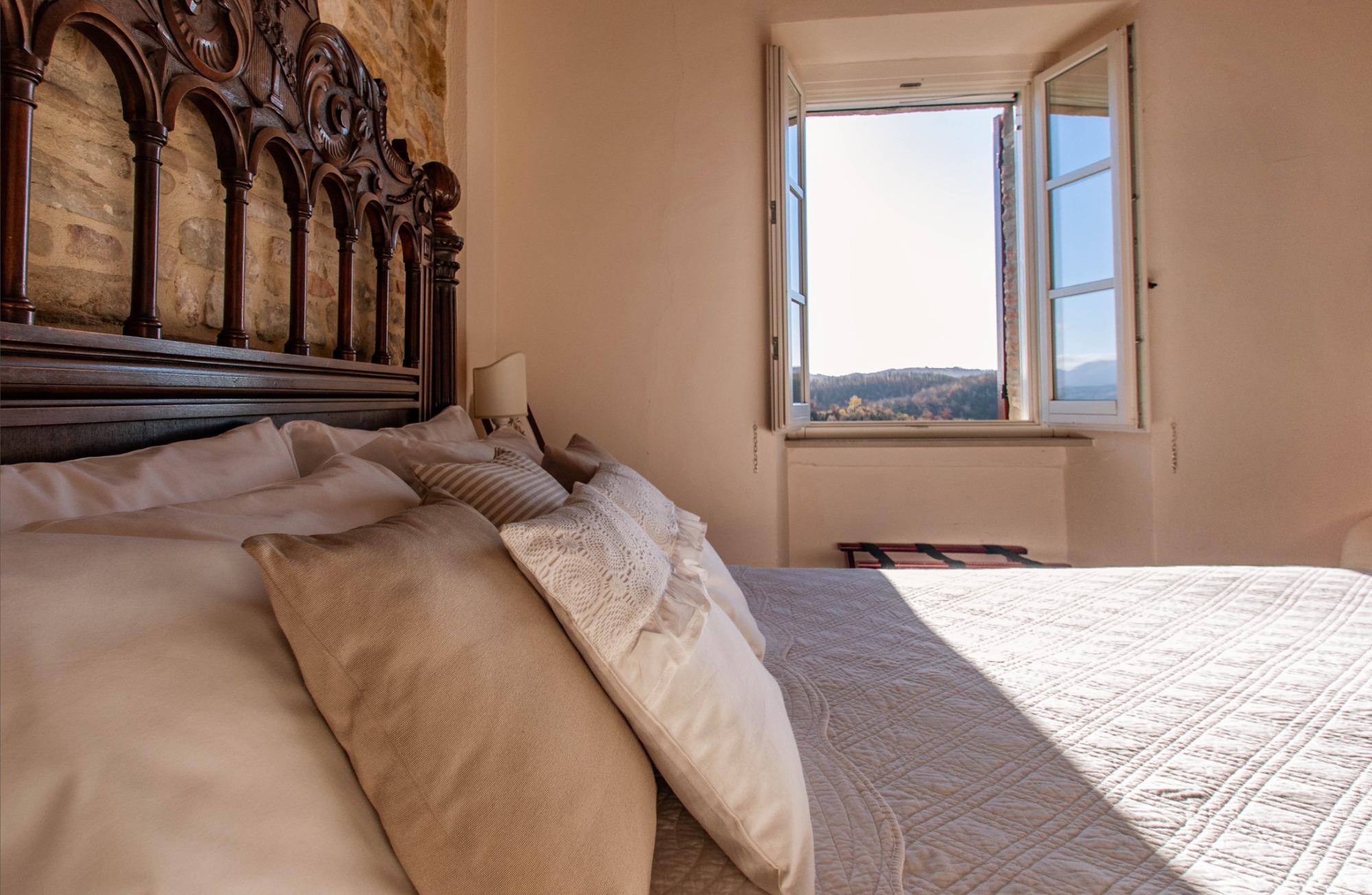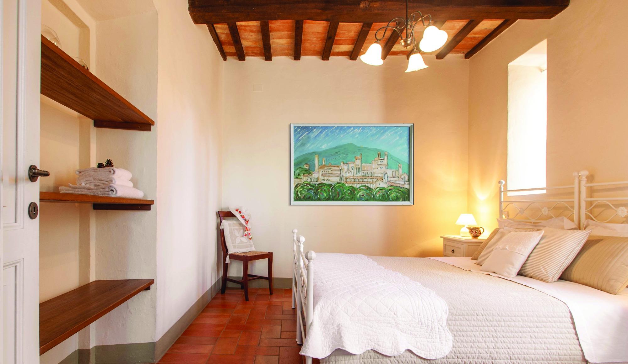 Camera al primo piano con vista panoramica dominante le colline circostanti, antico e comodissimo letto matrimoniale in legno inciso a mano, minibar, bagno con doccia.