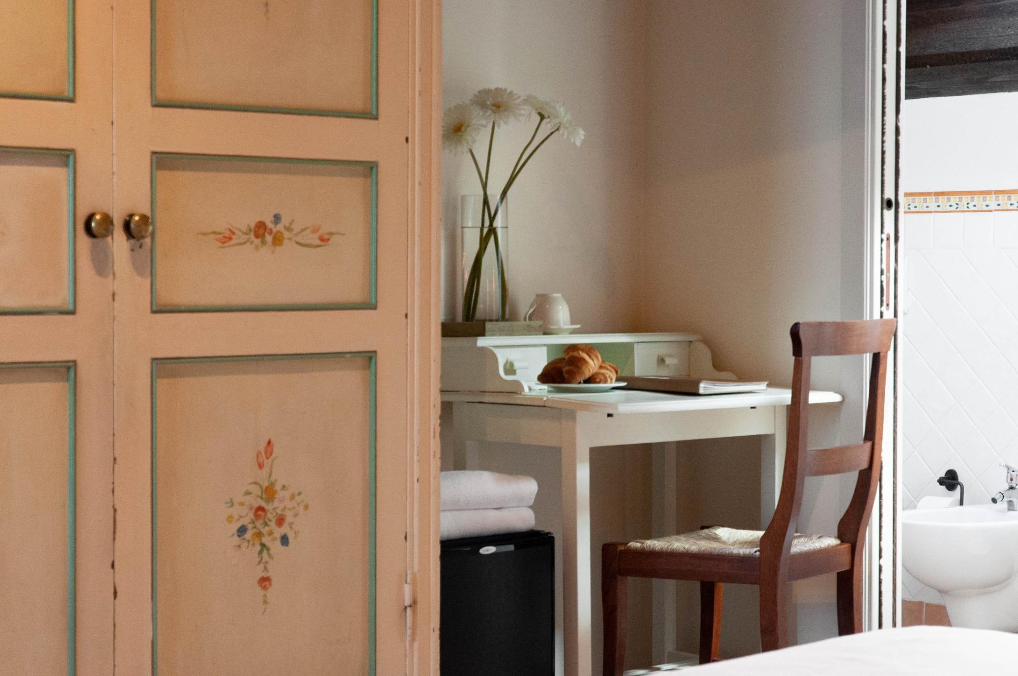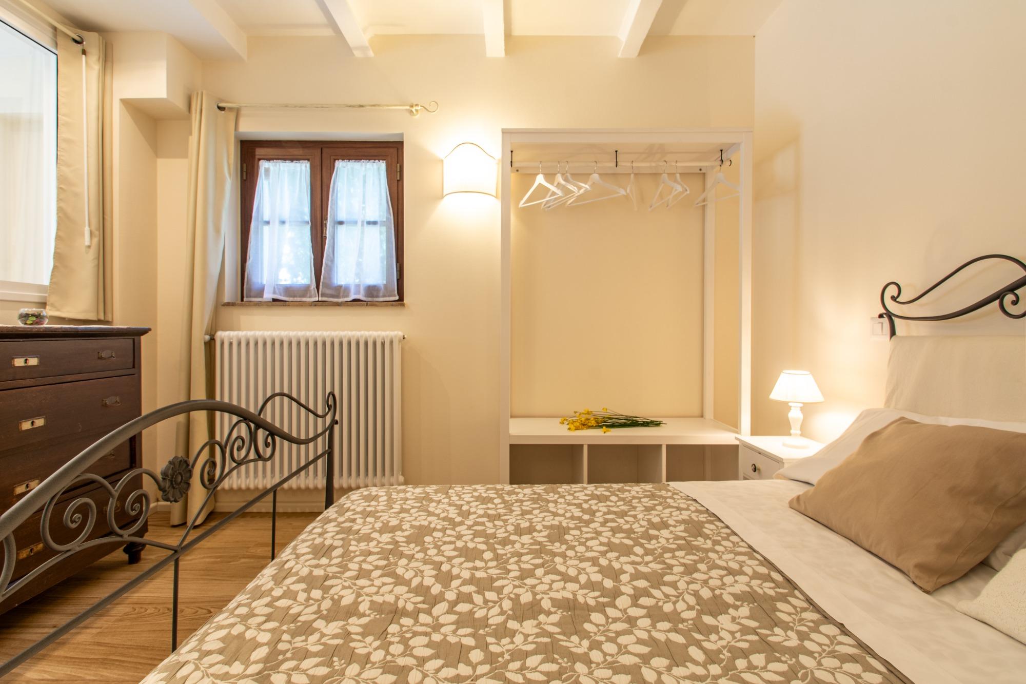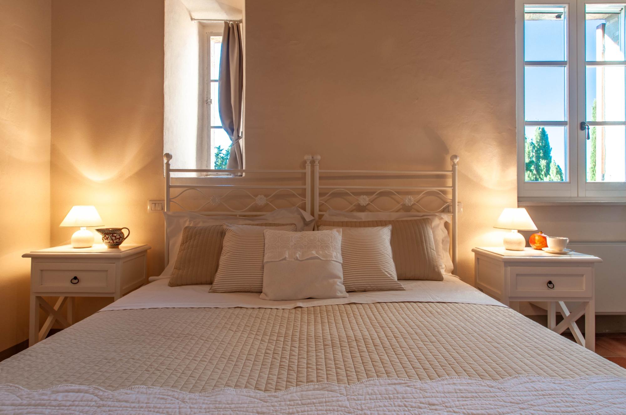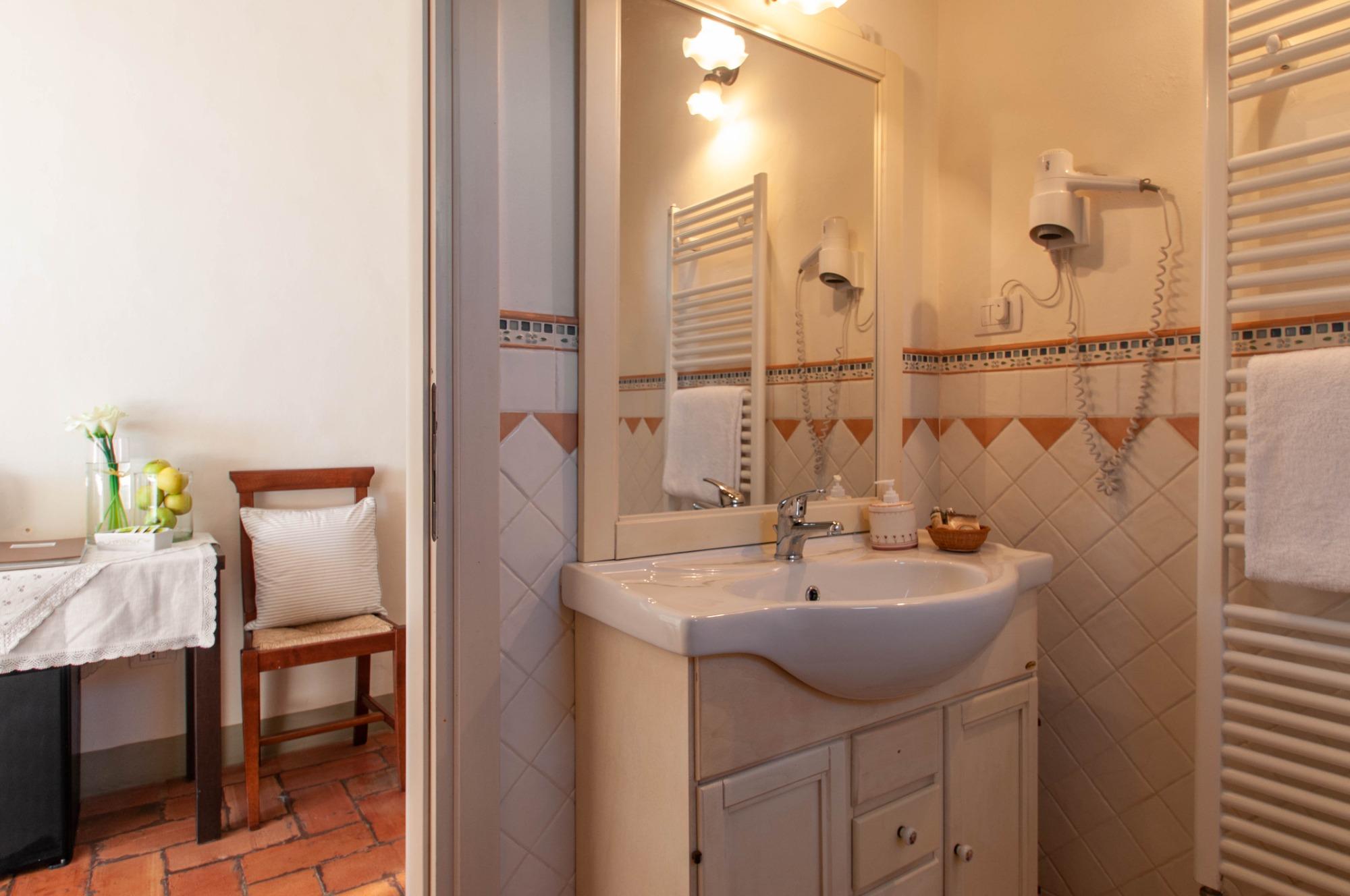 Camera al primo piano con vista panoramica dominante le colline circostanti, antico e comodissimo letto matrimoniale in legno inciso a mano, minibar, bagno con doccia.