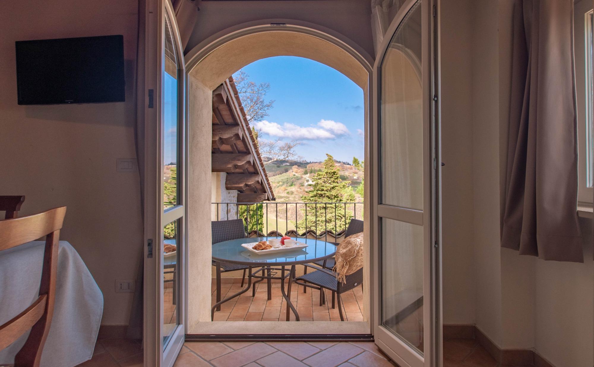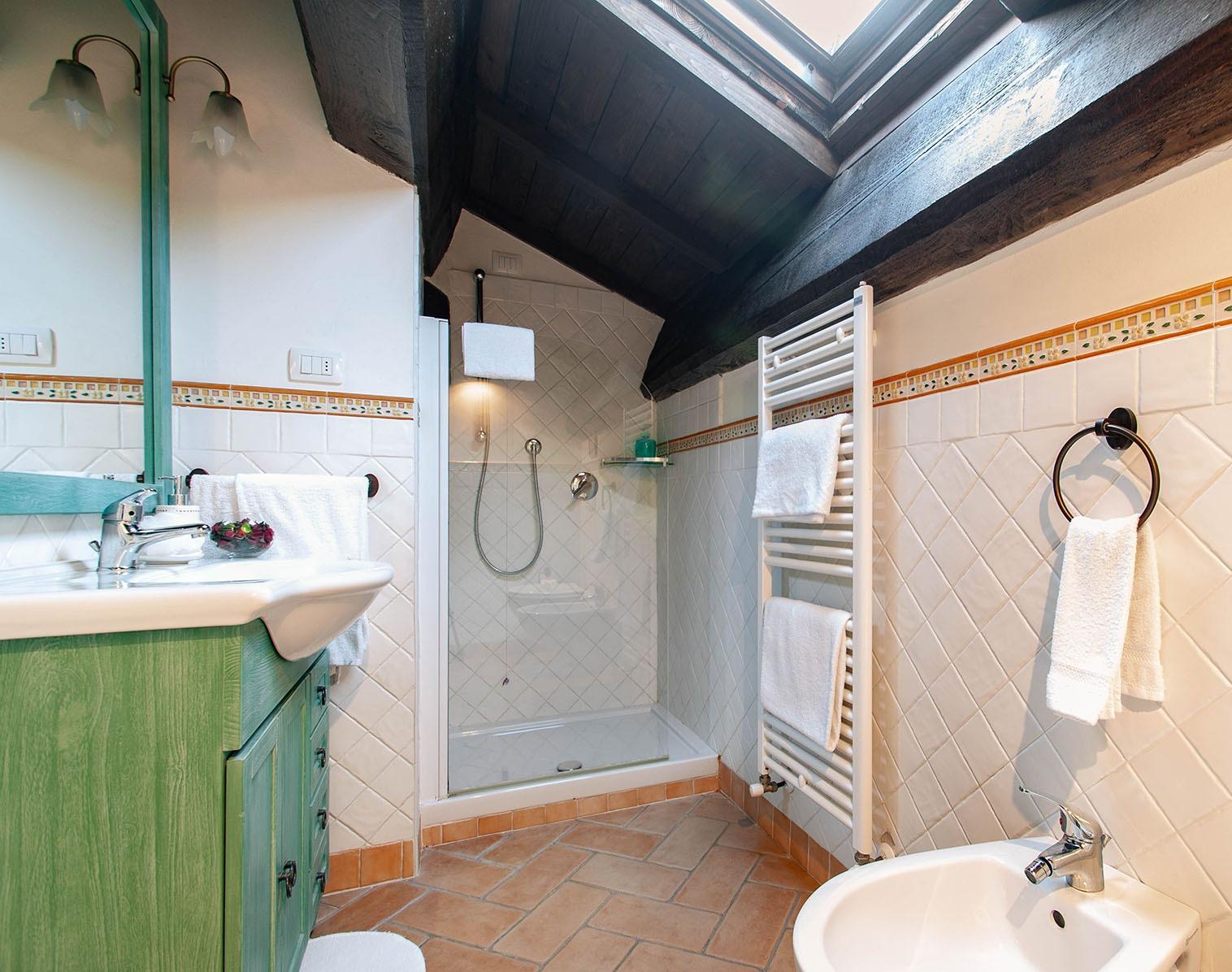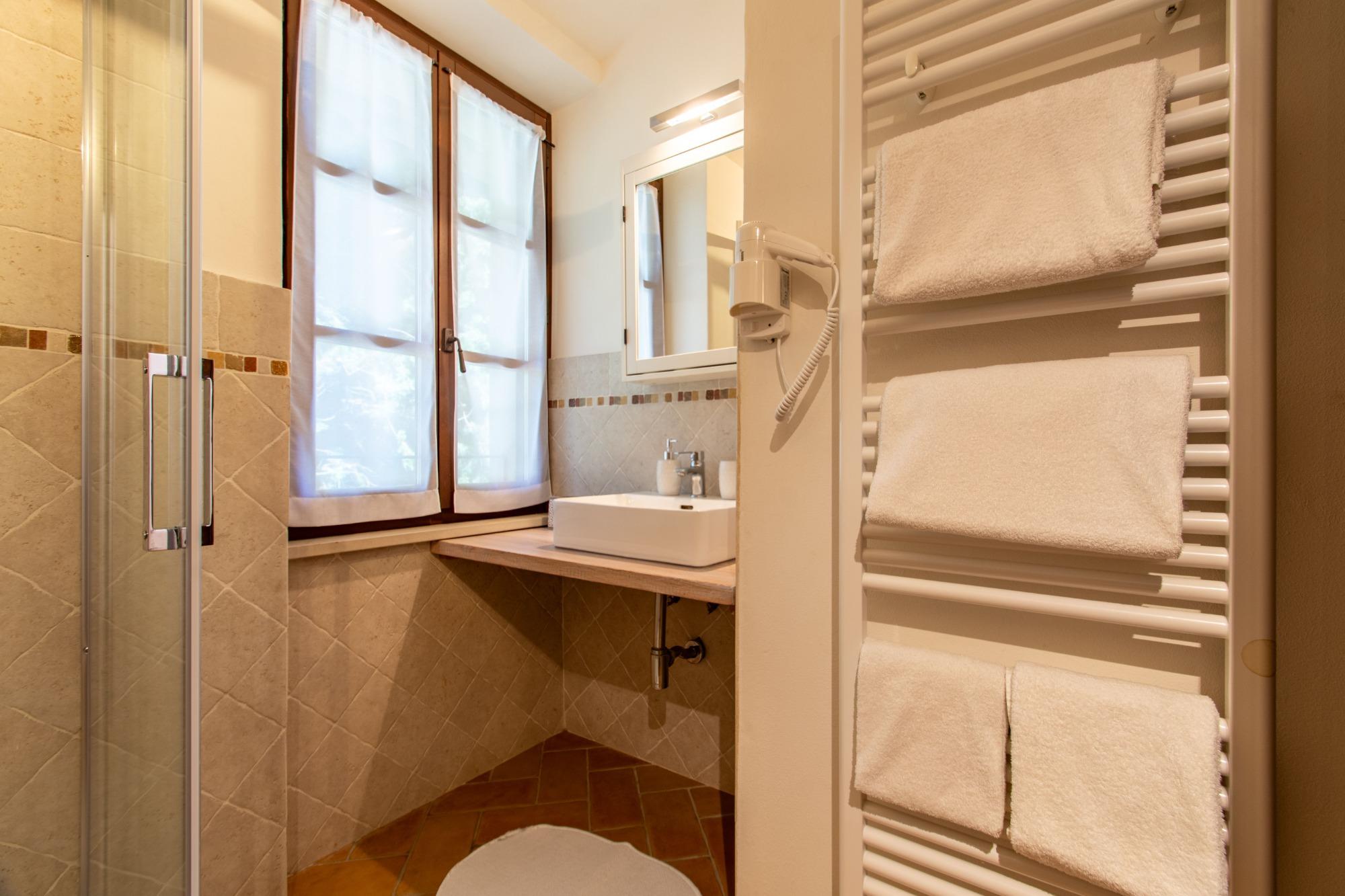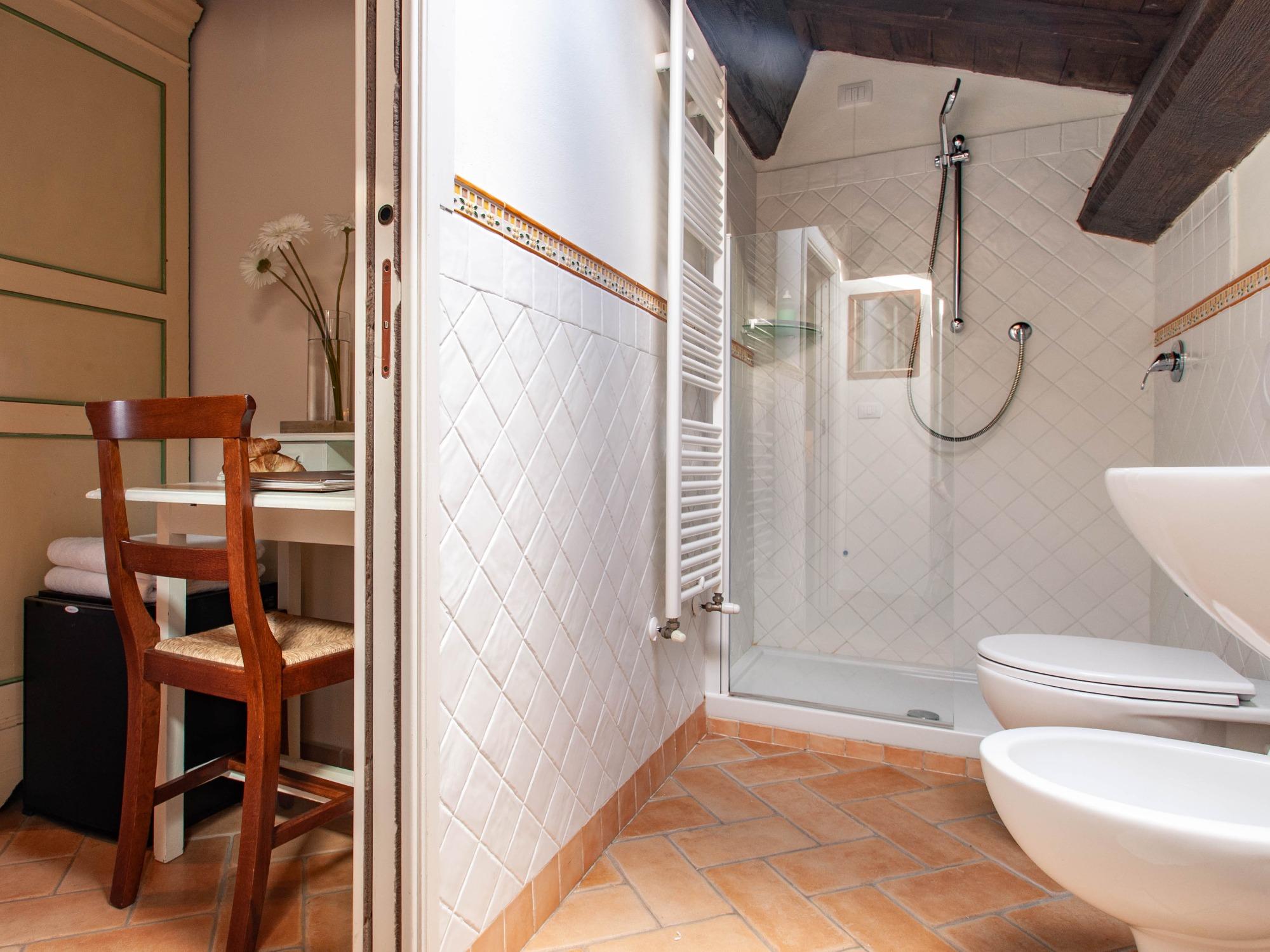 Camera al primo piano con vista panoramica dominante le colline circostanti, antico e comodissimo letto matrimoniale in legno inciso a mano, minibar, bagno con doccia.
