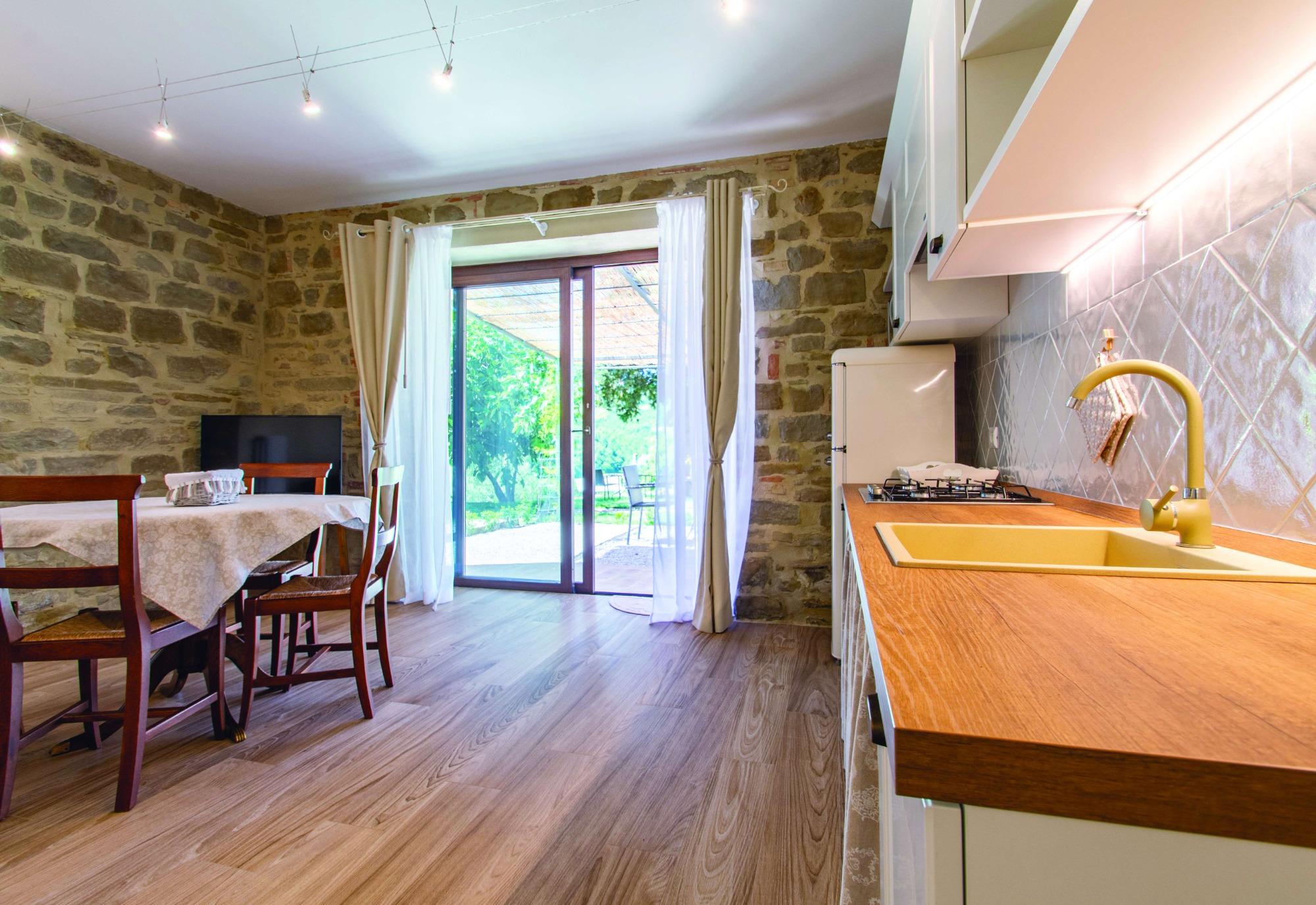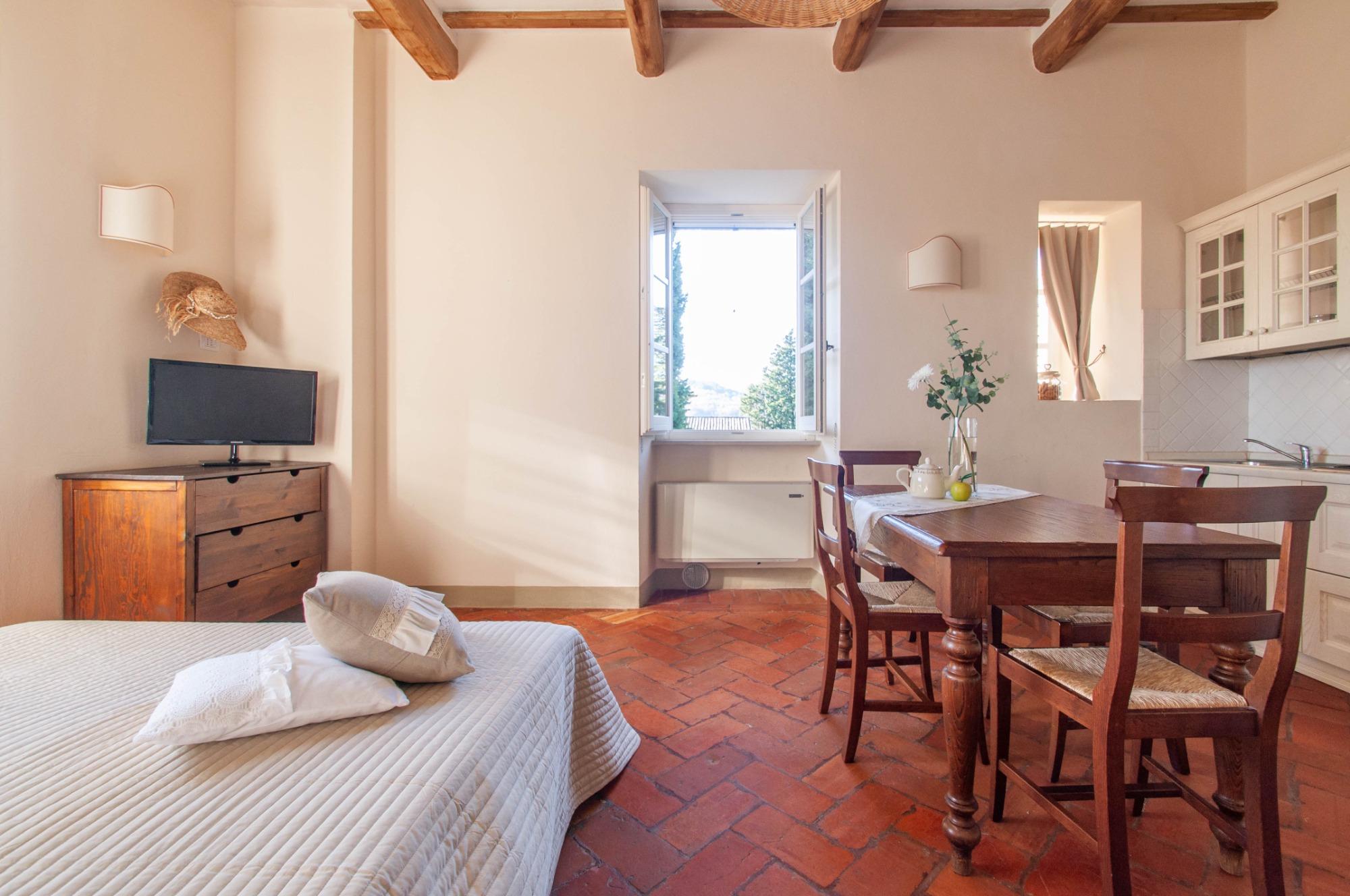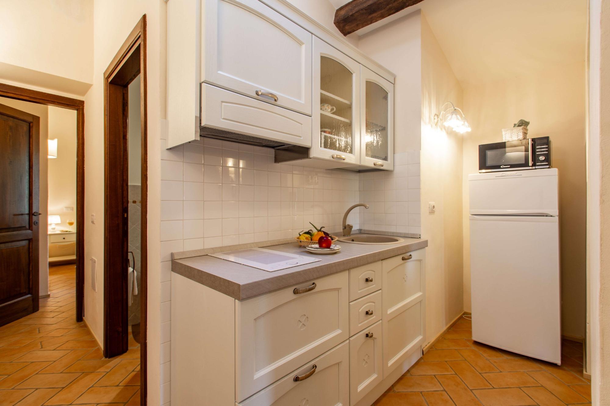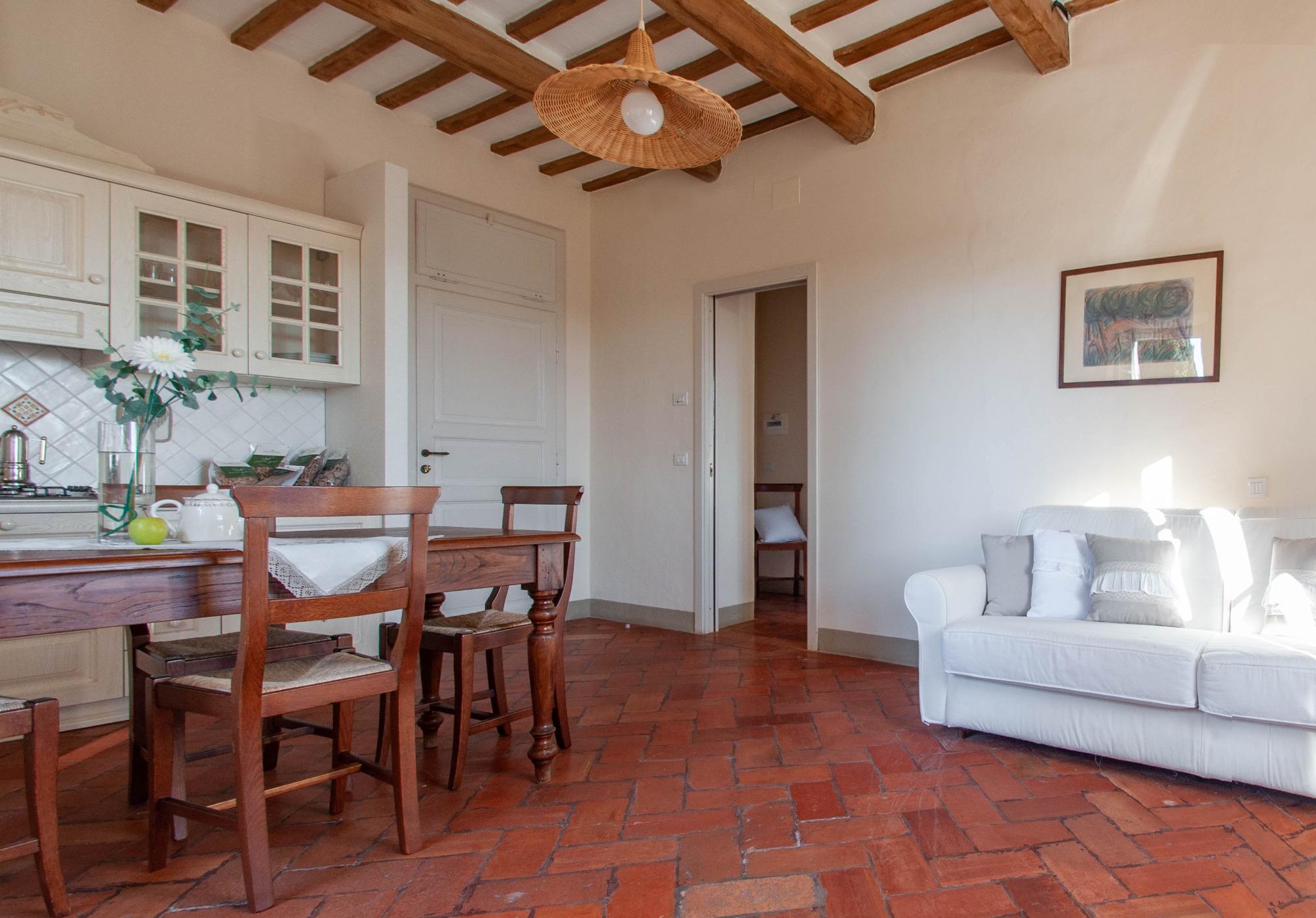 Grazioso bilocale al primo piano, si affaccia sul giardino con vista piscina e colline circostanti offre agli ospiti un soggiorno con ampio camino antico, angolo cottura attrezzato.