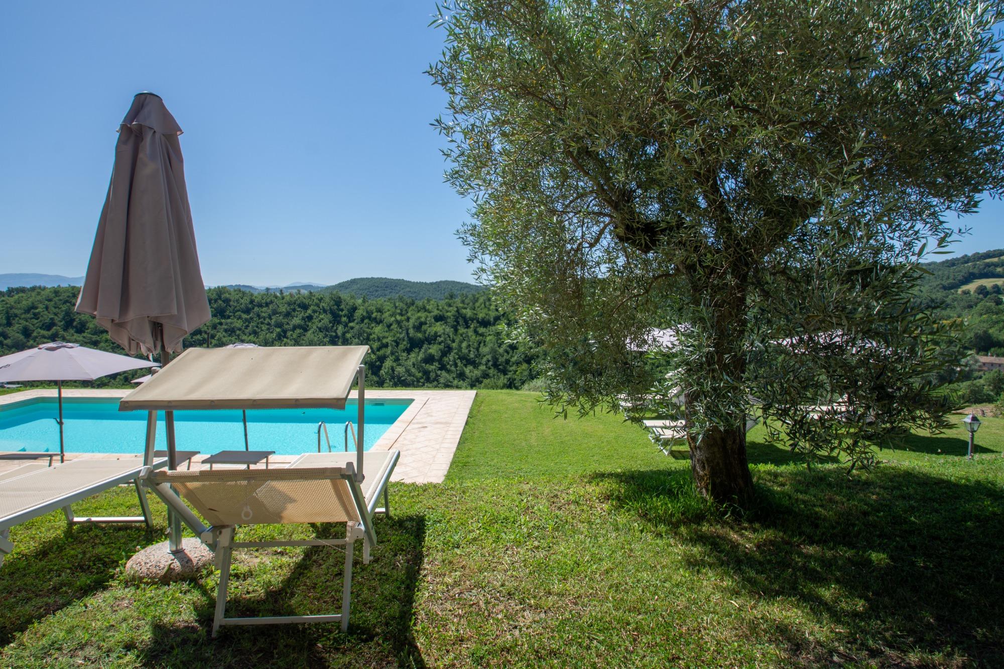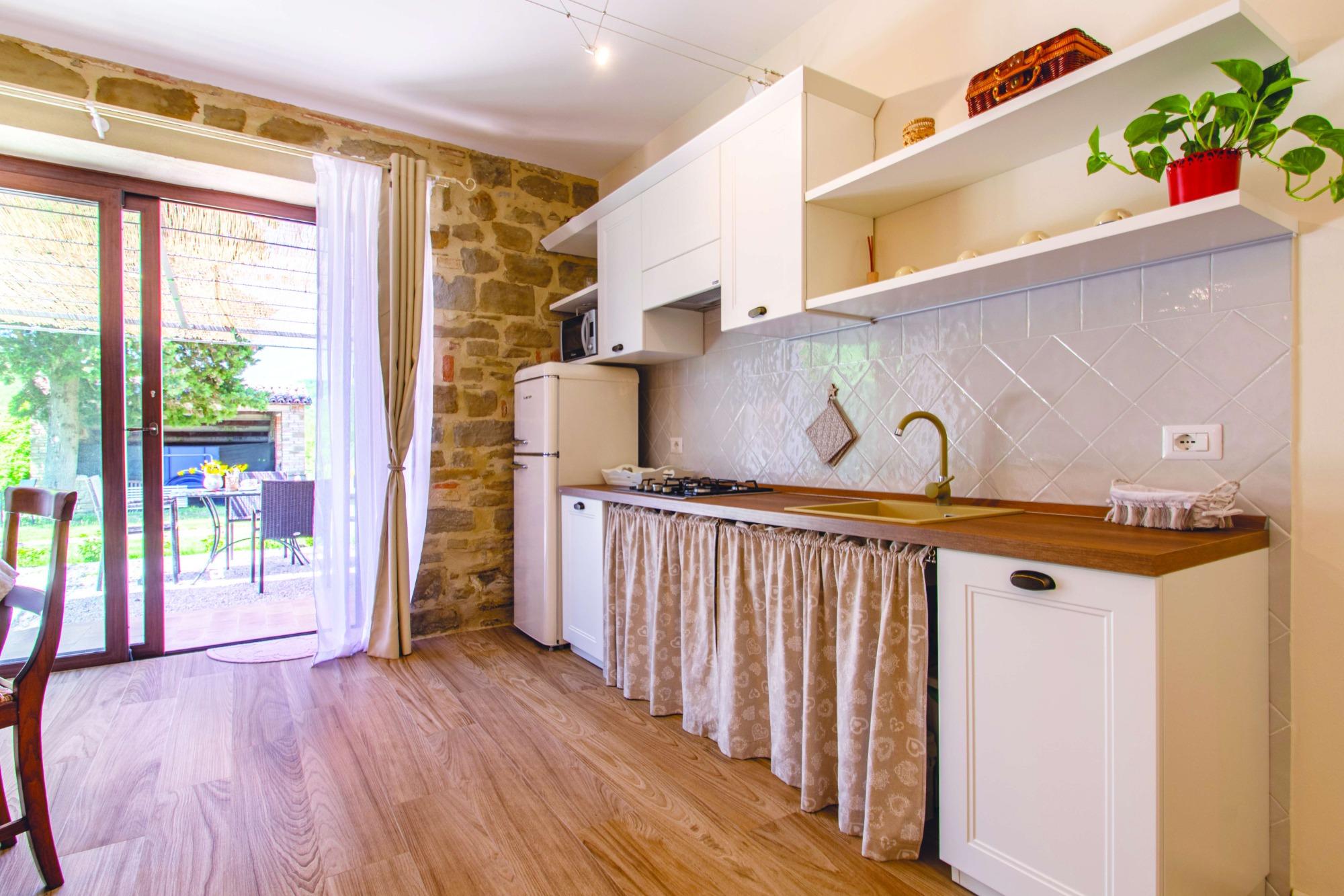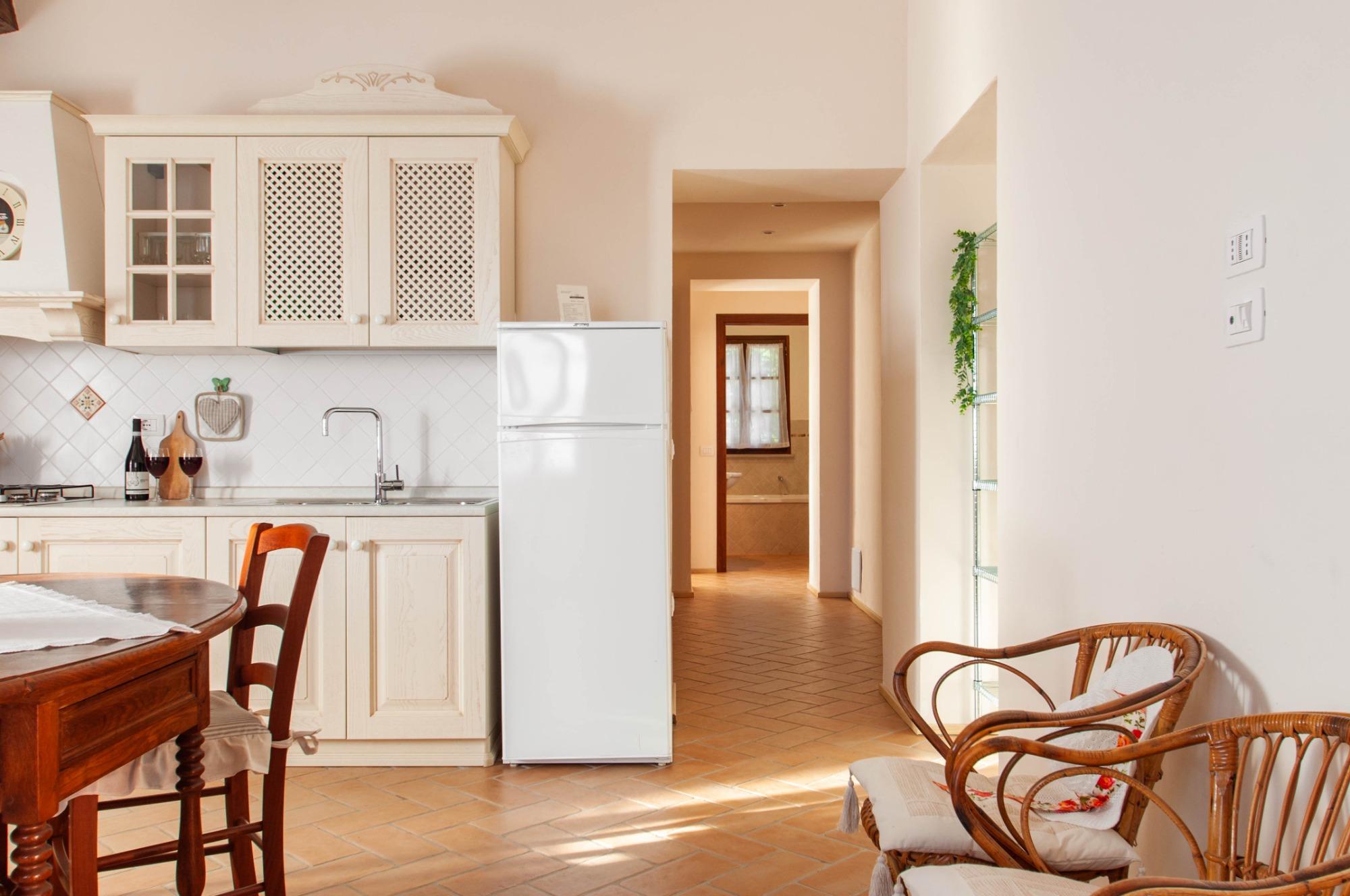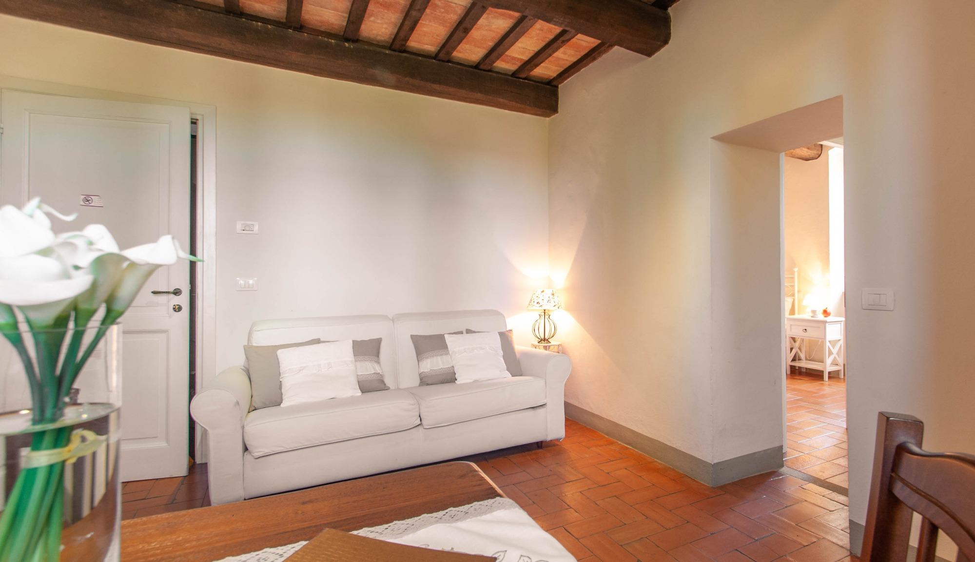 Grazioso bilocale al primo piano, si affaccia sul giardino con vista piscina e colline circostanti offre agli ospiti un soggiorno con ampio camino antico, angolo cottura attrezzato.
