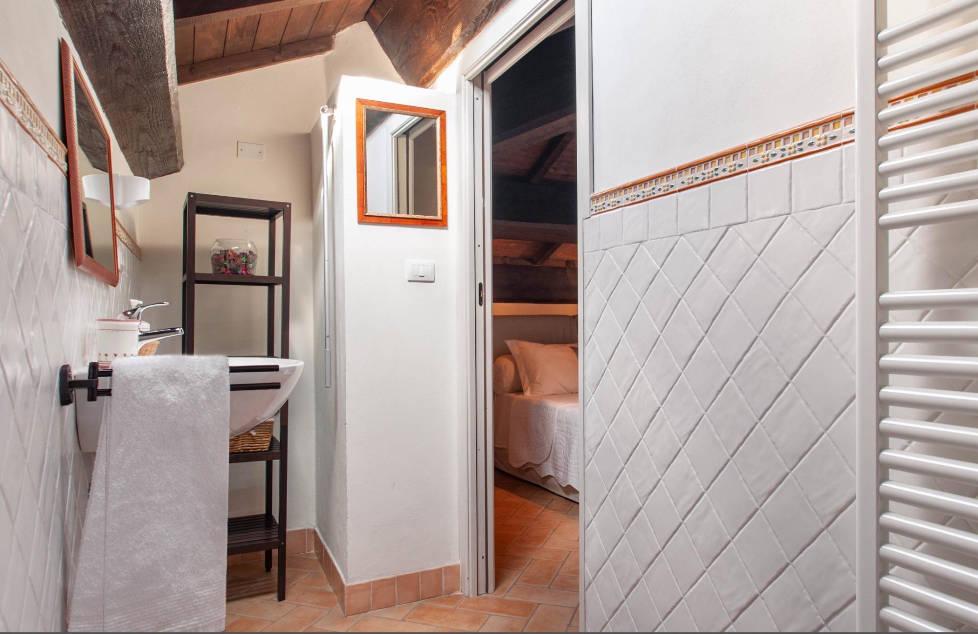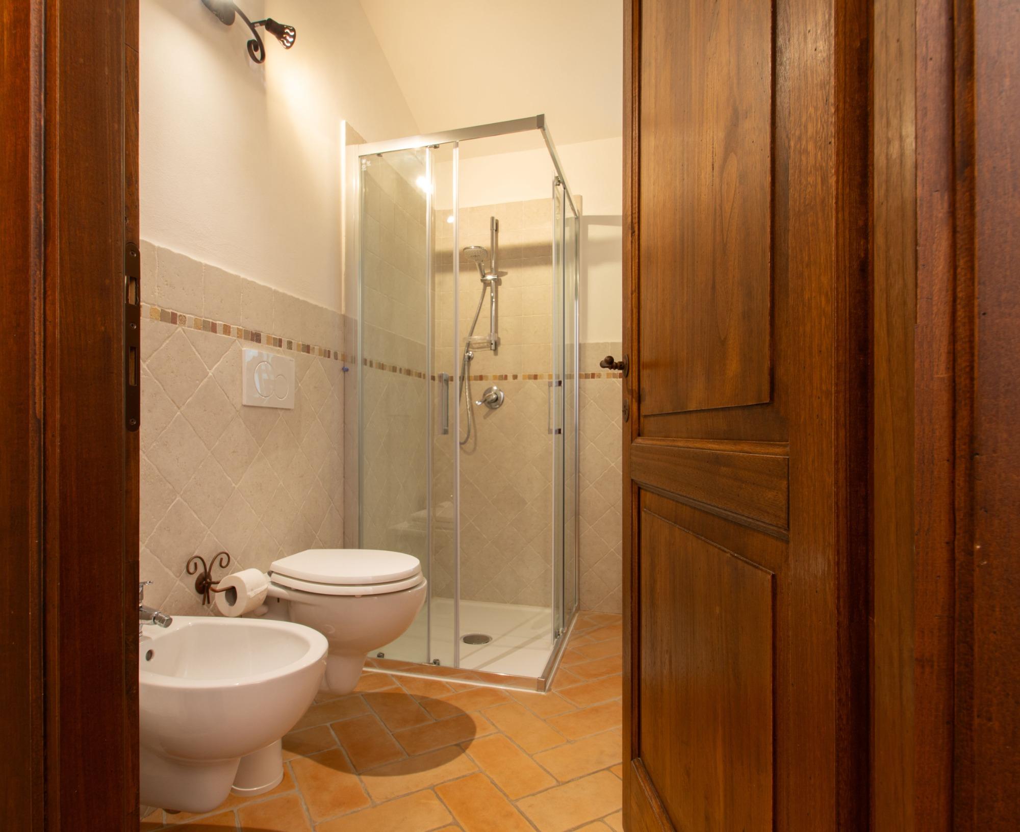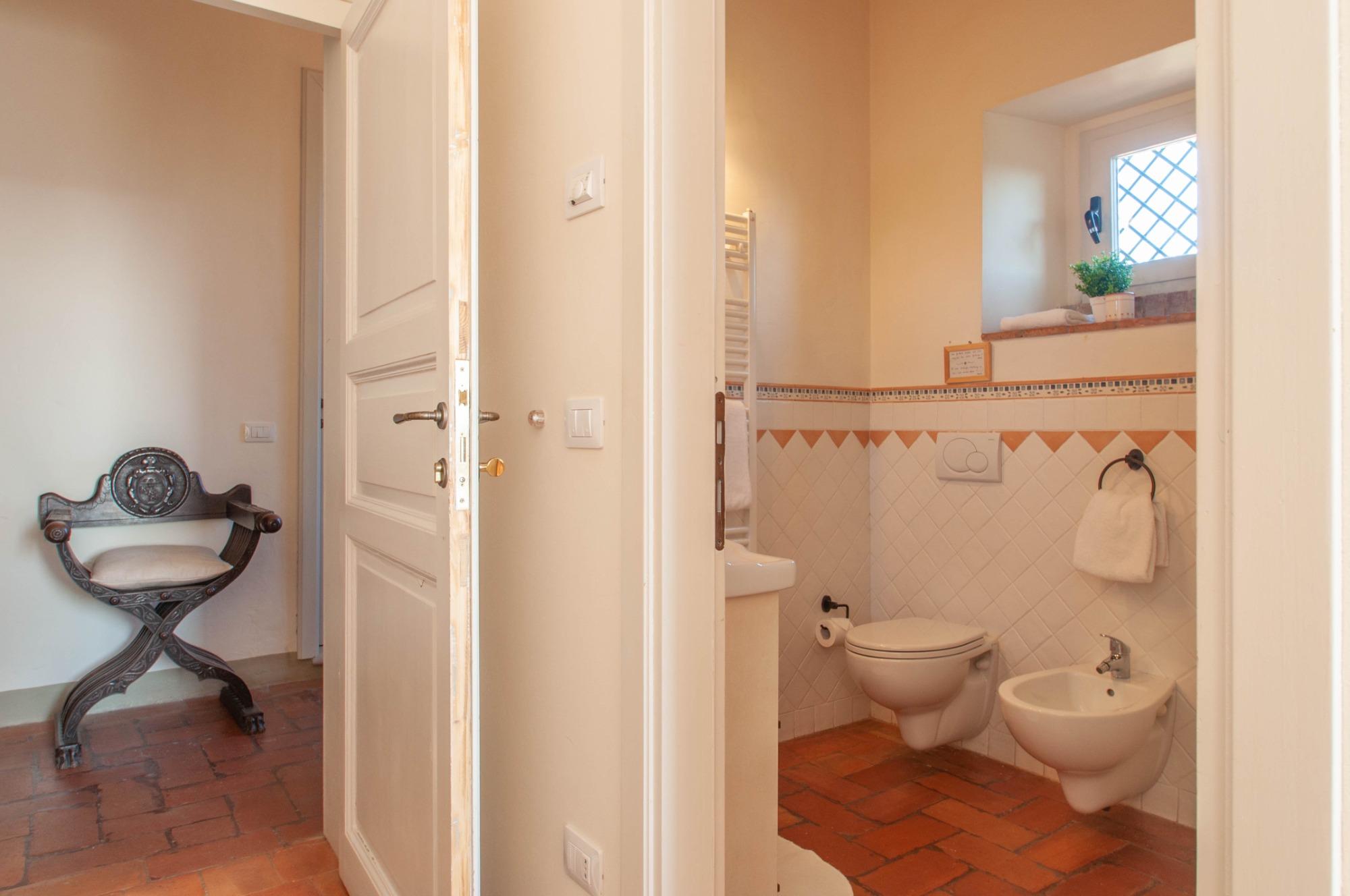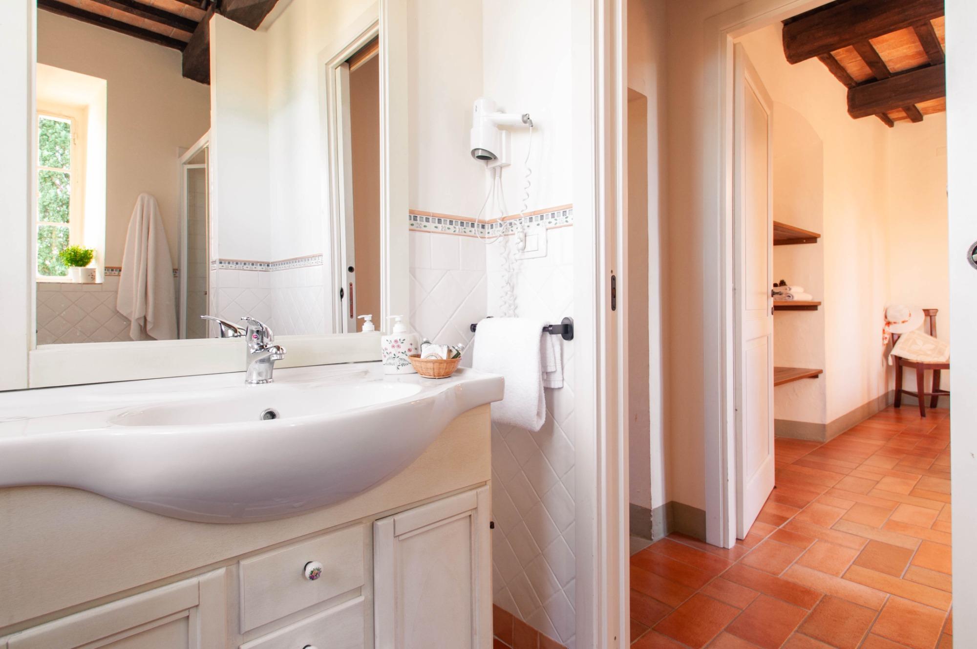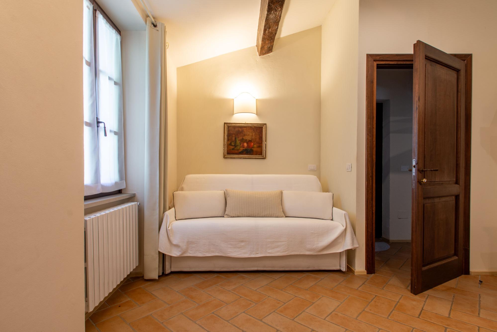 Grazioso bilocale al primo piano, si affaccia sul giardino con vista piscina e colline circostanti offre agli ospiti un soggiorno con ampio camino antico, angolo cottura attrezzato.