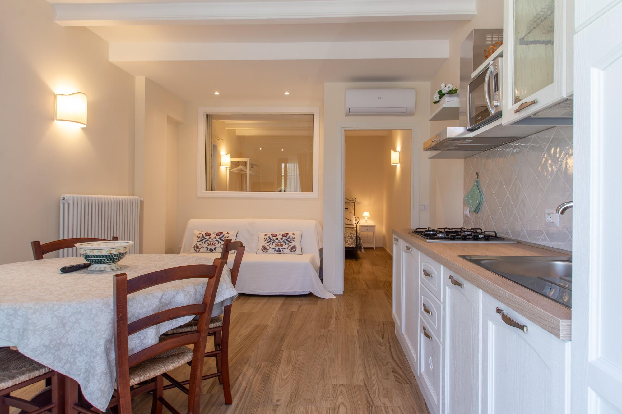 Appartamento bilocale molto luminoso al piano terra, camera con letto matrimoniale. Soggiorno con 2 divani, tavolo e sedie, cucina perfettamente attrezzata.