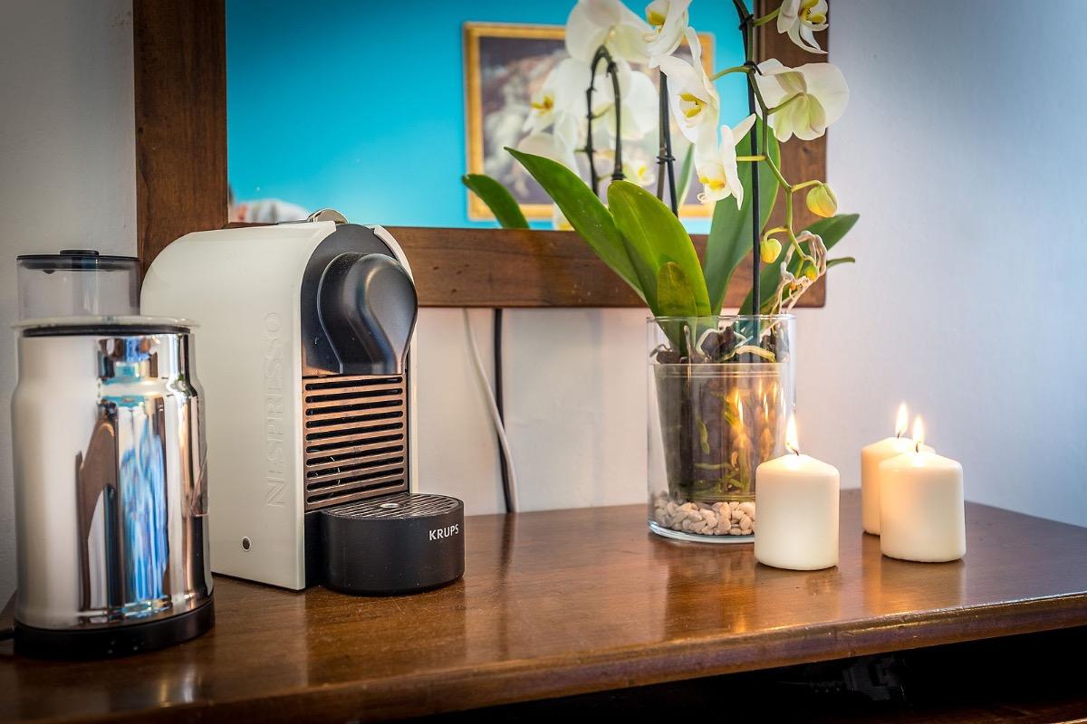 El desayuno se sirve en forma de buffet, con productos frescos tanto dulces como salados, desde las 8:30 hasta las 10:30. Si lo prefiere, también puede solicitar el desayuno en la habitación, equipada con una máquina de café Nespresso y una máquina para preparar cappuccinos.