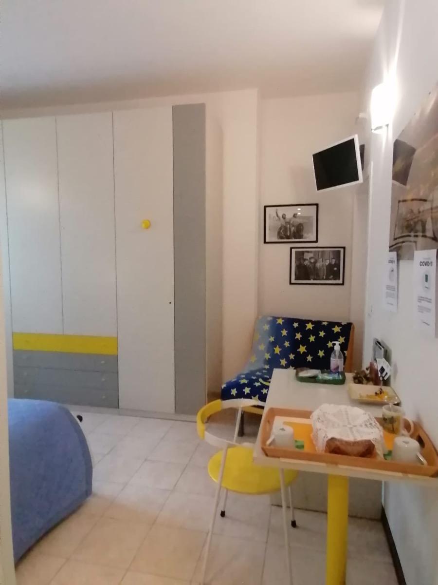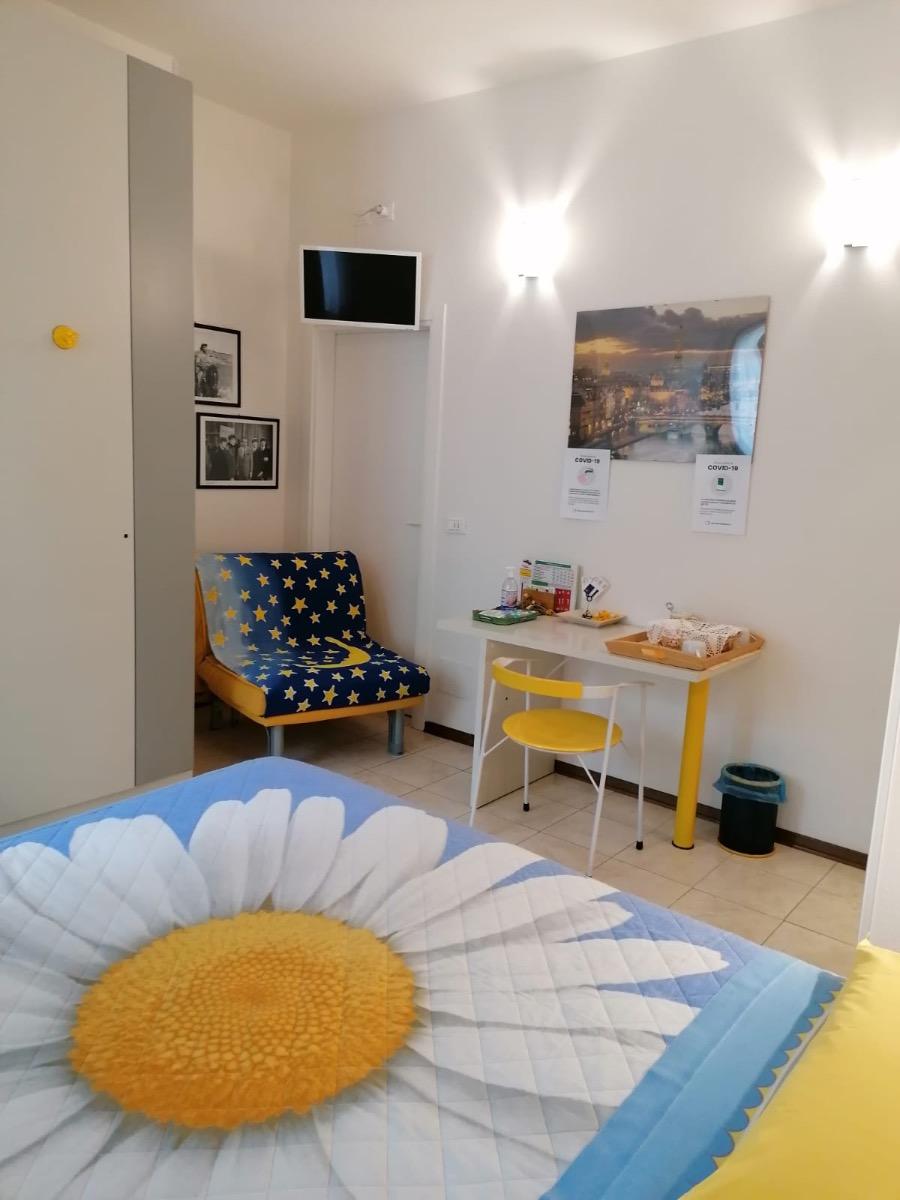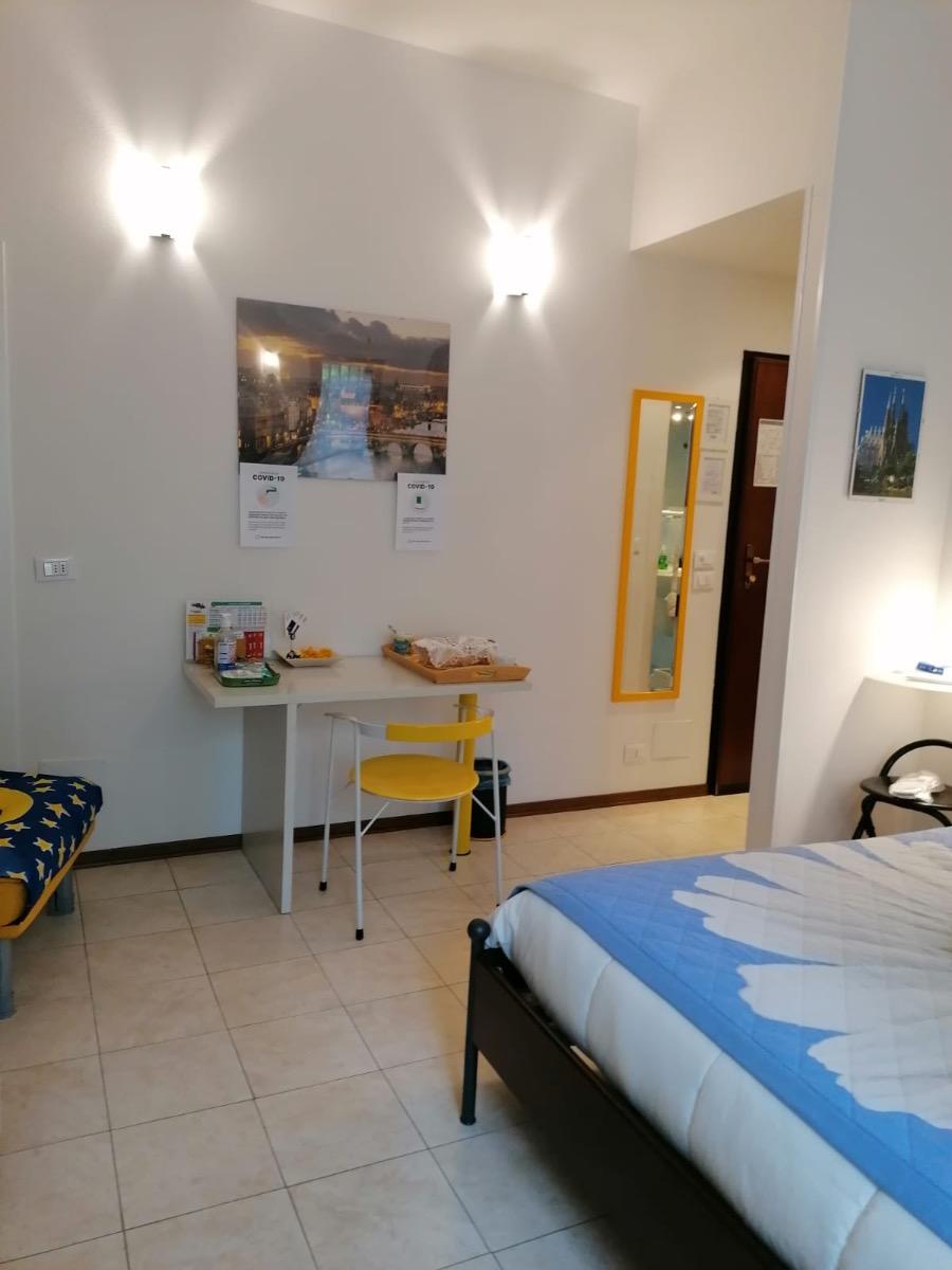 The double room of the Apollo b&b is located on the mezzanine floor and has just been built. It is cozy and comfortable, equipped with a private bathroom with shower, towels, and a hairdryer. The room, 20 square meters in size, is furnished in a classic but modern style and can accommodate one person in single use double, two people in twin beds, or one person in a double bed, as well as three people in a triple with an additional single bed. The room is equipped with a refrigerator, wardrobe, desk, free wi-fi, and TV. The window overlooks the garden at the back of the b&b, ensuring a quiet and relaxing stay.