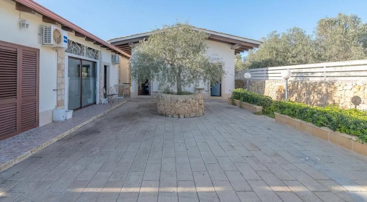 The entire property is fenced and has a parking area. The house is surrounded by a large, beautiful garden and a paved veranda, equipped with umbrellas, sun loungers, and tables.