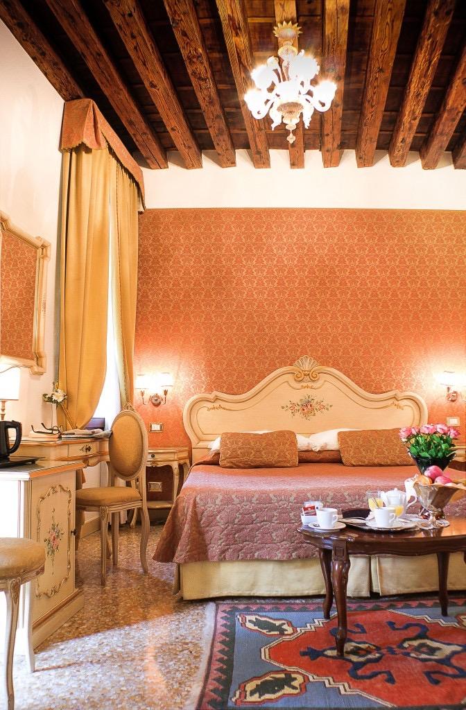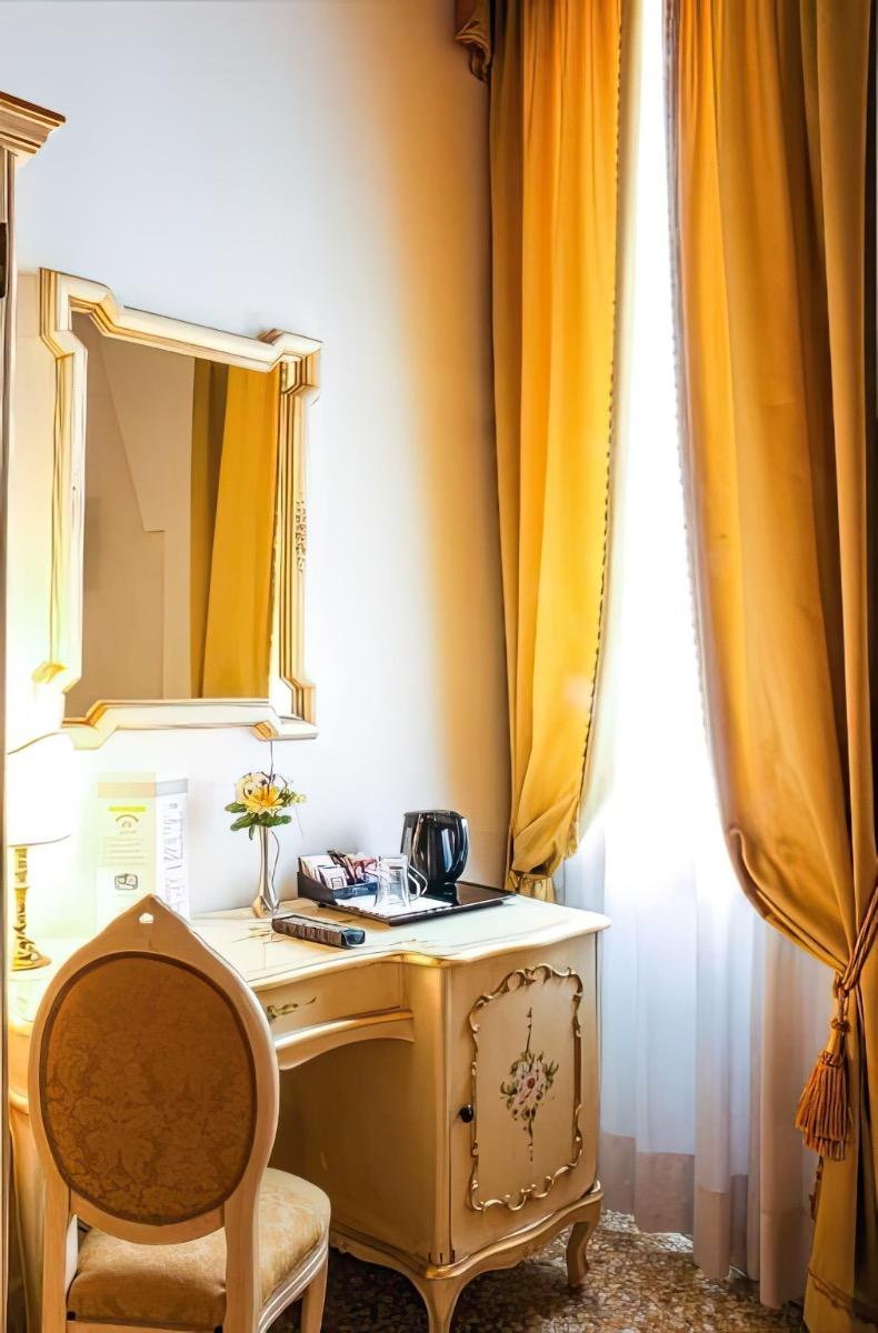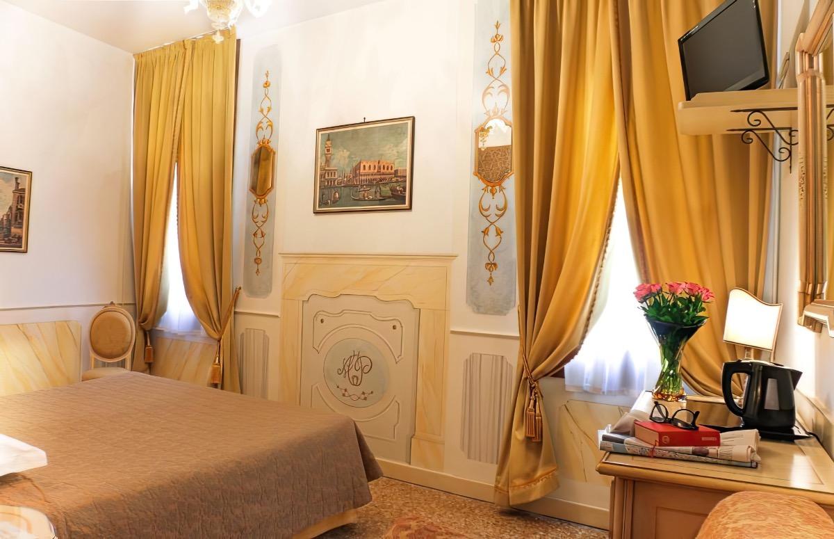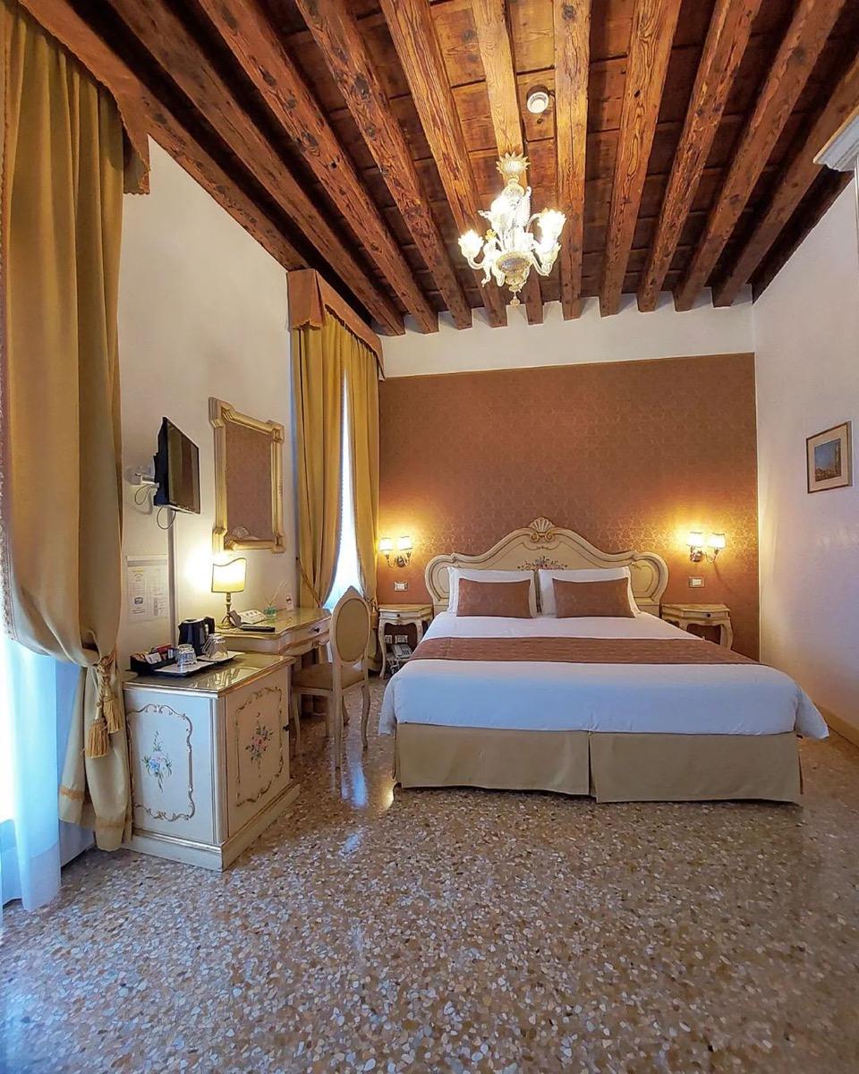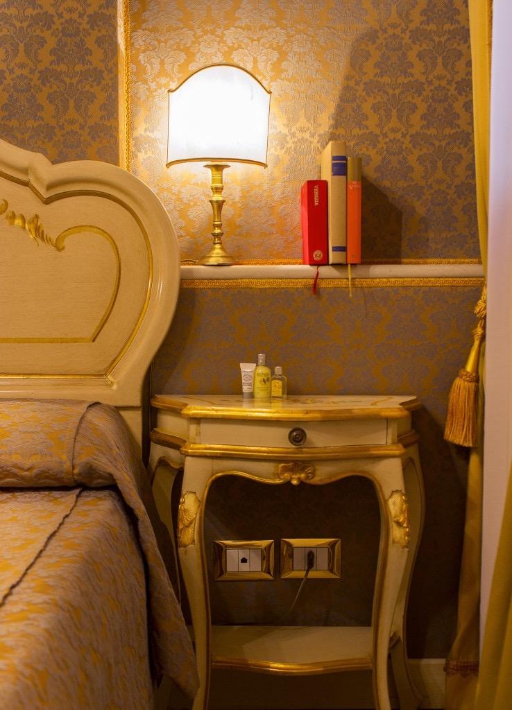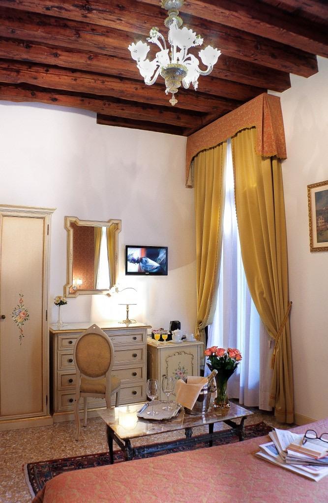Todas las habitaciones están equipadas con TV-LED satelital, aire acondicionado con termostato, teléfono directo, conexión a internet WI-FI, caja fuerte, minibar, tetera con selección de té y café gratis, baño privado en mosaico con bañera y ducha y secador de pelo. El mobiliario, cuidado en los detalles, con muebles de estilo, telas preciosas, lámparas de vidrio de Murano, pisos de mosaico veneciano y las obras de algunos de los artesanos más importantes de la ciudad crean la atmósfera mágica de una antigua Venecia.