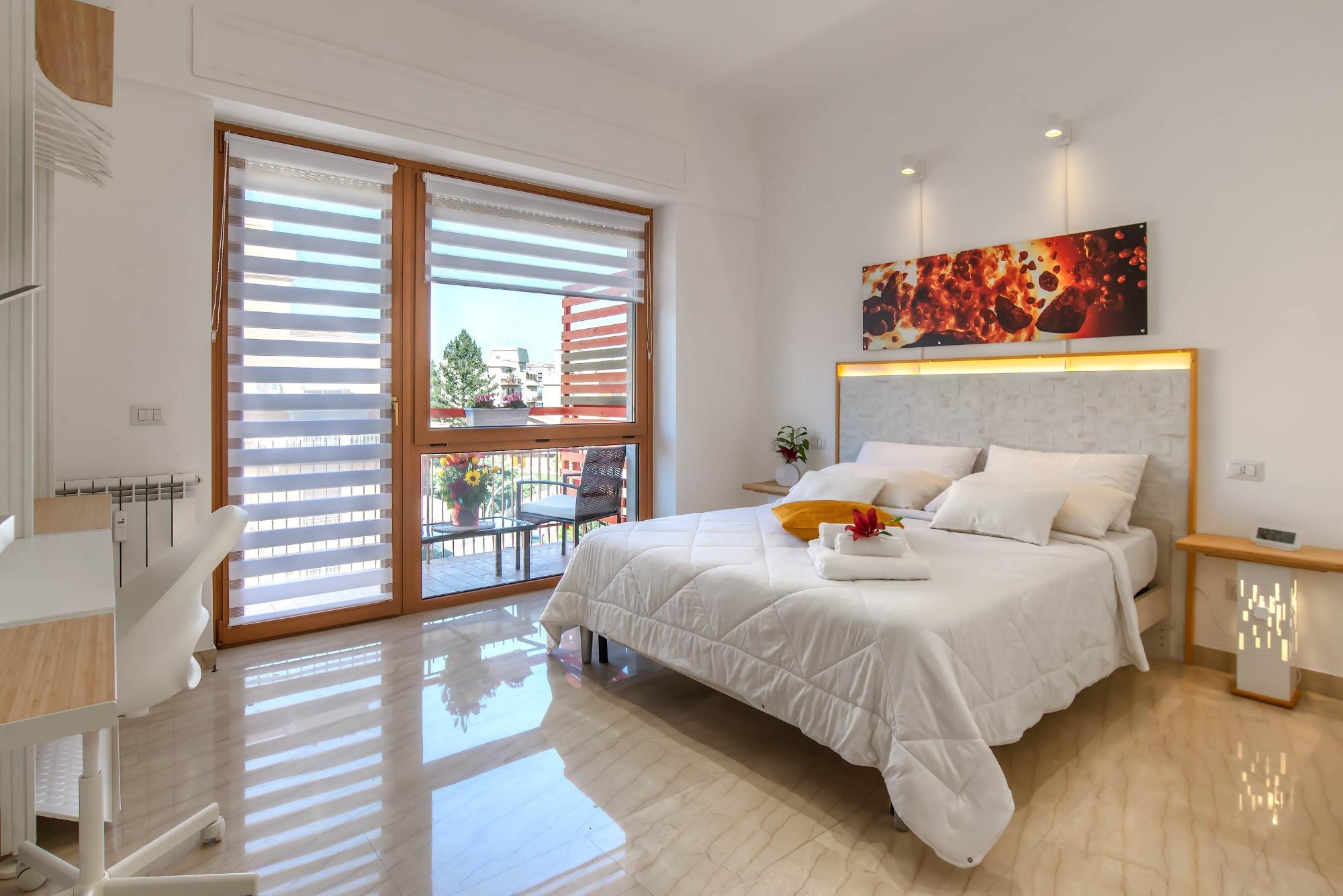 L’Appartamento Sole, anch’esso al terzo piano con ascensore, offre una metratura più ampia di circa 100 metri quadrati ed è ideale per famiglie o piccoli gruppi fino a cinque ospiti. Gli ambienti comprendono due camere matrimoniali, una luminosa zona pranzo, un salone con divano, una cucina attrezzata, due bagni con doccia e un terrazzo, garantendo spazi ben distribuiti e un elevato livello di comfort per un soggiorno rilassante e organizzato.