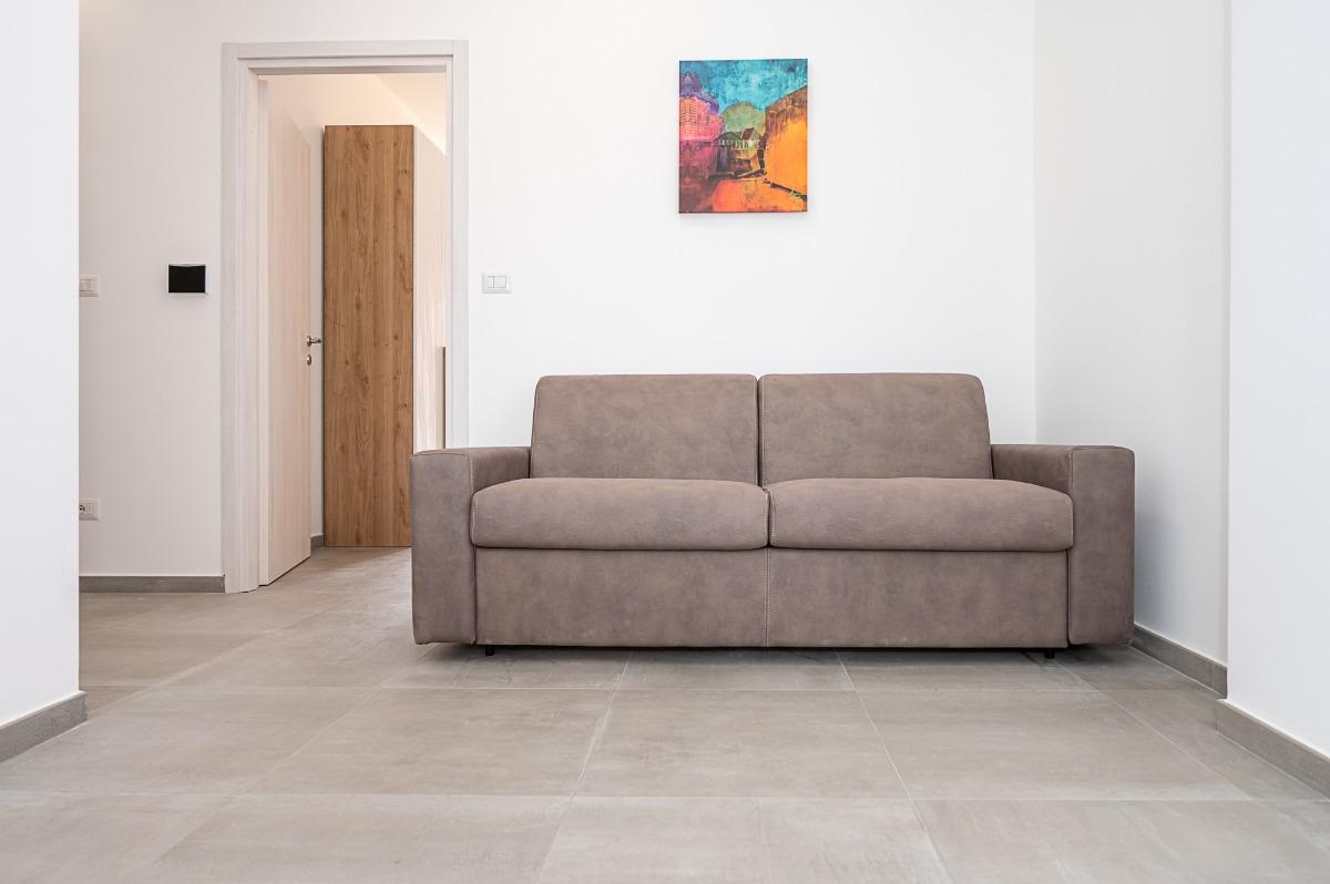 Dal corridoio si accede al soggiorno, luminoso e accogliente, arredato con un comodo divano letto, condizionatore, tavolo da pranzo che può essere utilizzato anche per lavorare in smart working, e una cucina completa di frigorifero, freezer, lavastoviglie, forno, piatti, bicchieri, bicchieri da vino, moka per il caffè, set di olio, sale, aceto, zucchero, caffè e tutti gli utensili necessari per cucinare.