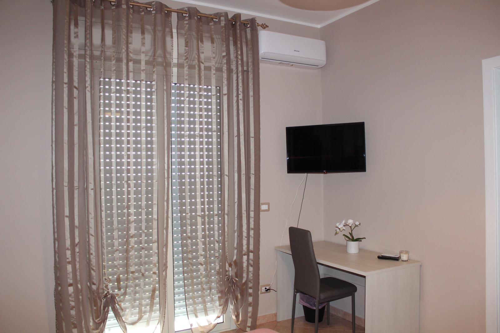 Double bedroom with sea view, spacious and bright, equipped with a 32-inch TV, desk, wardrobe, air conditioning, heating, and balcony. The private bathroom inside the room is very spacious, equipped with a shower, bidet, hairdryer, and toiletries.