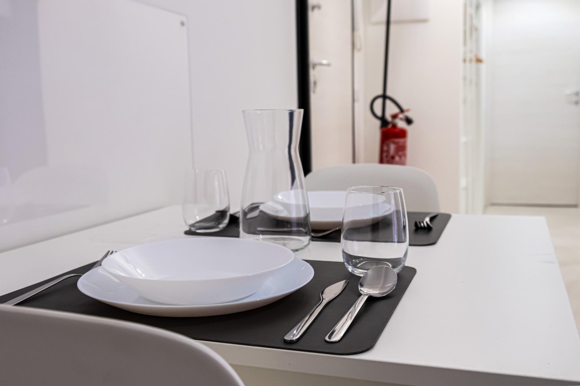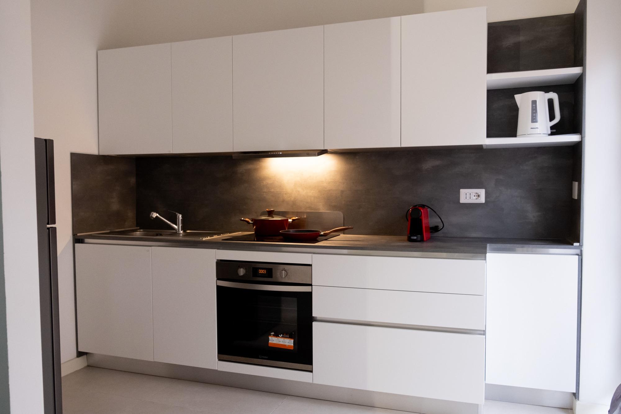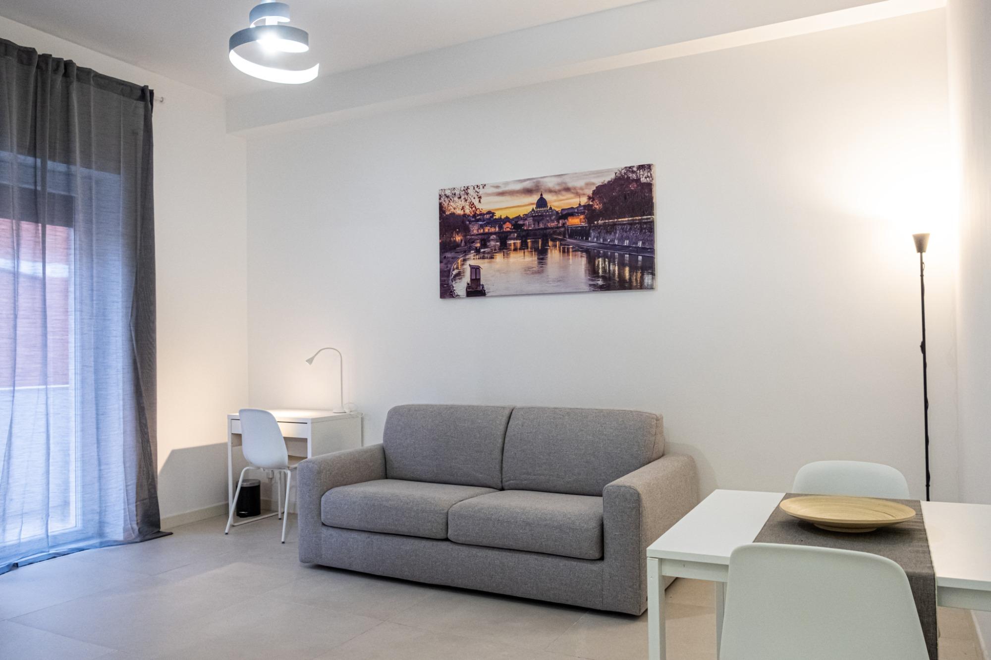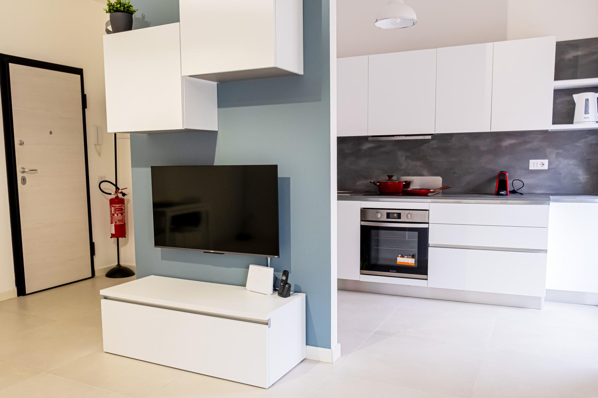 Il salone è arredato con cura e ospita un comodo divano letto matrimoniale, una smart TV da 43 pollici, una scrivania perfetta per chi lavora da remoto e un tavolo da pranzo per due. L’angolo cottura, funzionale e completo di lavastoviglie, si integra perfettamente nello spazio living. Un lungo balcone percorre tutta la lunghezza dell’abitazione, regalando una piacevole apertura verso l’esterno.