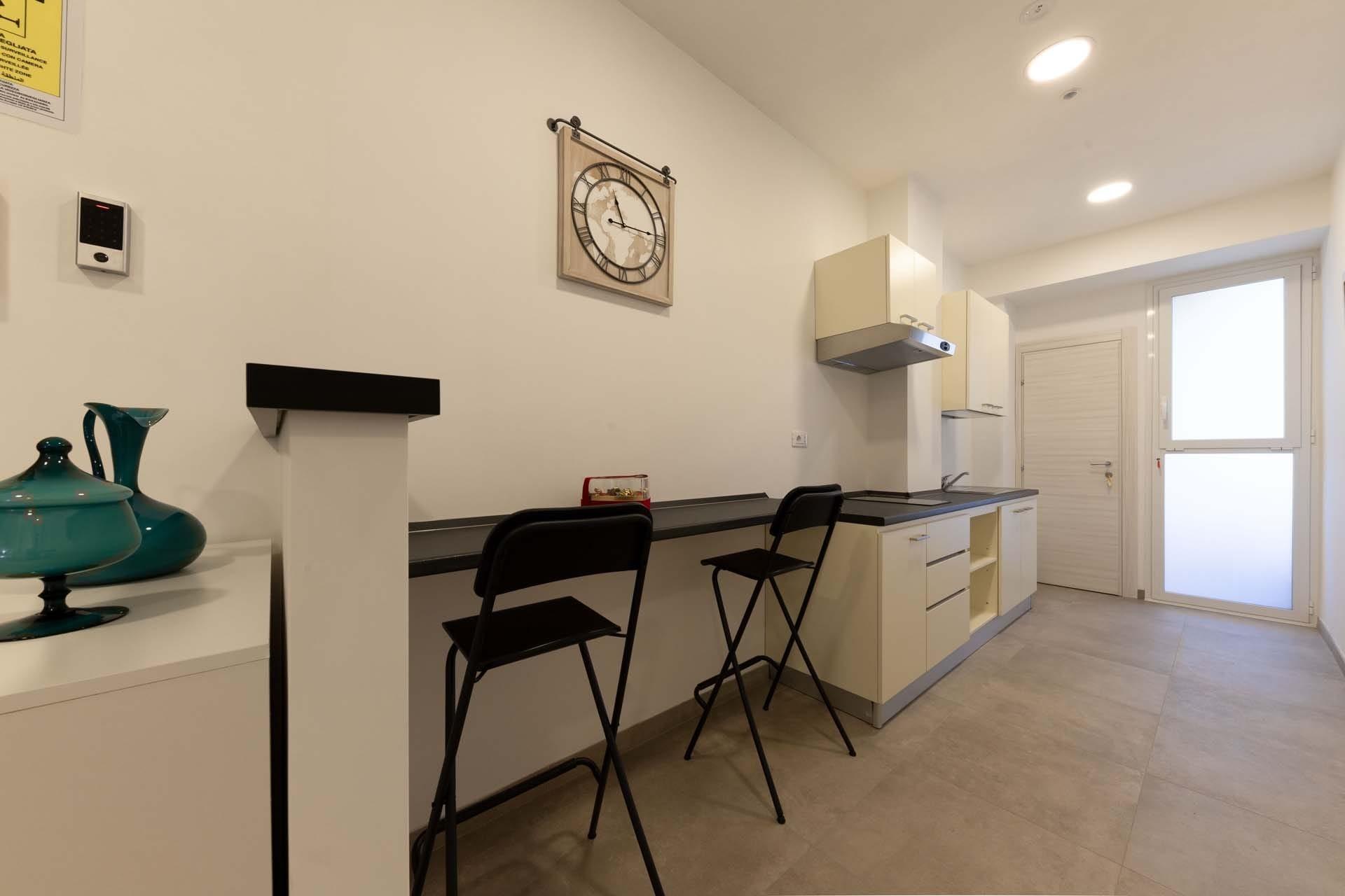 Upon entering, you'll find a cozy lounge area and a fully equipped communal kitchen with an induction cooktop, utensils, and a comfortable seating area with shelves and stools, all bathed in natural light. This area is under video surveillance while respecting privacy, offering an additional layer of security.