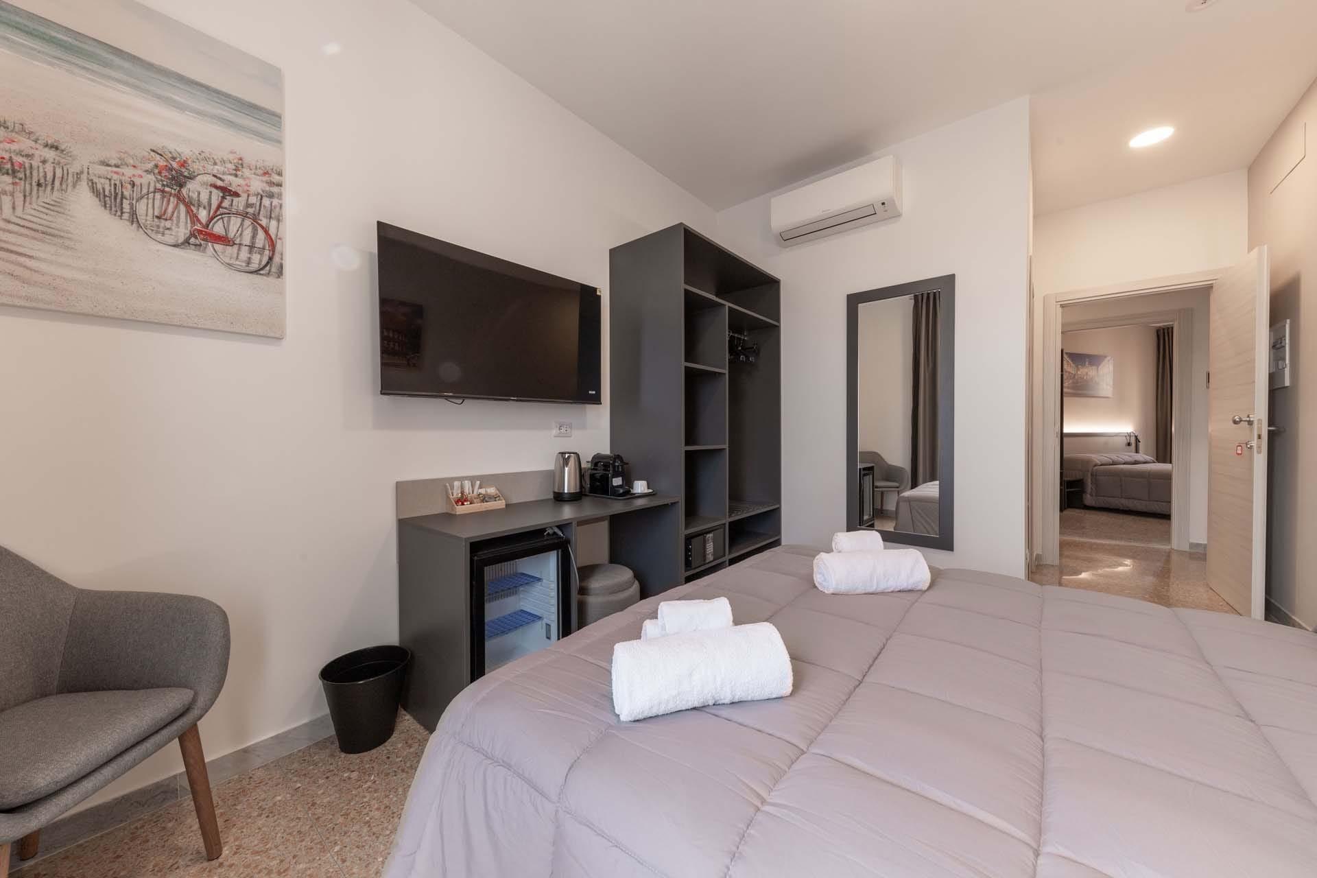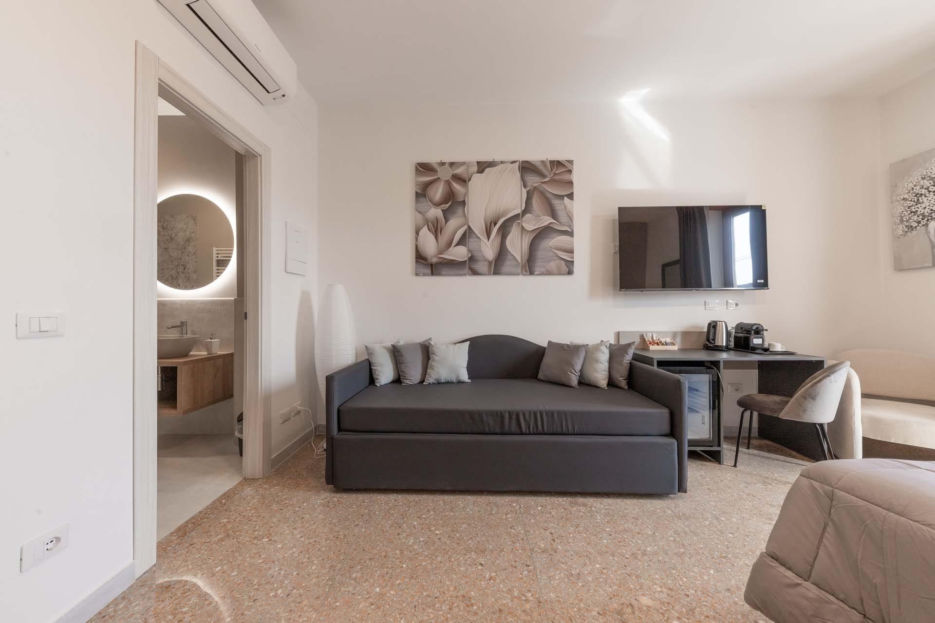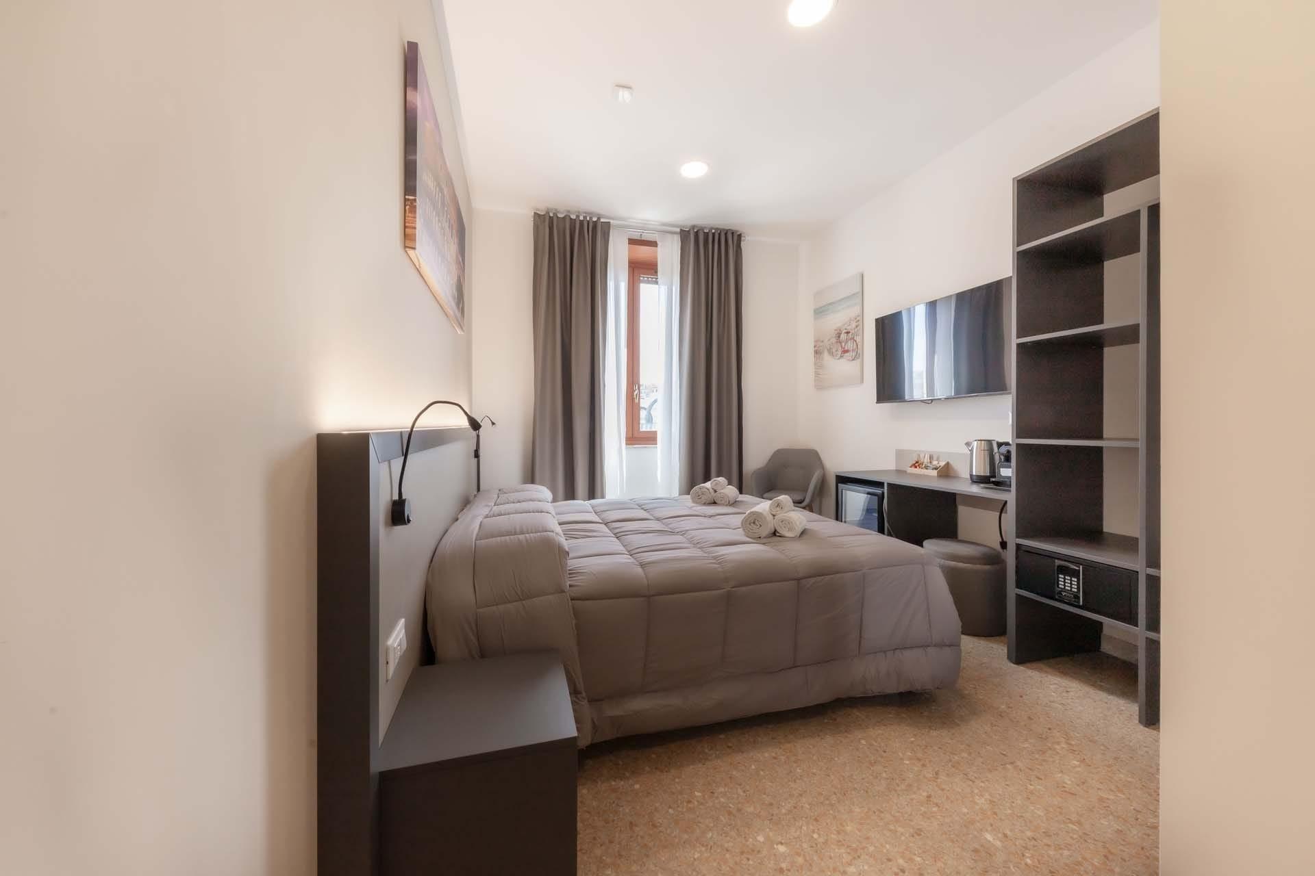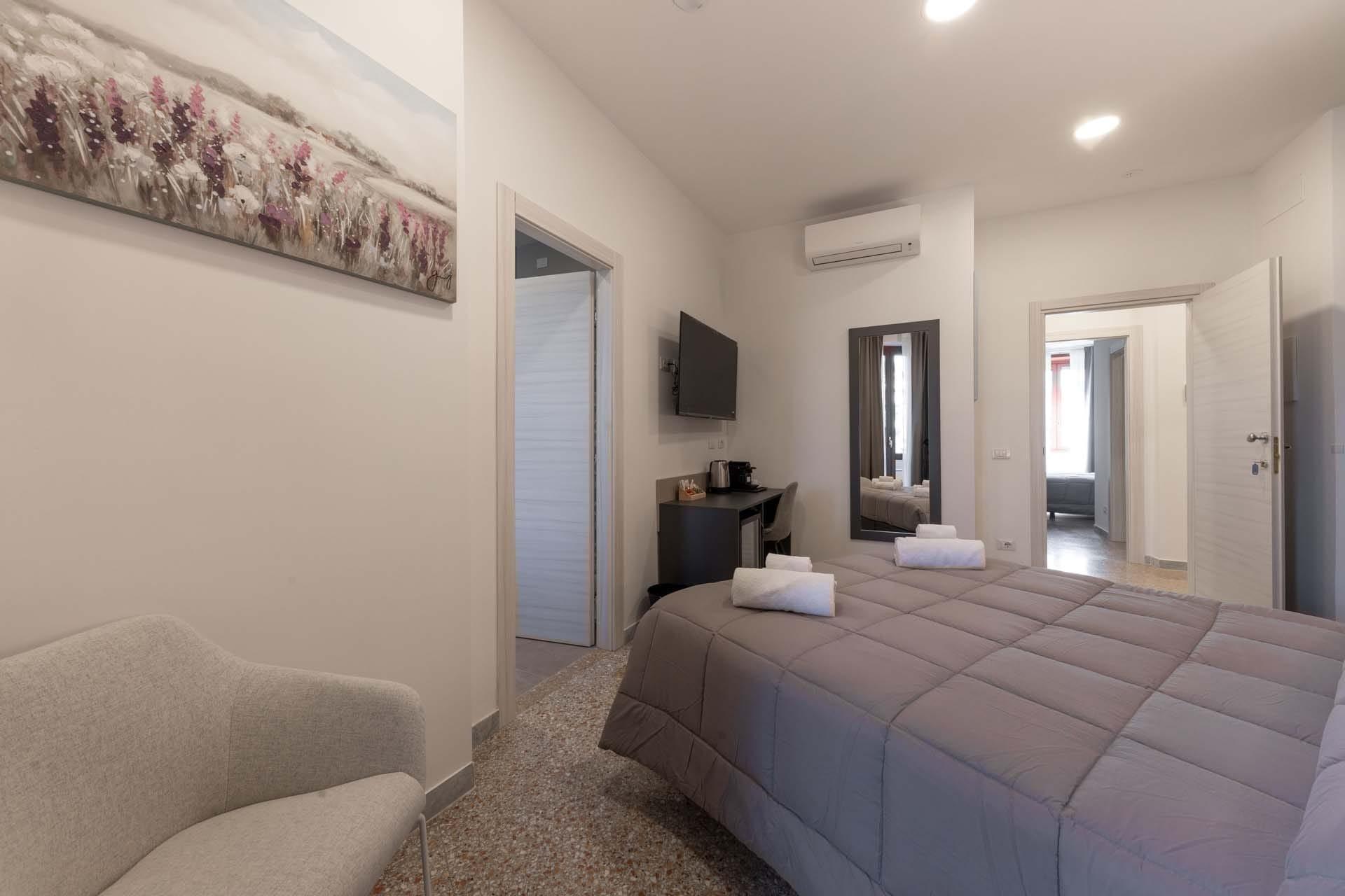 Very large room of 26 square meters with double bed, if necessary can be split into single beds on request and a daybed with integrated bed for a total of 3 beds, on request a cot for an infant, large bathroom with walk-in shower 80X160, glass shower box, hairdryer, balcony overlooking the square furnished with table, sunshade and chairs. Air conditioning, smart TV, kettle and Nespresso. free wifi