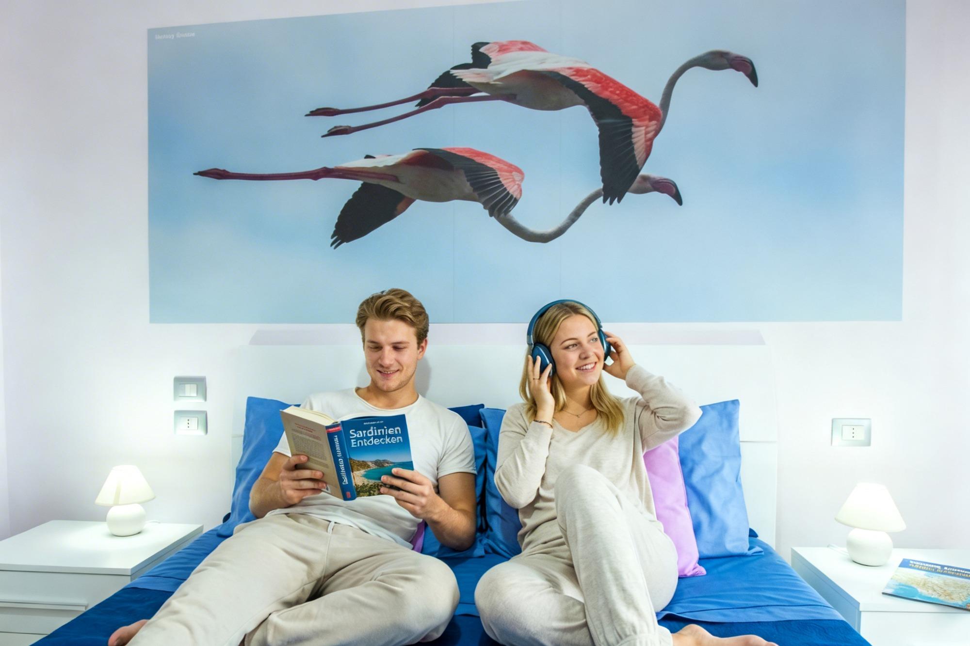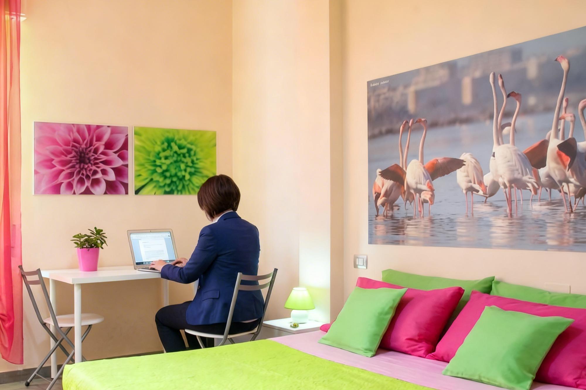 Behind a simple whitewashed oak door, labeled "red room," hides the most romantic room: a large panel with flamingos flying at sunset, warm lights to create a magical atmosphere, and orange curtains. Open them and discover a spacious private terrace, equipped with a table and two chairs, from which you can enjoy a splendid view of the historic neighborhoods, perhaps sipping a sunset aperitif.