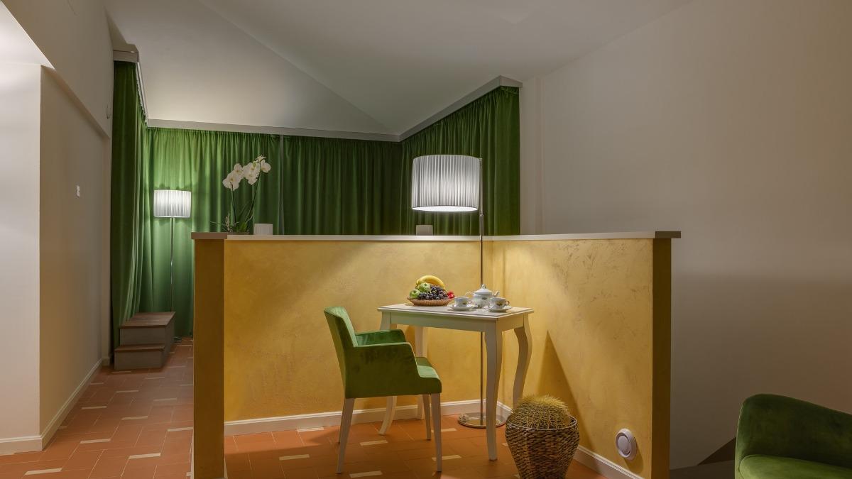 Breakfast, served in the Osteria on the ground floor, is a delightful experience that highlights local specialties. Each morning, fresh bread, pastries, and schiacciata are prepared, accompanied by cured meats, cheeses, and locally sourced milk. The coffee, offered in various forms, is from 1878 Moka Jenne, a symbol of Pistoia's rich tradition.