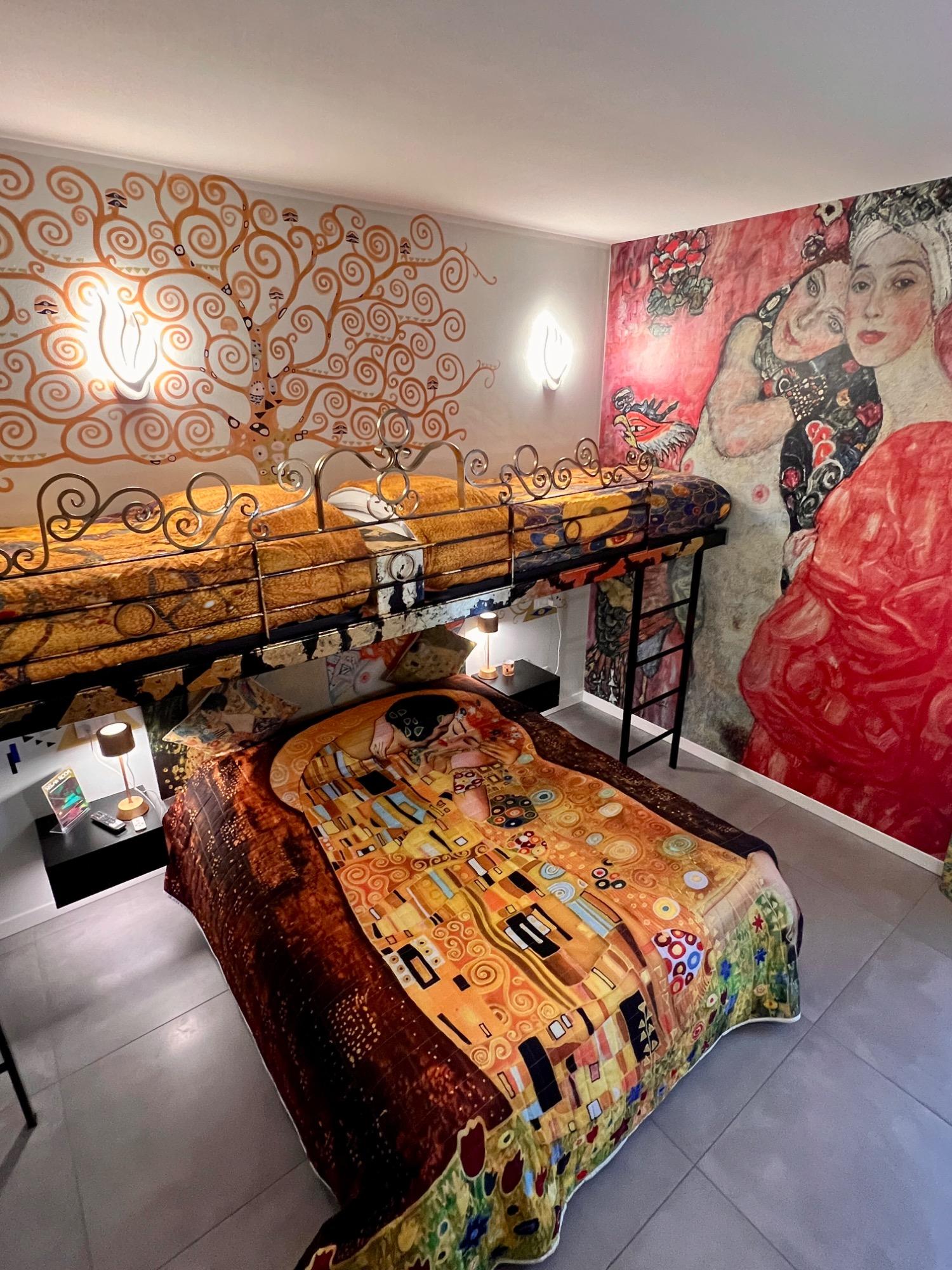 La Camera Klimt, ispirata all’opera “Il Bacio” di Gustav Klimt, è un trionfo di dettagli dorati, motivi geometrici e colori vibranti che creano un’atmosfera intima e raffinata, ideale per chi cerca un soggiorno immerso nell’eleganza e nel simbolismo dell’arte del maestro viennese.
