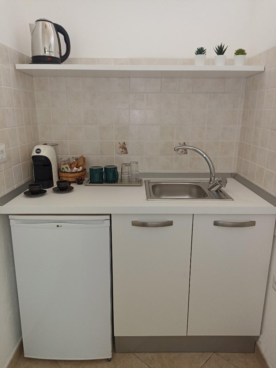 Desayuno de bricolaje con máquina de espresso, minibar, hervidor y lo necesario para el desayuno.