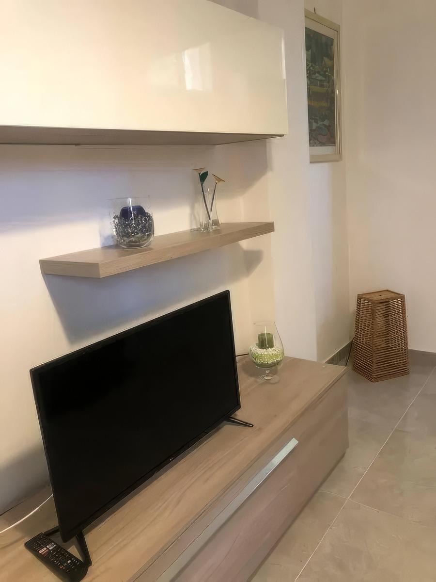 The apartment features a bright one-bedroom layout, including a double bedroom, a spacious living area with a dining space and kitchenette, as well as a living room equipped with a TV and a sofa bed. The bathroom is equipped with a convenient washer-dryer, and the entire space is air-conditioned to ensure maximum comfort year-round.