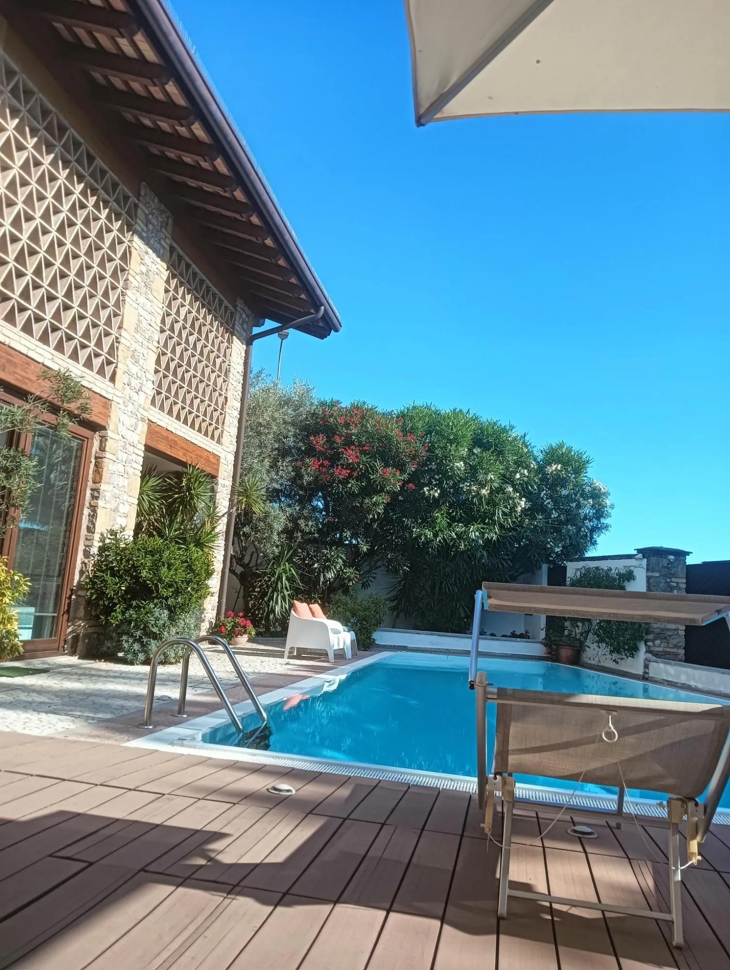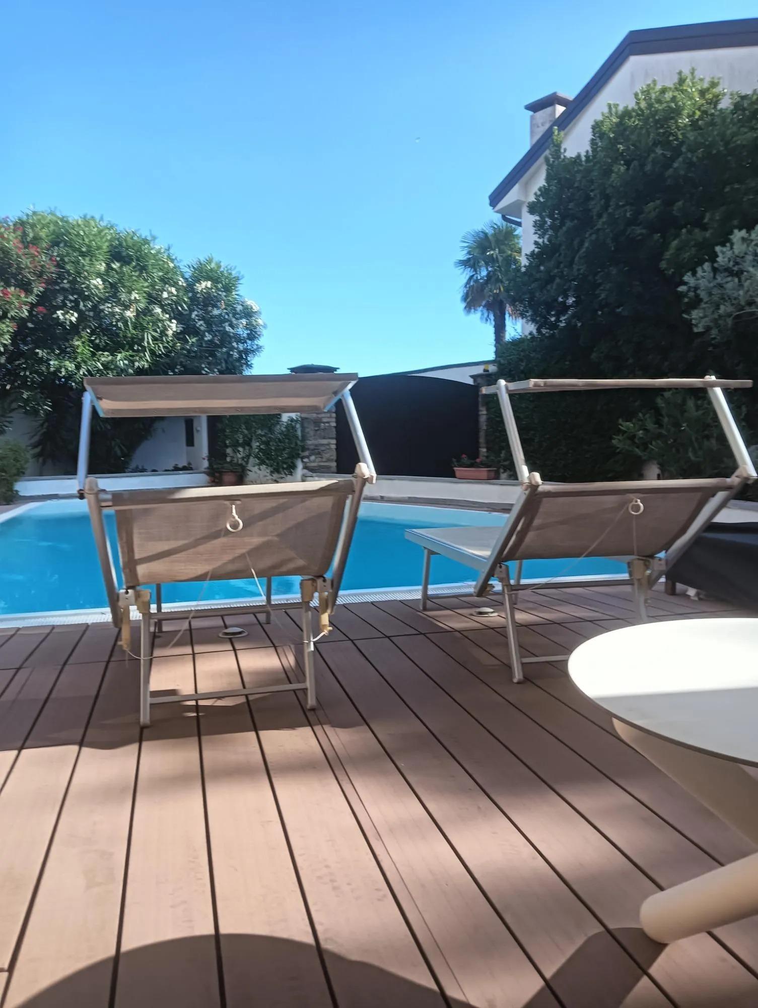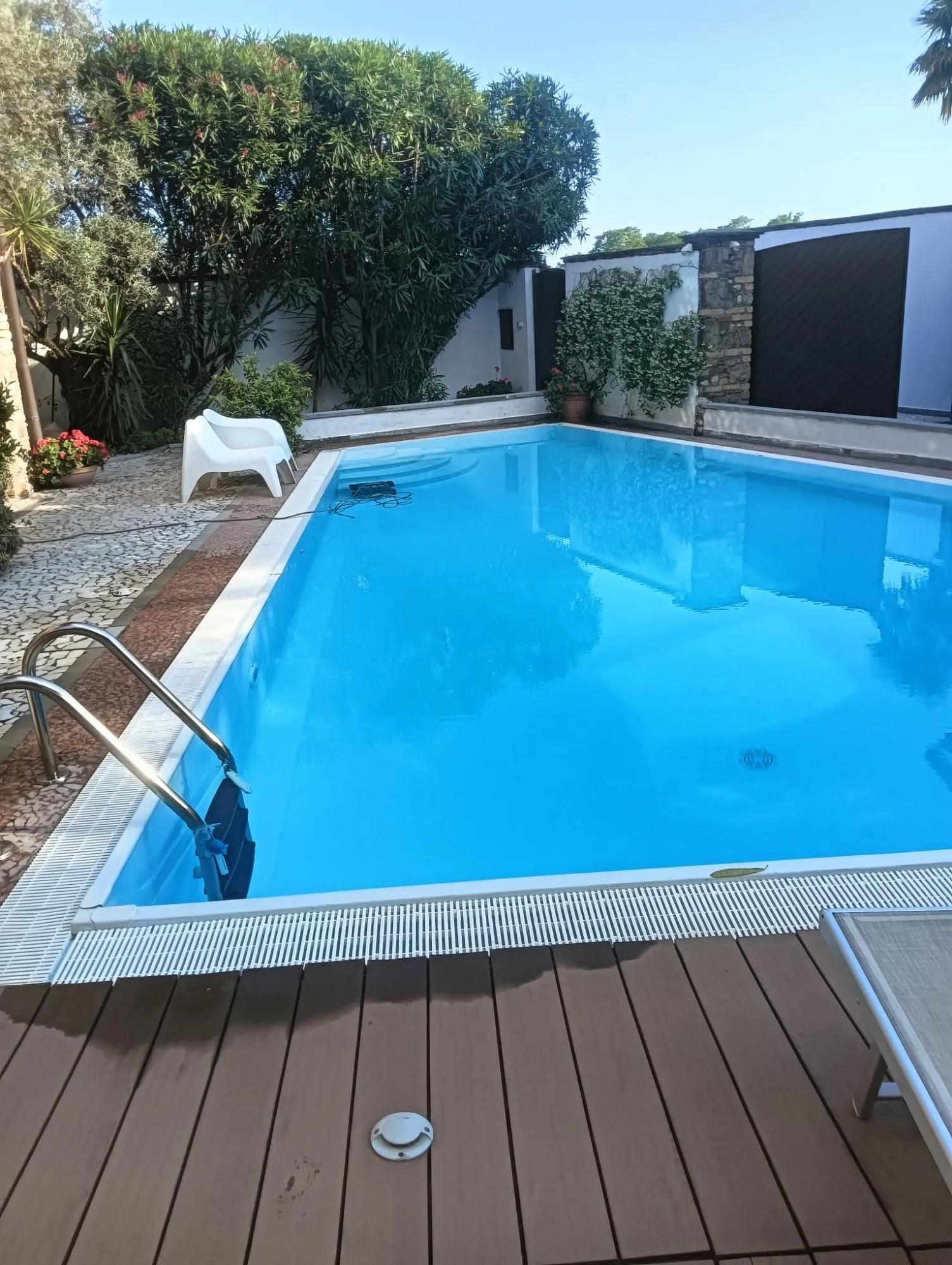 El cuidado jardín que rodea la villa alberga una hermosa piscina de temporada, de 12 metros de largo y hasta 2,25 metros de profundidad, perfecta para refrescarse en los días más calurosos. Los huéspedes disponen de tumbonas, sofás, sombrillas y sillones, con amplias zonas de sombra y aromas mediterráneos que evocan paisajes del sur. Desde mayo, el agua de la piscina alcanza temperaturas agradables.