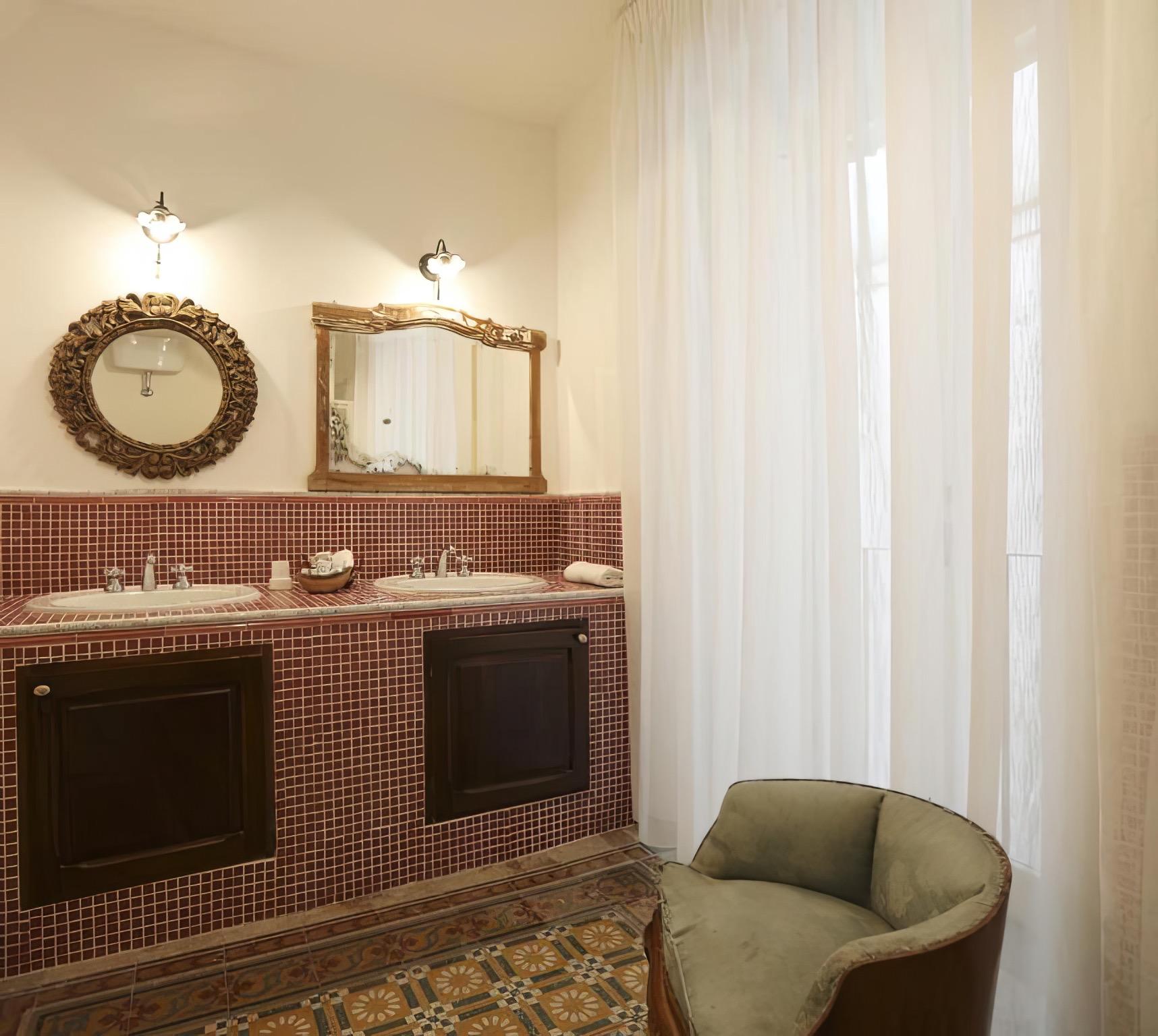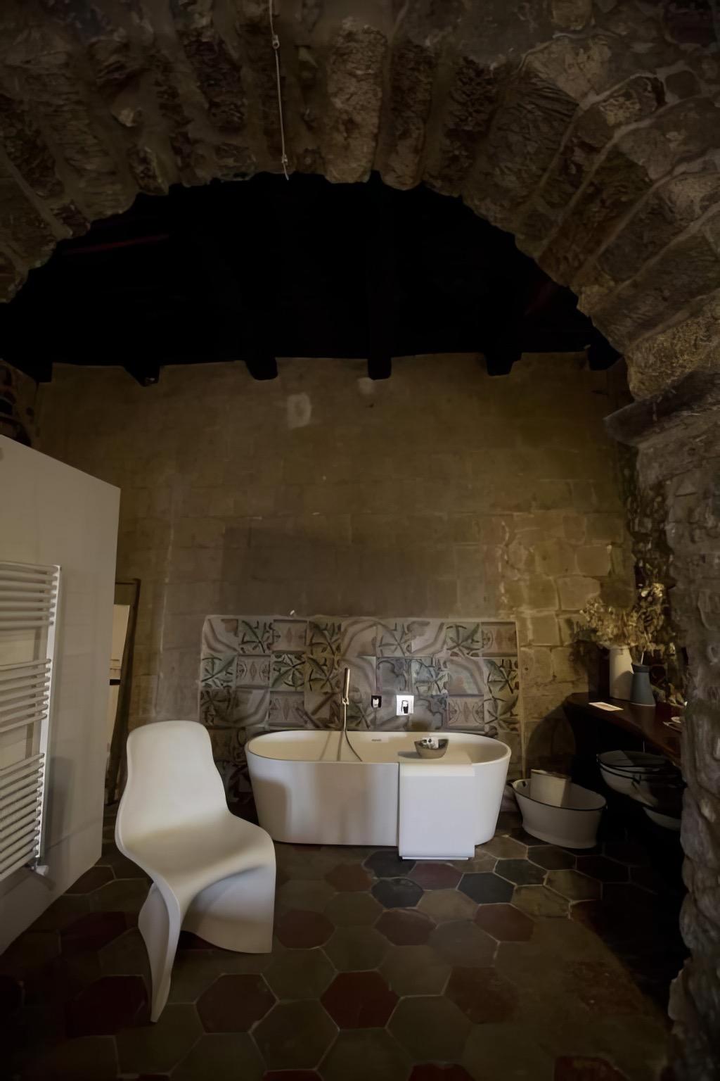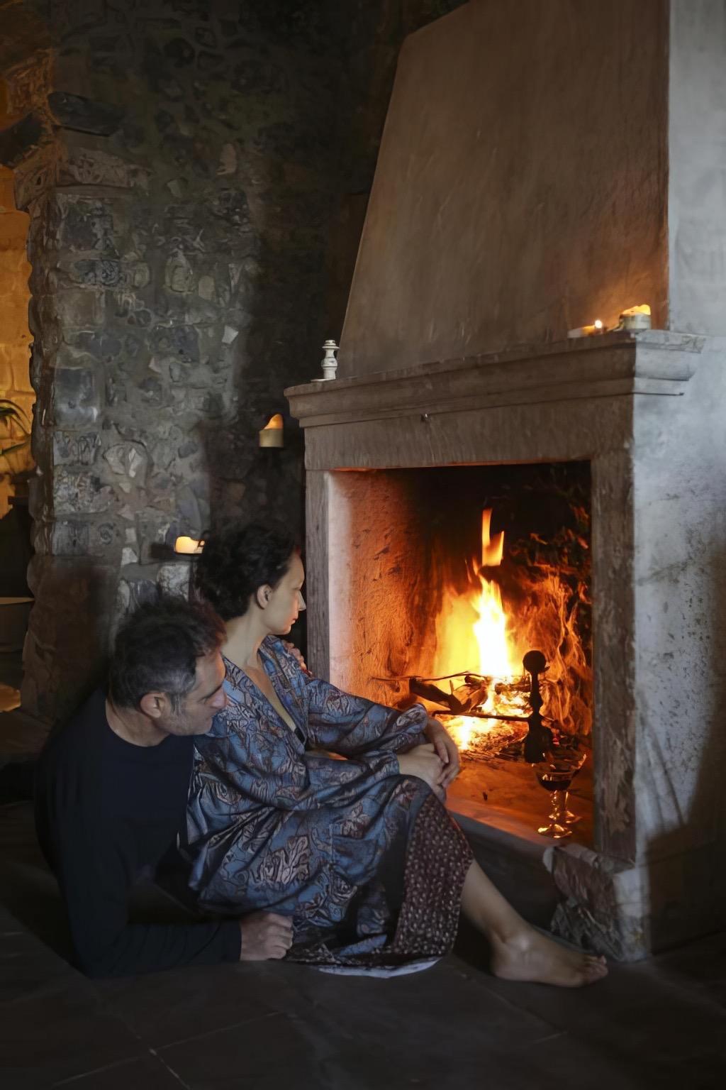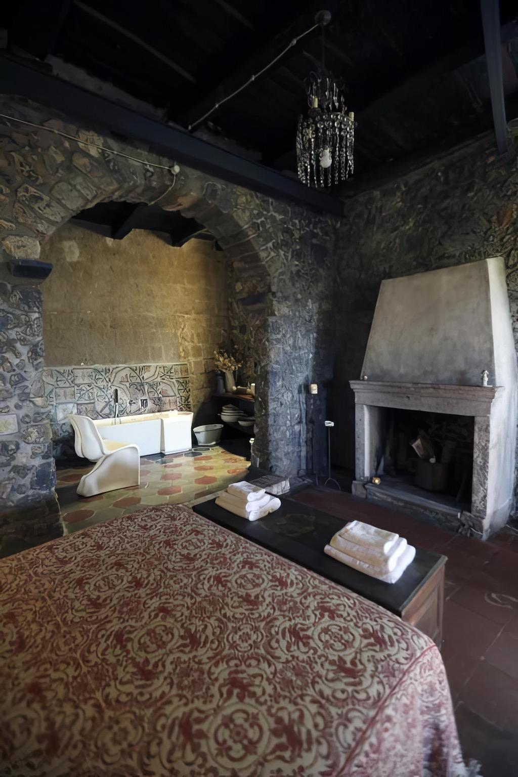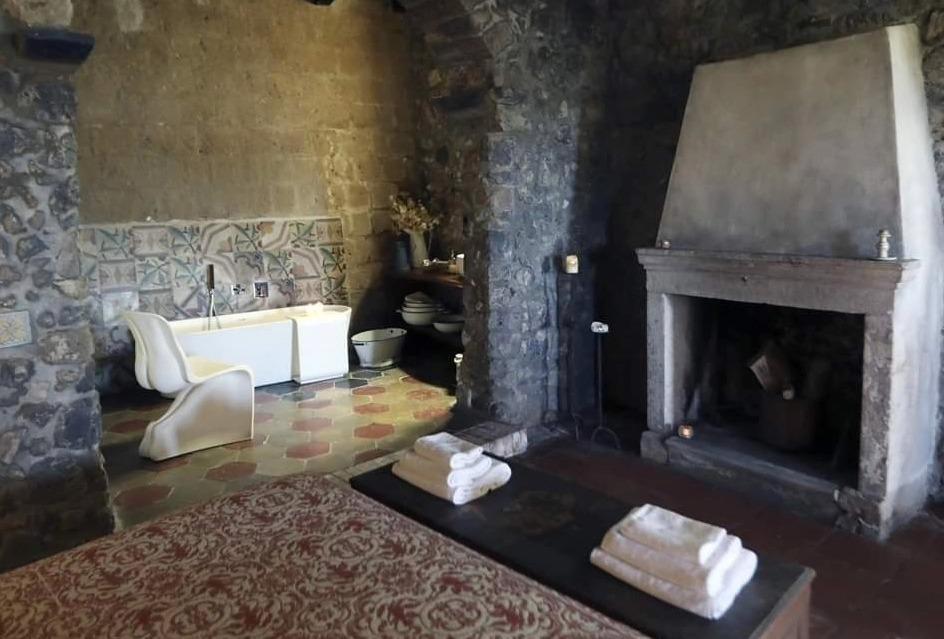 The view room is spacious and welcoming, suitable for families due to the option of adding extra beds. The bathroom, featuring a shower and double sinks, is designed for comfort and convenience. The larger suite, characterized by exposed stone and wooden beams, includes a relaxation area, a section dedicated to single beds, and a living area with a double bed, fireplace, and visible bathtub. It also comes equipped with a minibar, kettle, herbal teas, and an espresso machine.