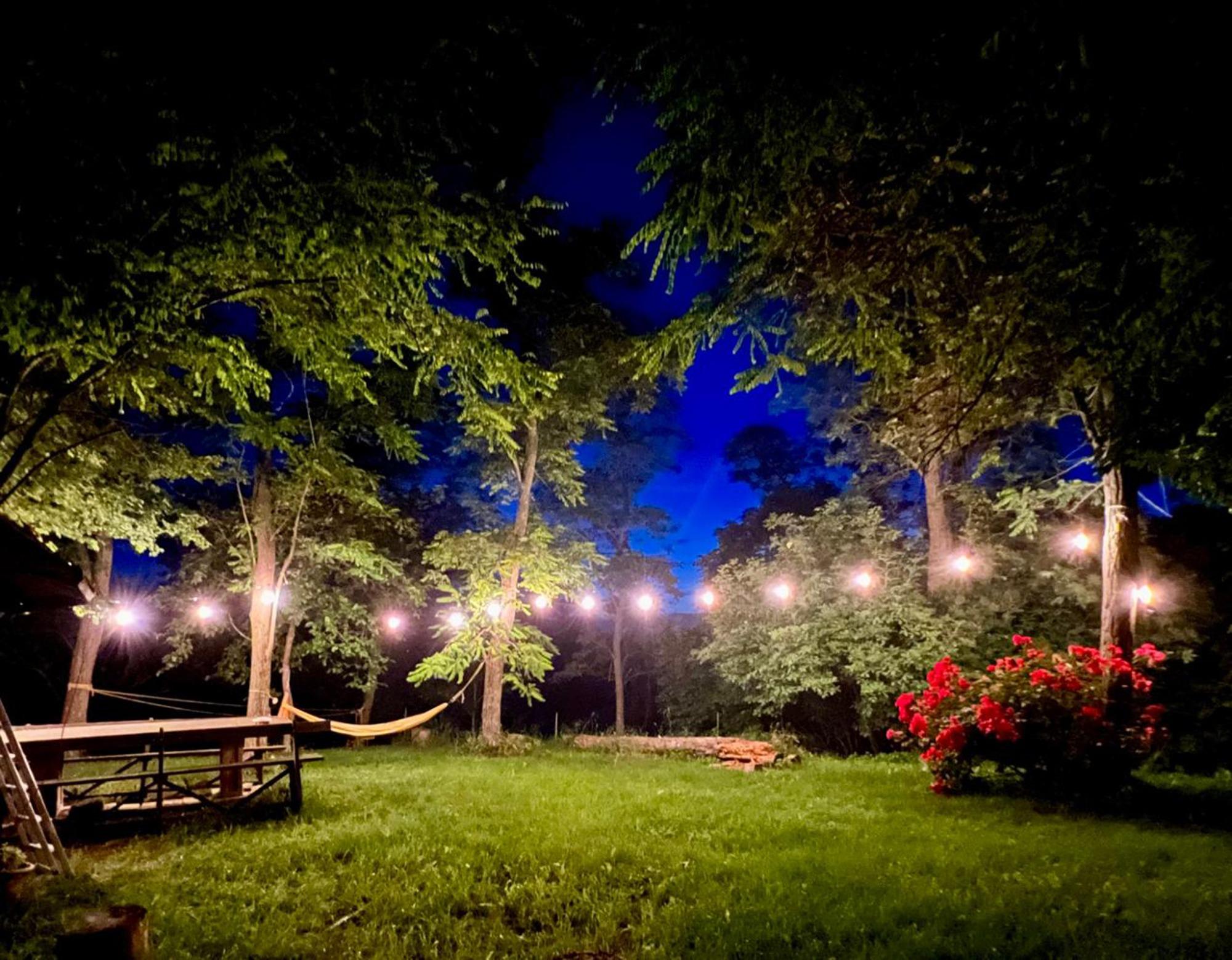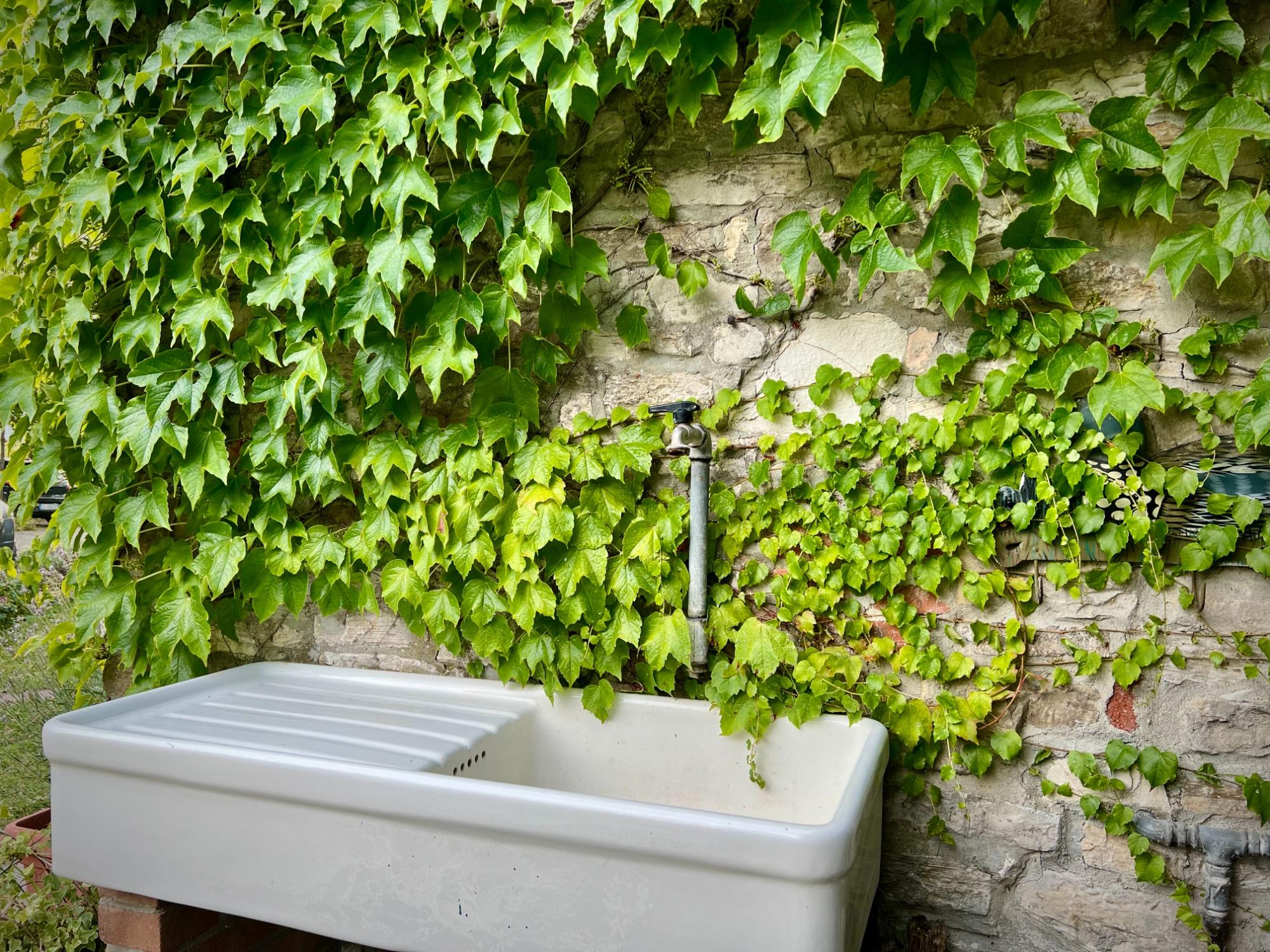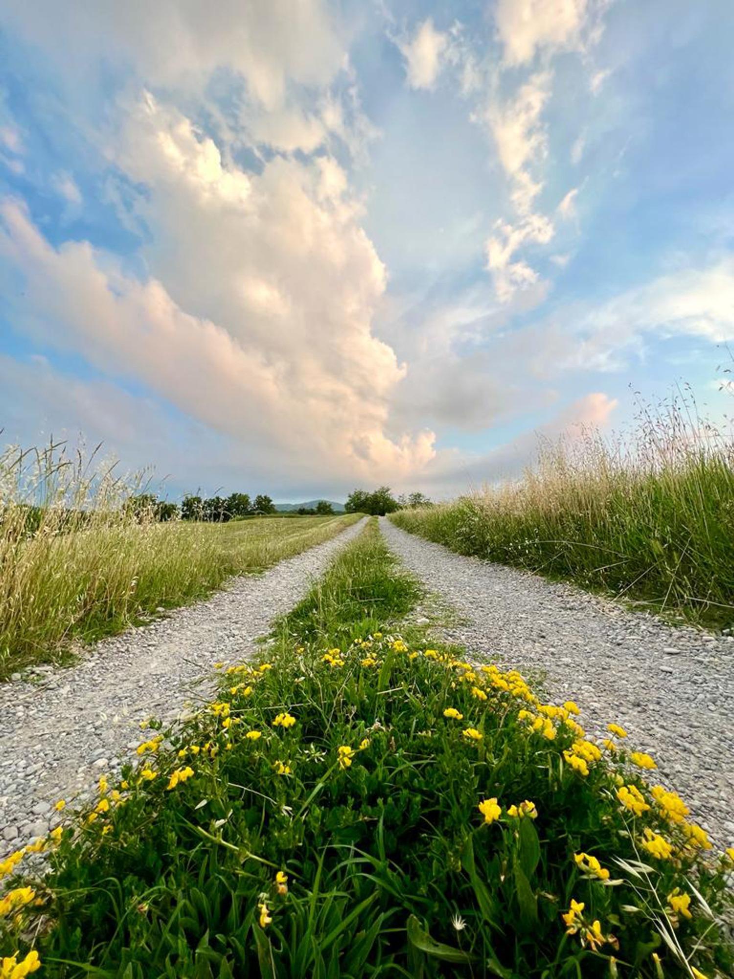 All’esterno, il grande giardino si apre su un paesaggio silenzioso e verdeggiante: tavolo con panche, amaca tra gli alberi e una vista che invita alla contemplazione. I più attenti potranno scorgere, con un po’ di pazienza, animali selvatici come caprioli, tassi e rapaci. Subito fuori dalla porta si snodano sentieri perfetti per escursioni a piedi o in bicicletta, con la possibilità di noleggiare e-bike su prenotazione.