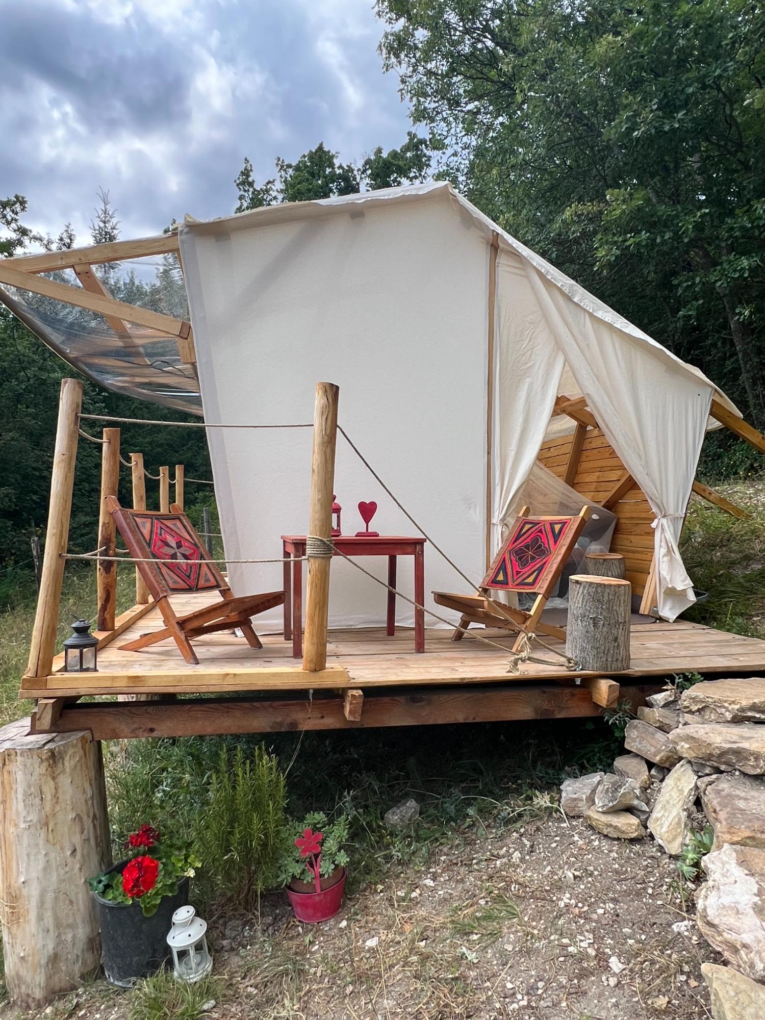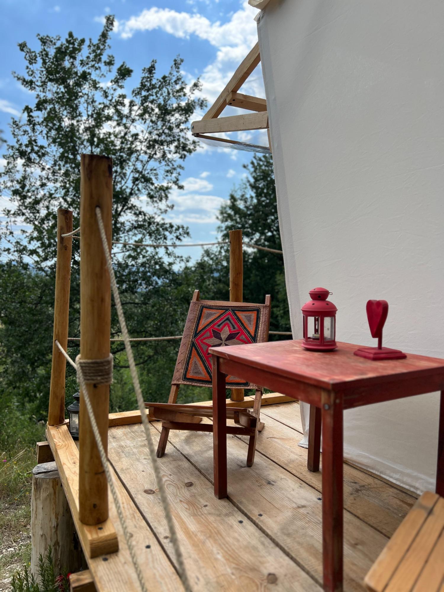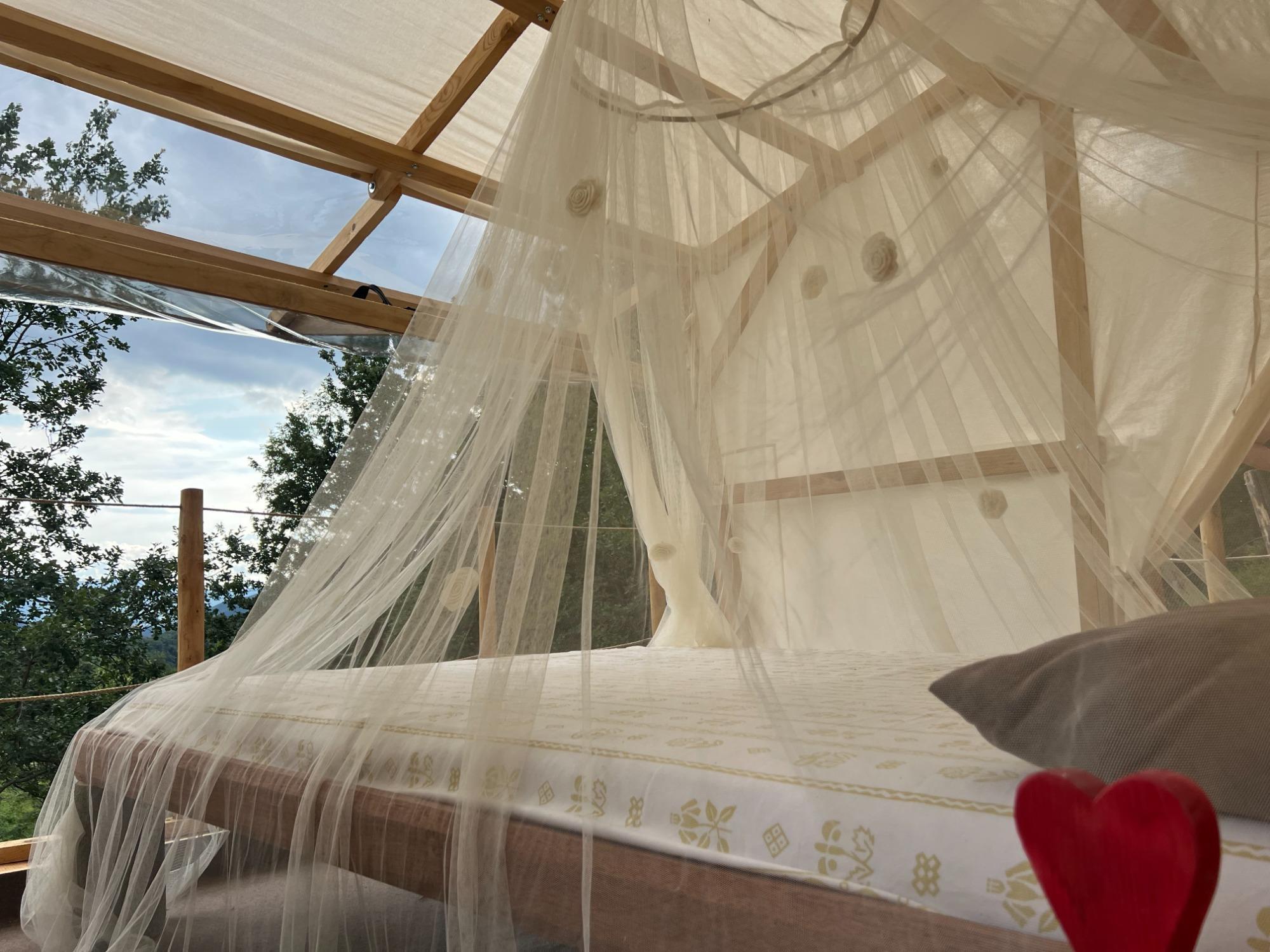 Romantica e riservata casetta/tenda in legno e tessuto indipendente a bordo bosco, essenziale, con letto matrimoniale e vista sul tramonto per godere del contatto diretto con la natura circostante; Quasi ntegralmente ecologica con mini doccia dal secchio e acqua di fonte in contenitore alimentare mentre Toilette e lavandino sono esterni, a circa 50m. Sono in dotazione due lanterne solari e due lampade frontali oltre a biancheria ed acqua in bottiglia. Sono ammessi solo detergenti ecologici (sapone e dentifricio saranno a vostra disposizione). In caso di forte vento o pioggia la prenotazione sarà annullata e subito rimborsata oppure, se disponibile vi verrà proposta una delle camere del B&B allo stesso prezzo. La colazione opzionale, dal valore di 9€ per persona, se desiderata, può essere concordata all'arrivo e verrà servita presso la casetta entro le ore 10.