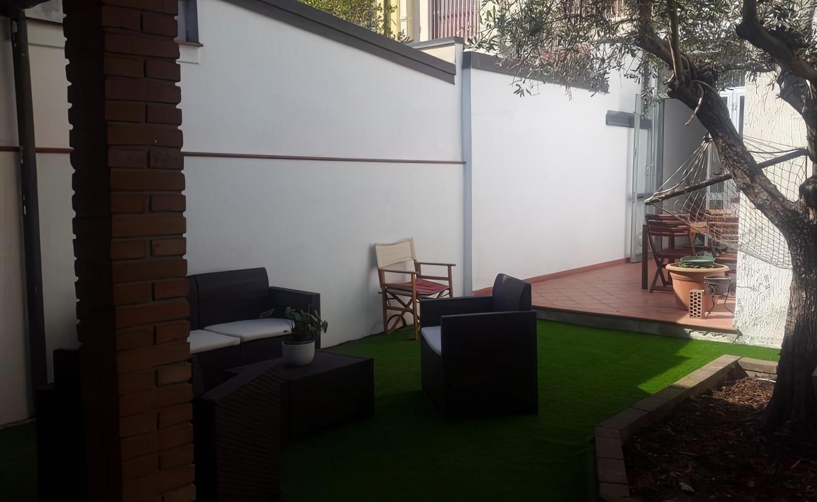 The garden, highlighted by an ancient olive tree, is furnished with sofas, loungers, and a table perfect for outdoor meals. On request, provisions for accommodating small children are available.