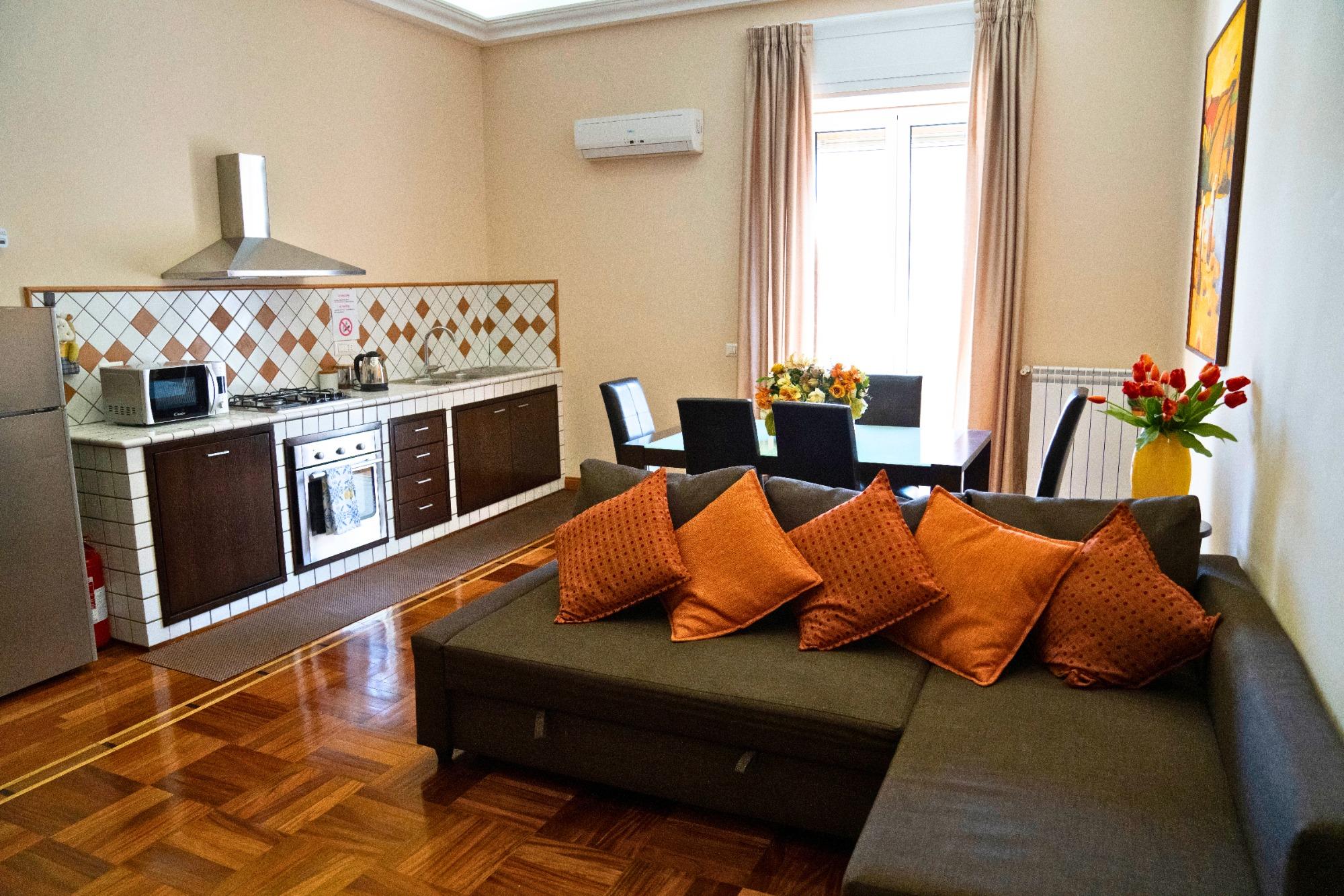 L’appartamento offre un ambiente accogliente e funzionale, con una spaziosa camera matrimoniale e una cucina soggiorno attrezzata con divano letto per due persone. Il bagno, completo di tutti i comfort, contribuisce a garantire un soggiorno piacevole.