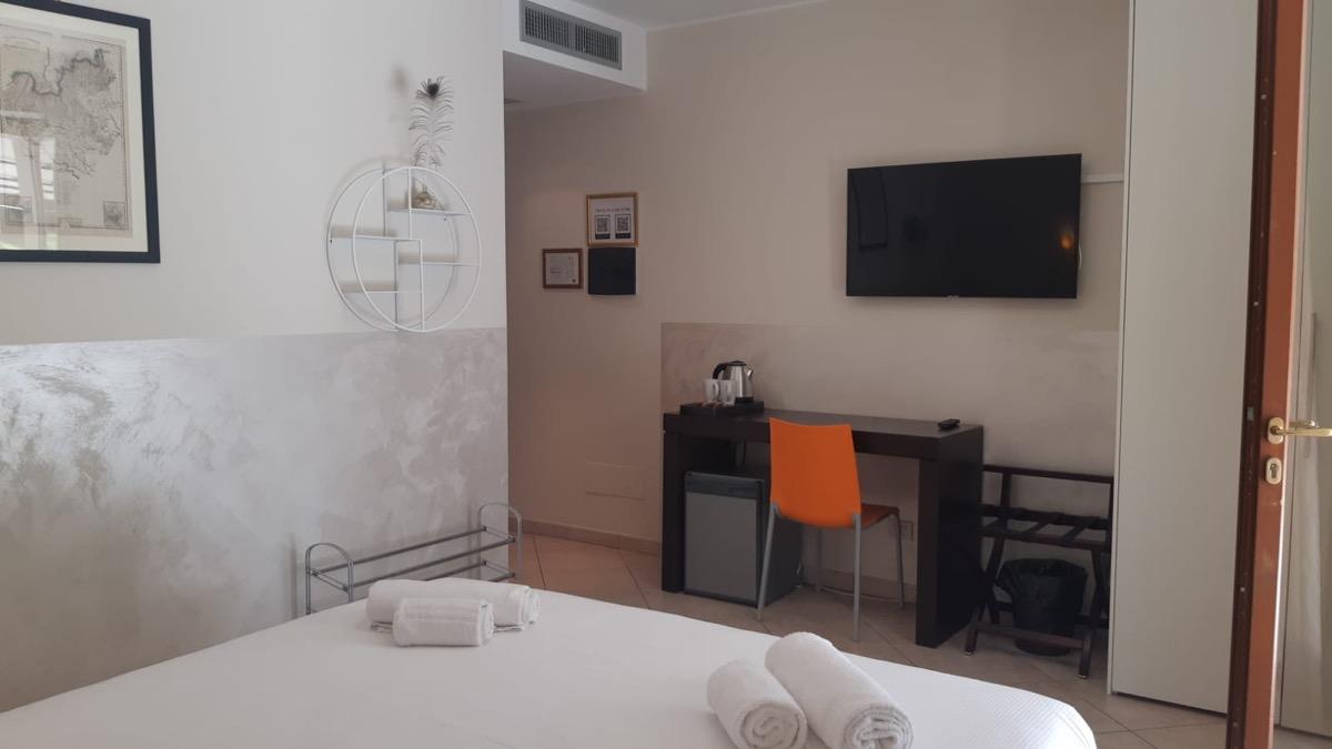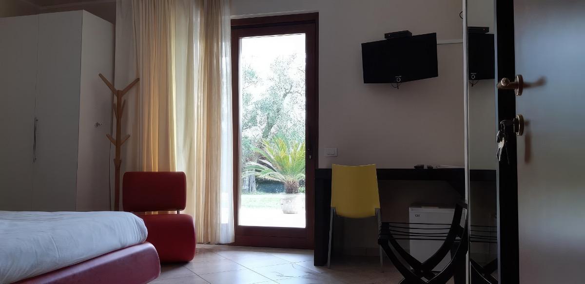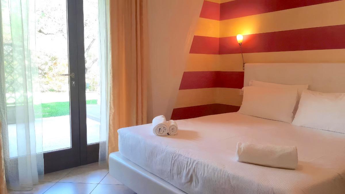 Double room on the ground floor with independent access from the outside through the private covered terrace with a wooden Table.