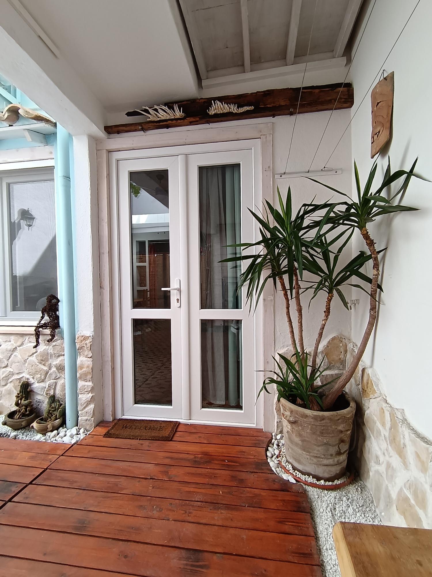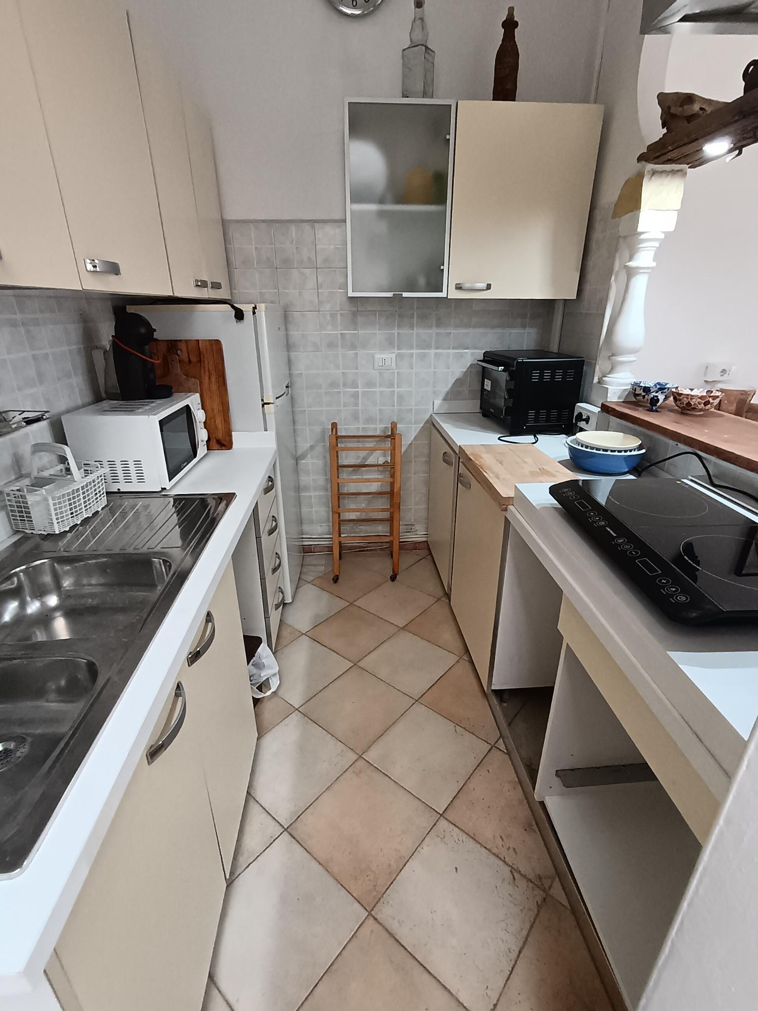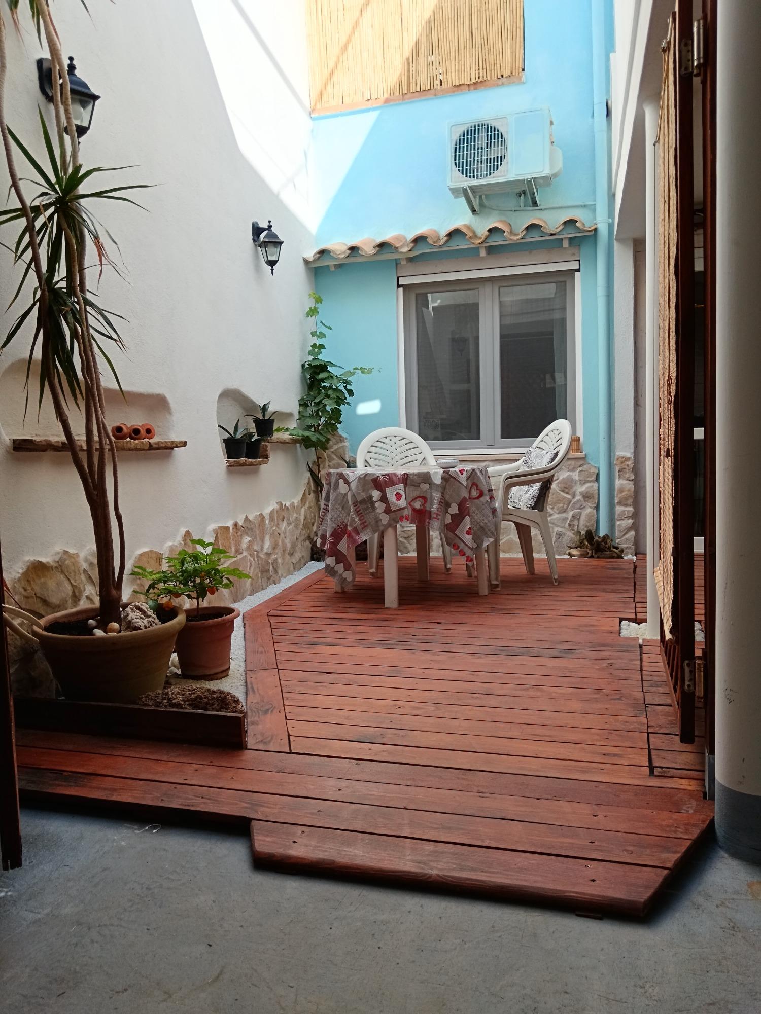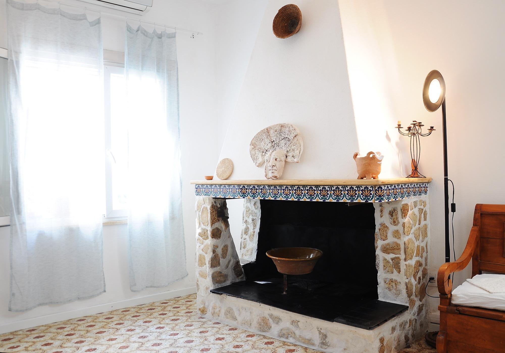 The accommodation, accessible at ground level without stairs, opens onto a cozy and well-maintained courtyard, perfect for outdoor relaxation. The entrance leads to a living room with a fireplace and an open kitchen area. A hallway connects the bathroom with a shower to the master bedroom, offering simple, functional, and comfortable spaces.