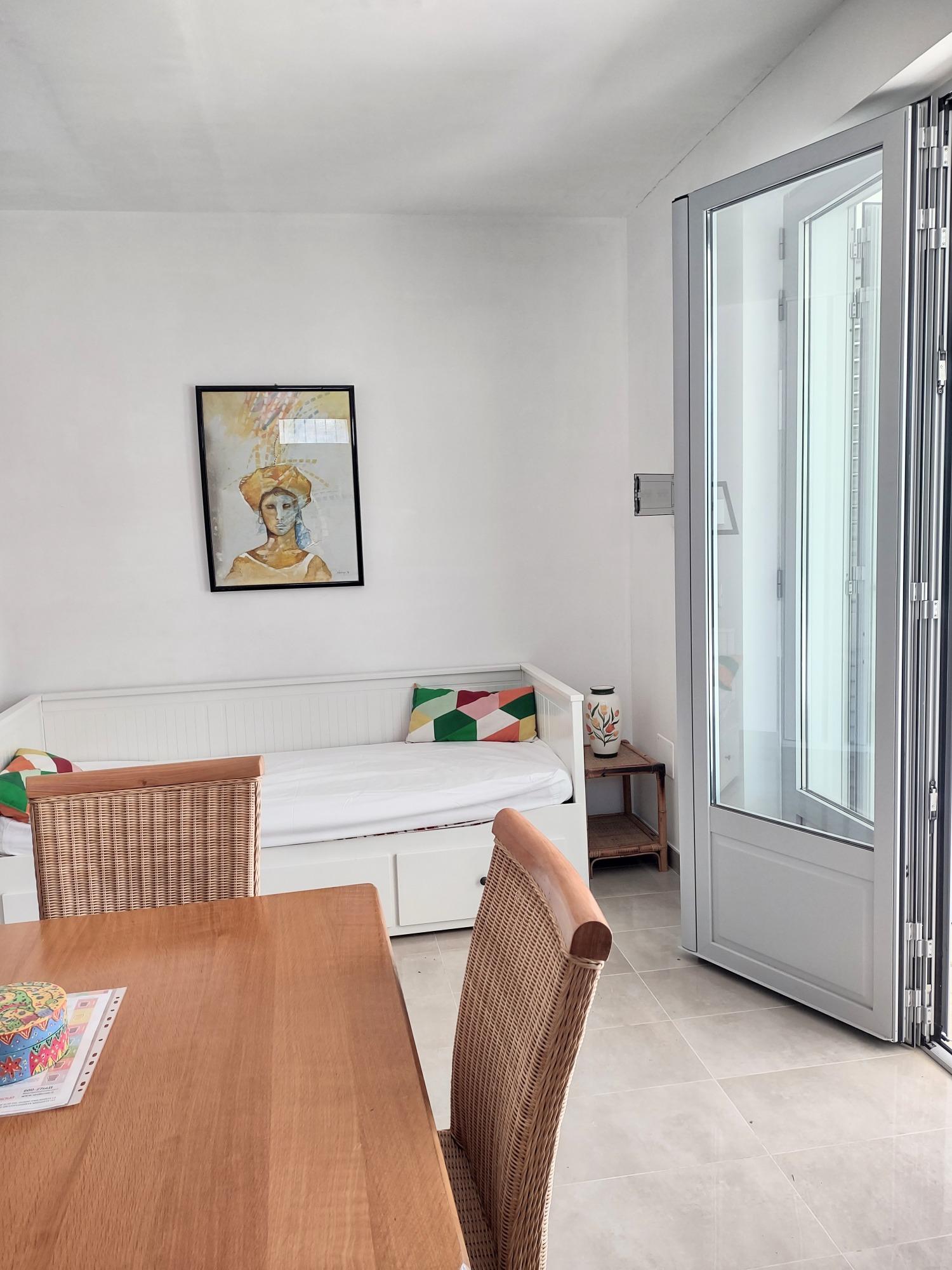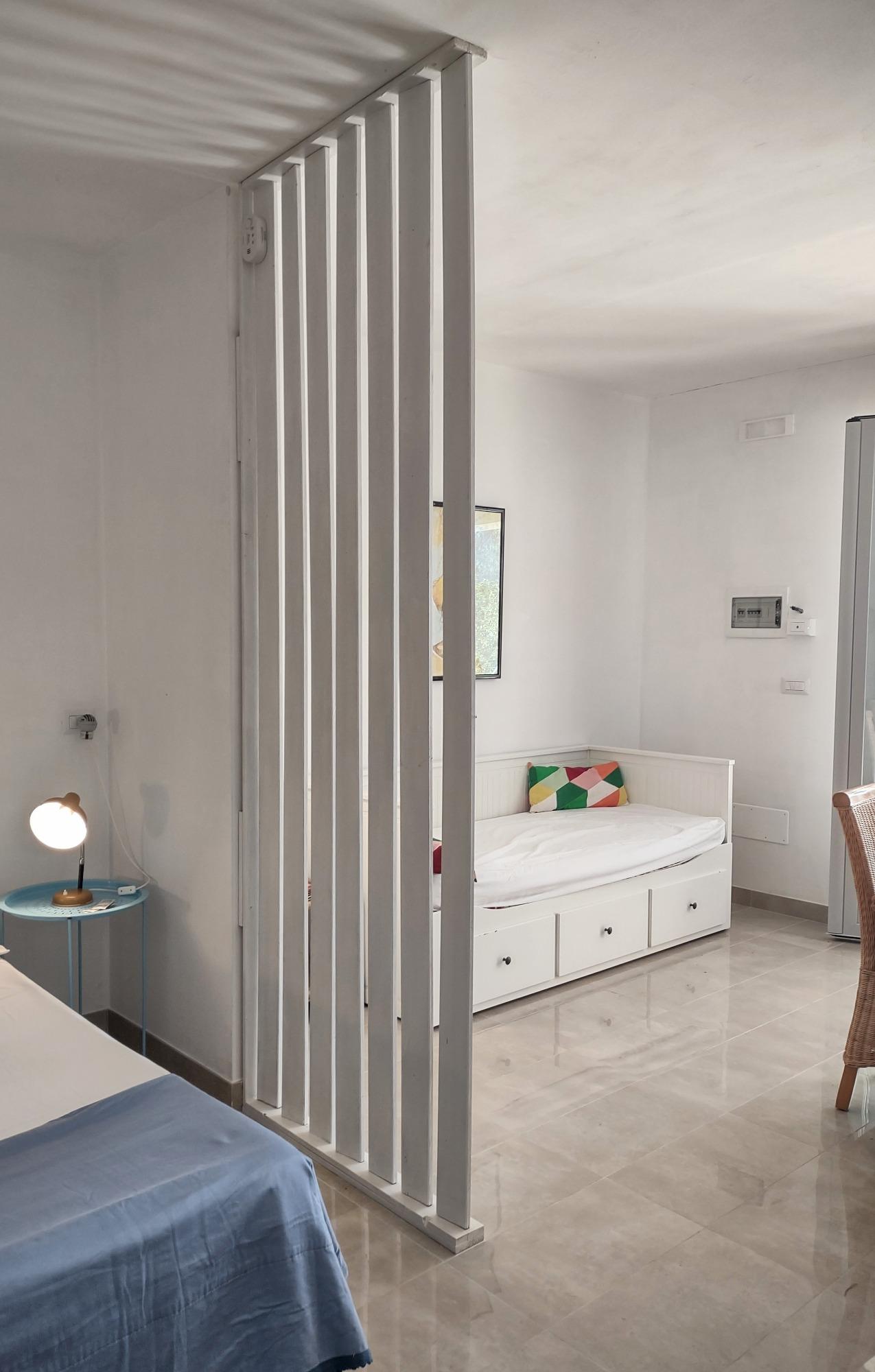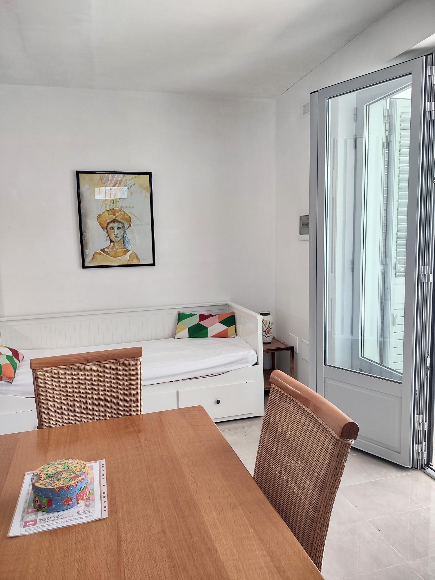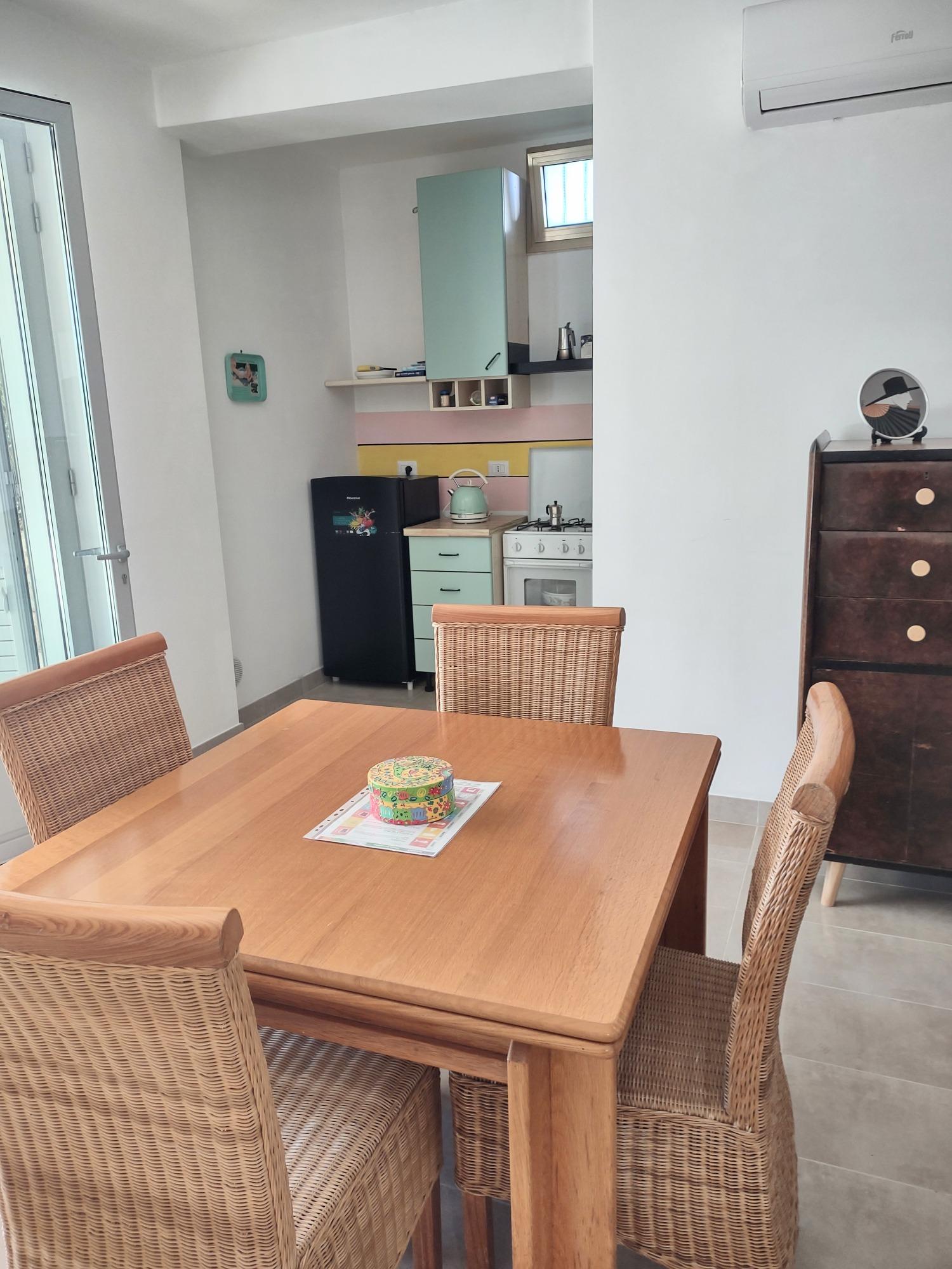 L’appartamento dispone di soggiorno con cucina, bagno, zona letto e guardaroba, oltre a una veranda privata dove rilassarsi in totale tranquillità. All’esterno sono disponibili una doccia e un barbecue per vivere appieno l’atmosfera estiva. La proprietà condivide il giardino, il piazzale e il parcheggio interno con altri due miniappartamenti, ma ogni unità ha il proprio spazio veranda delimitato da divisori per garantire la privacy.