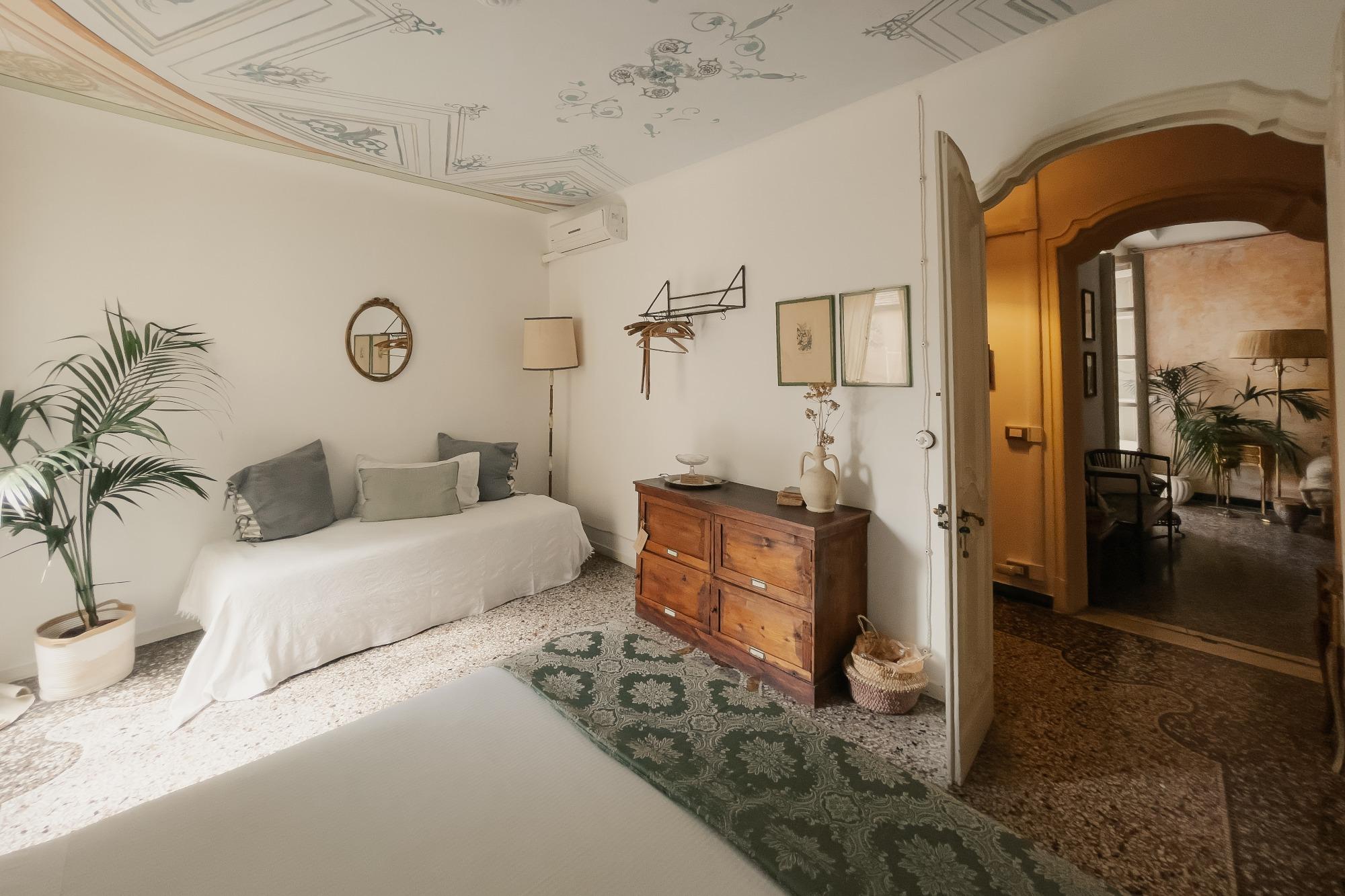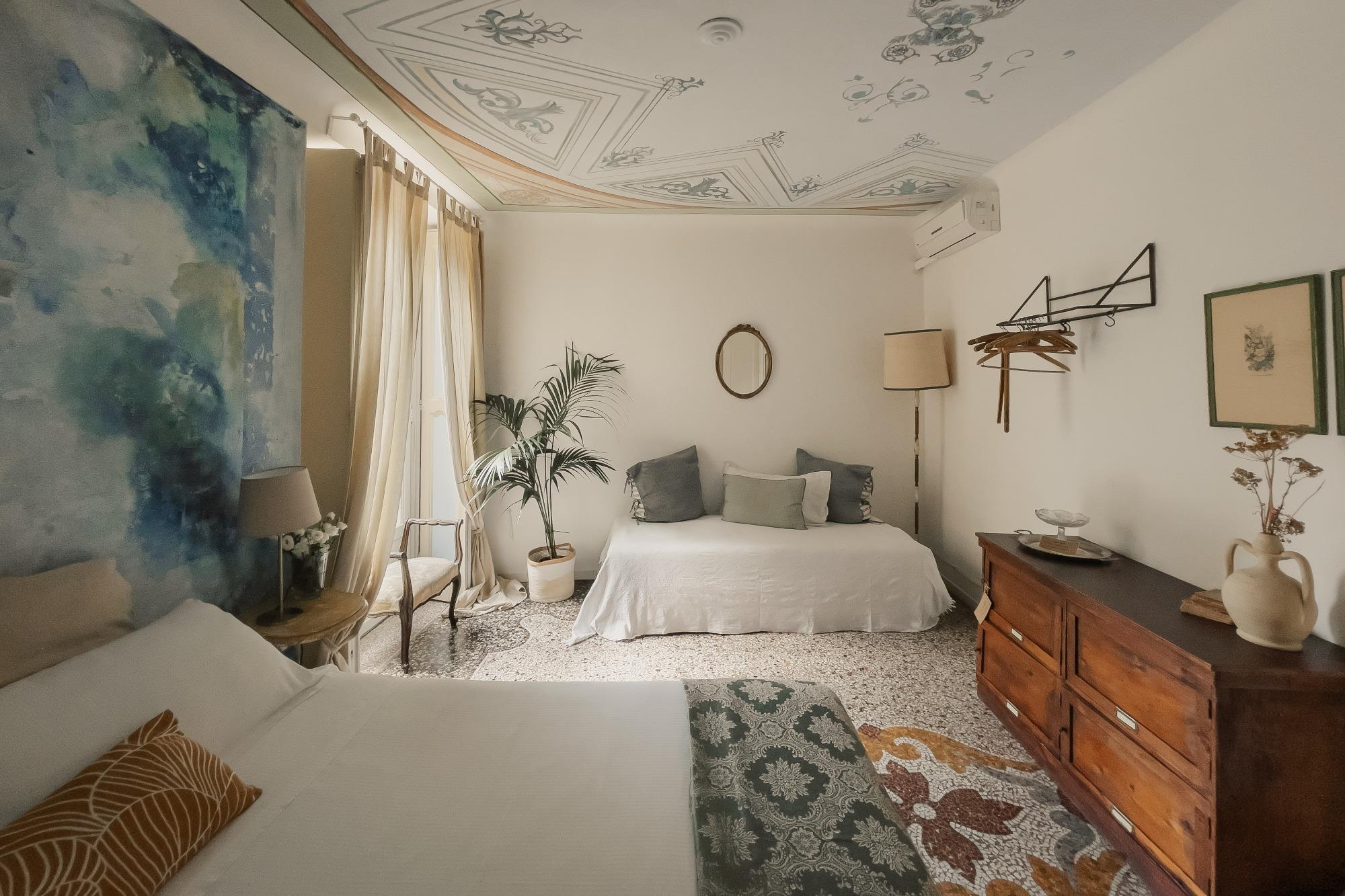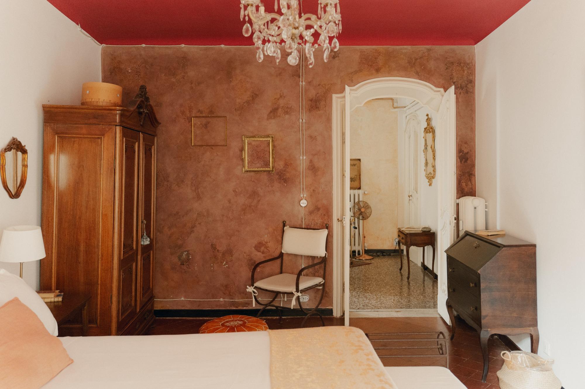 Affascinante e luminosa stanza doppia o tripla con cenni storici genovesi, dal soffitto affrescato alle porte intarsiate del settecento. Le particolarissime pareti in stile debaclé regalano un tocco vintage in armonia con l'arredo. Bagno privato con doccia situato esternamente, di fronte alla stanza.