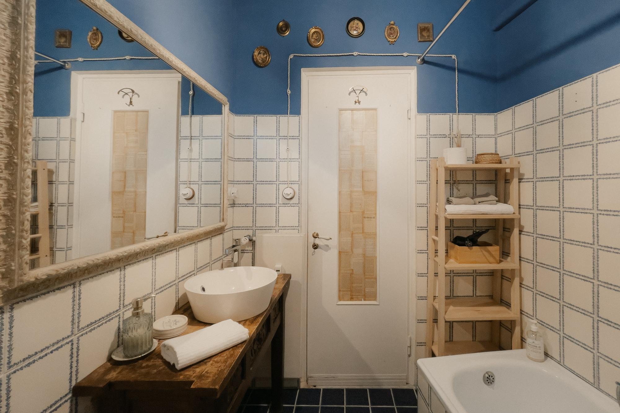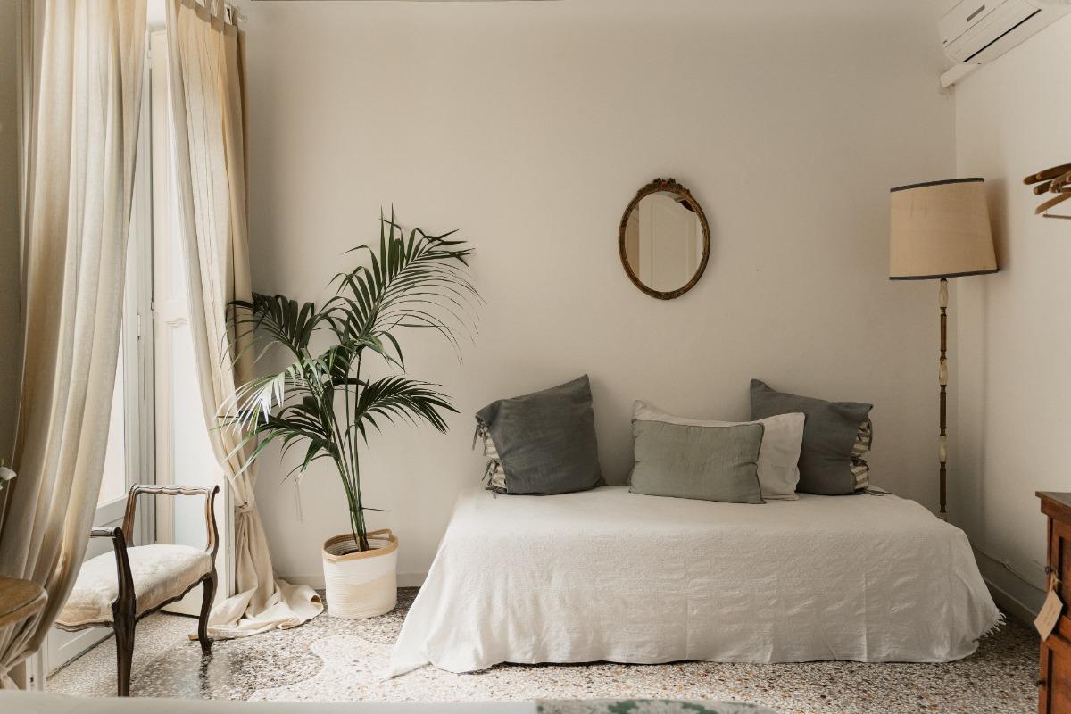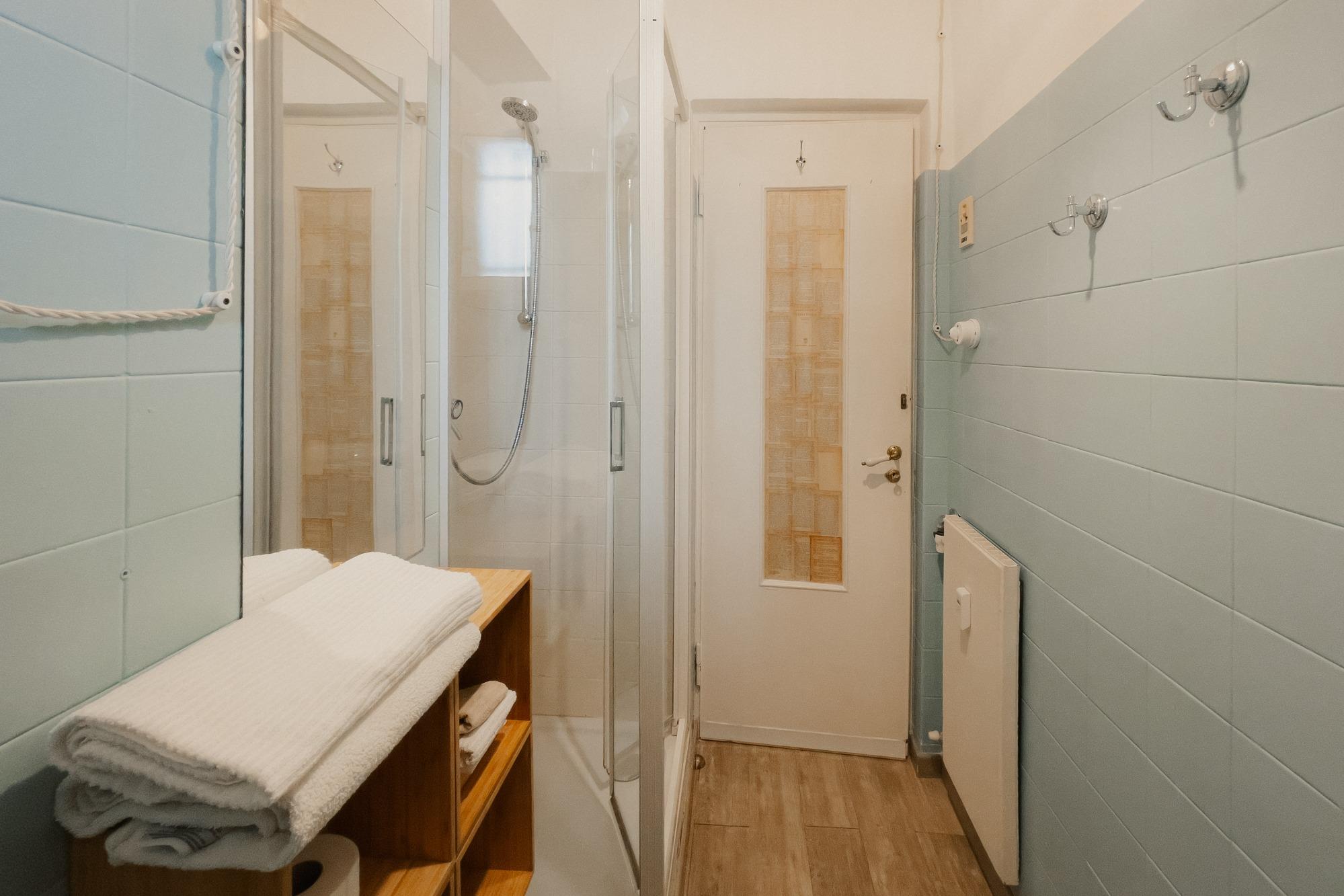 Affascinante e luminosa stanza doppia o tripla con cenni storici genovesi, dal soffitto affrescato alle porte intarsiate del settecento. Le particolarissime pareti in stile debaclé regalano un tocco vintage in armonia con l'arredo. Bagno privato con doccia situato esternamente, di fronte alla stanza.