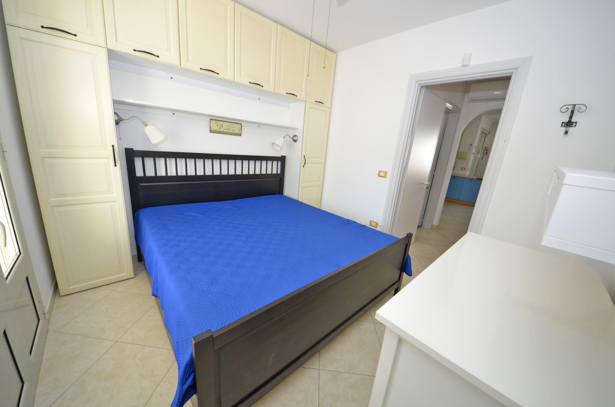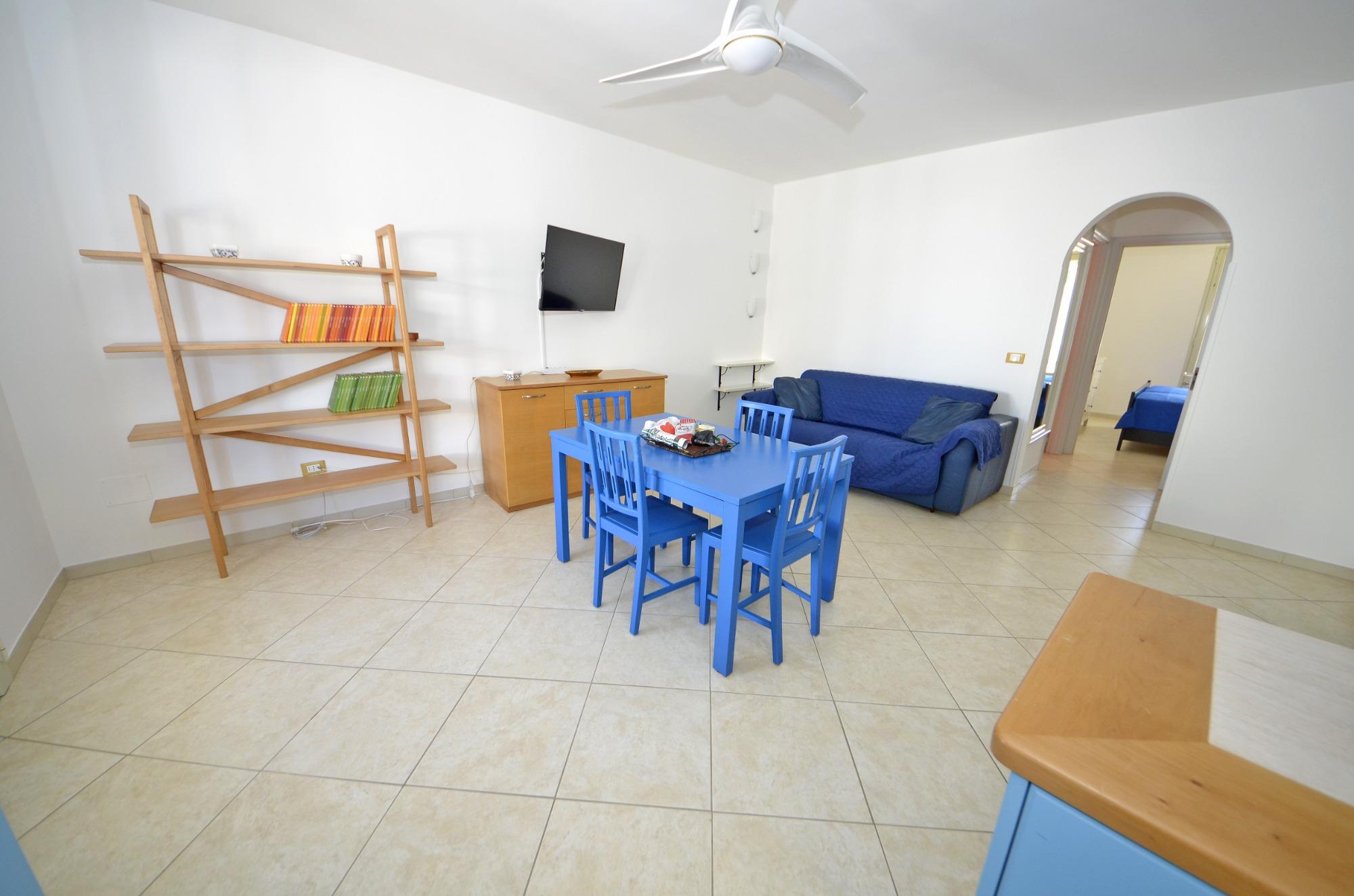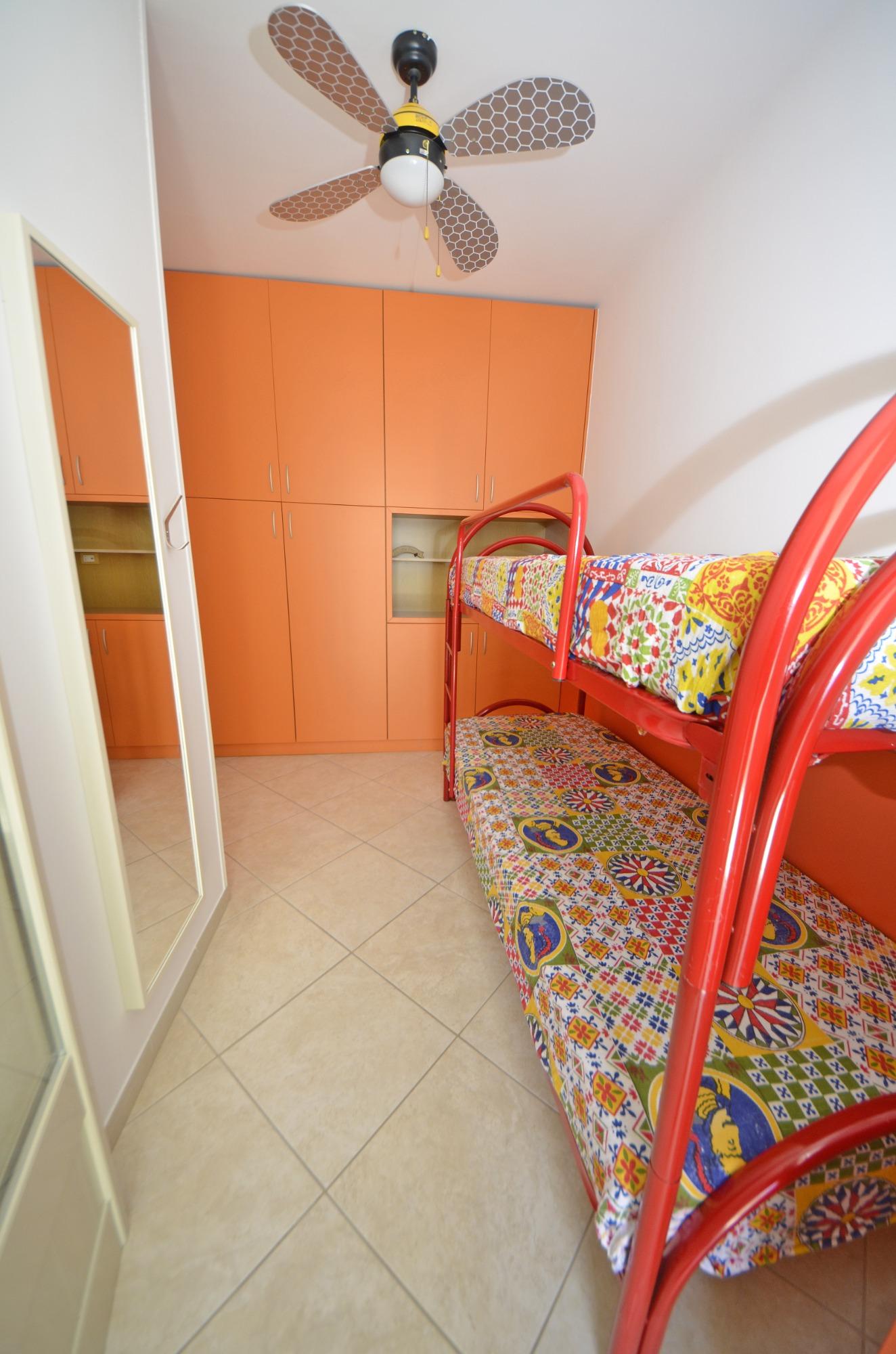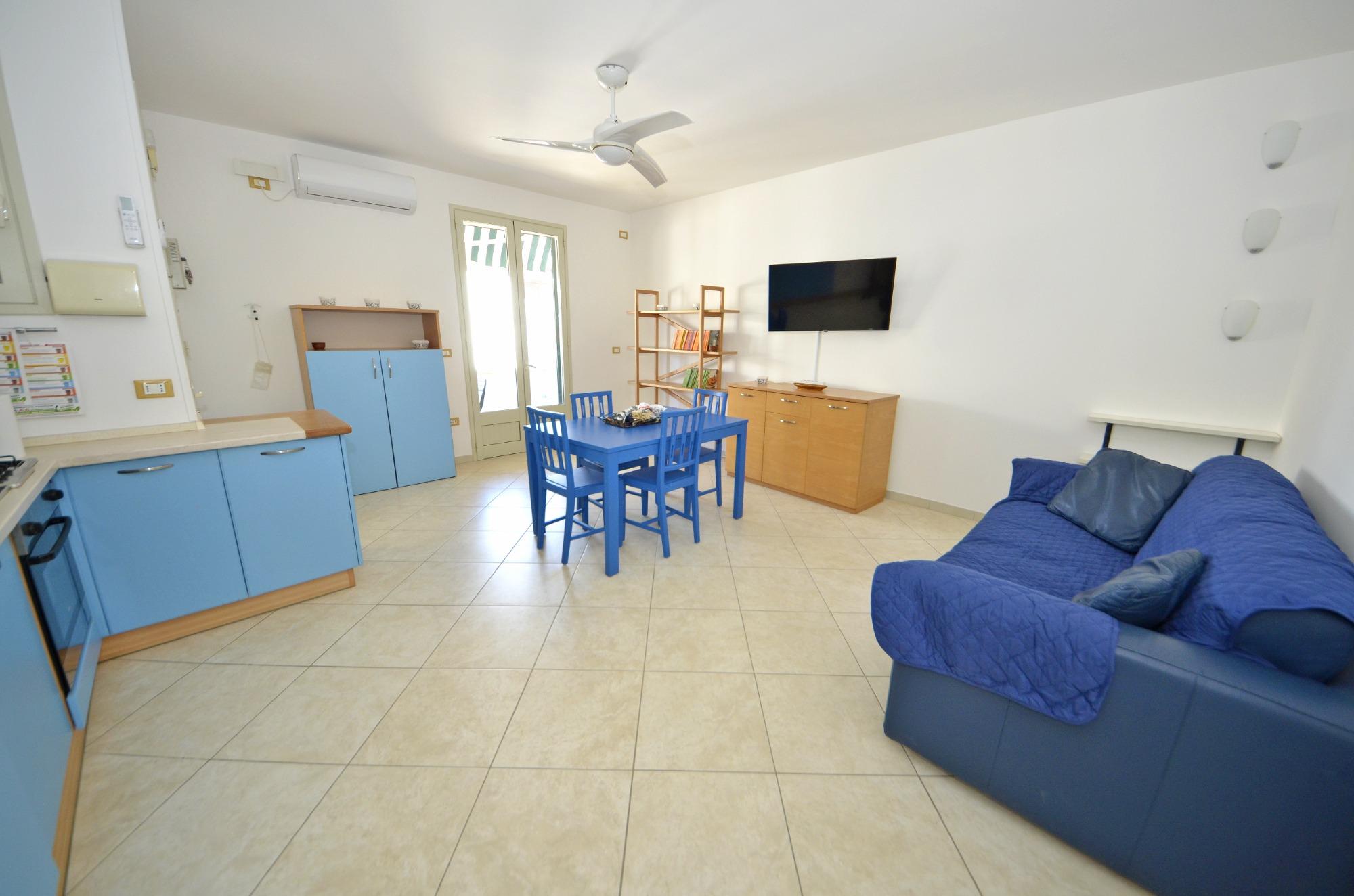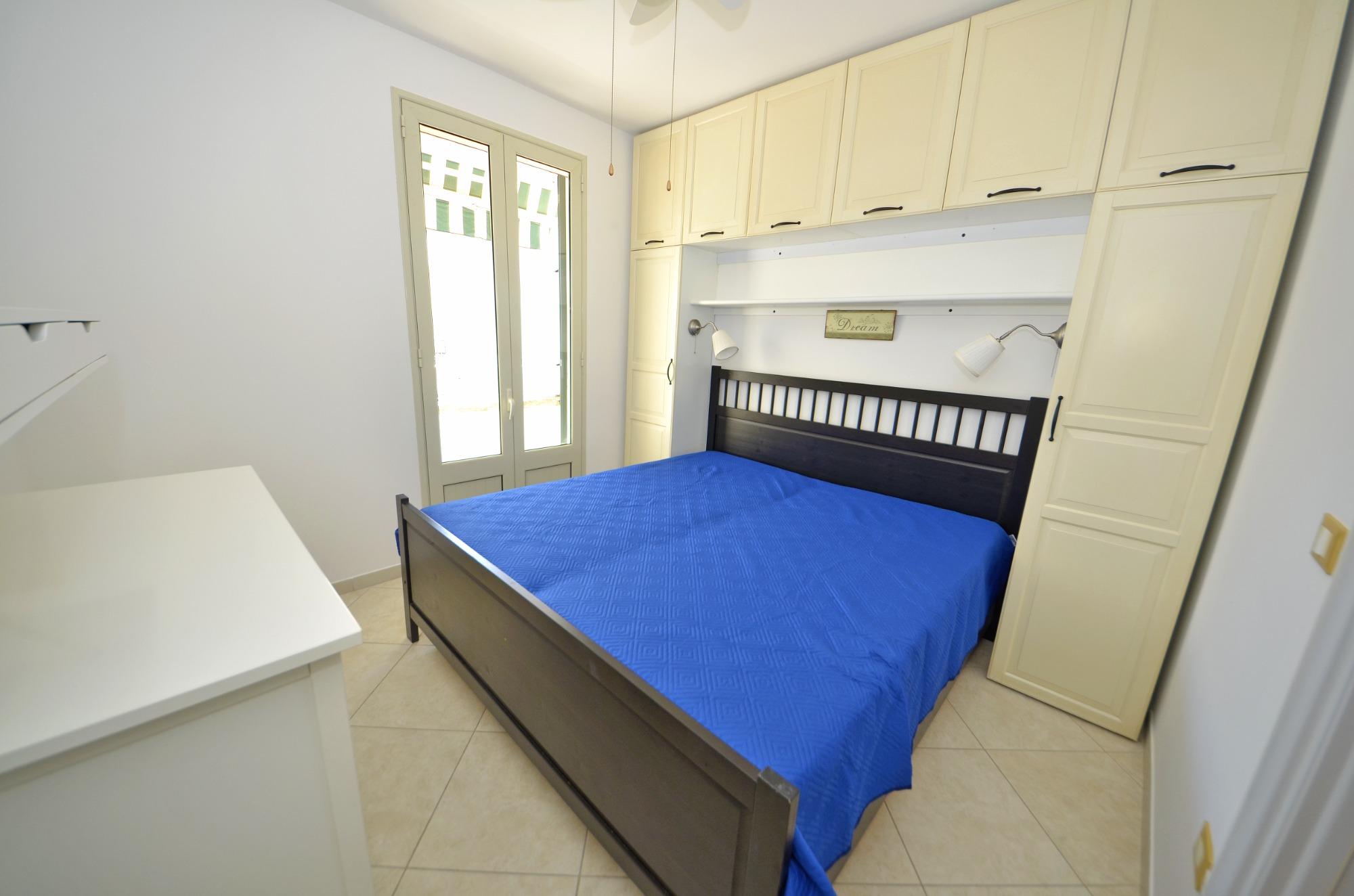 The interior spaces include a master bedroom and a second room with bunk beds, making it ideal for accommodating younger guests. The kitchen is fully equipped with all the necessary appliances, including an oven, refrigerator, dishwasher, and washing machine, allowing for a completely independent stay. The internal bathroom features a shower and is complemented by a convenient outdoor shower designed for rinsing off after a day at the beach. Air conditioning and a TV enhance the comfort, making the stay even more enjoyable.