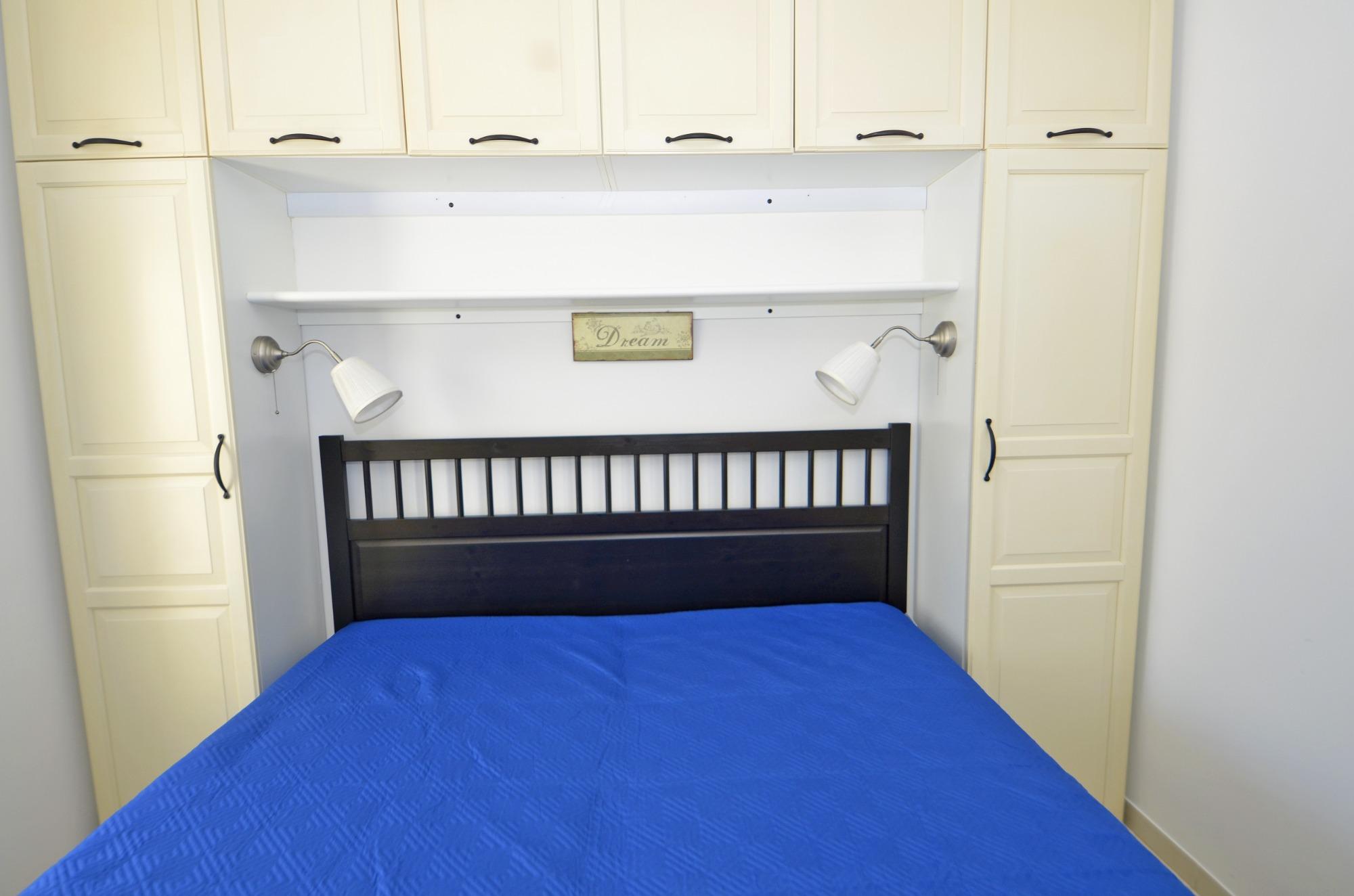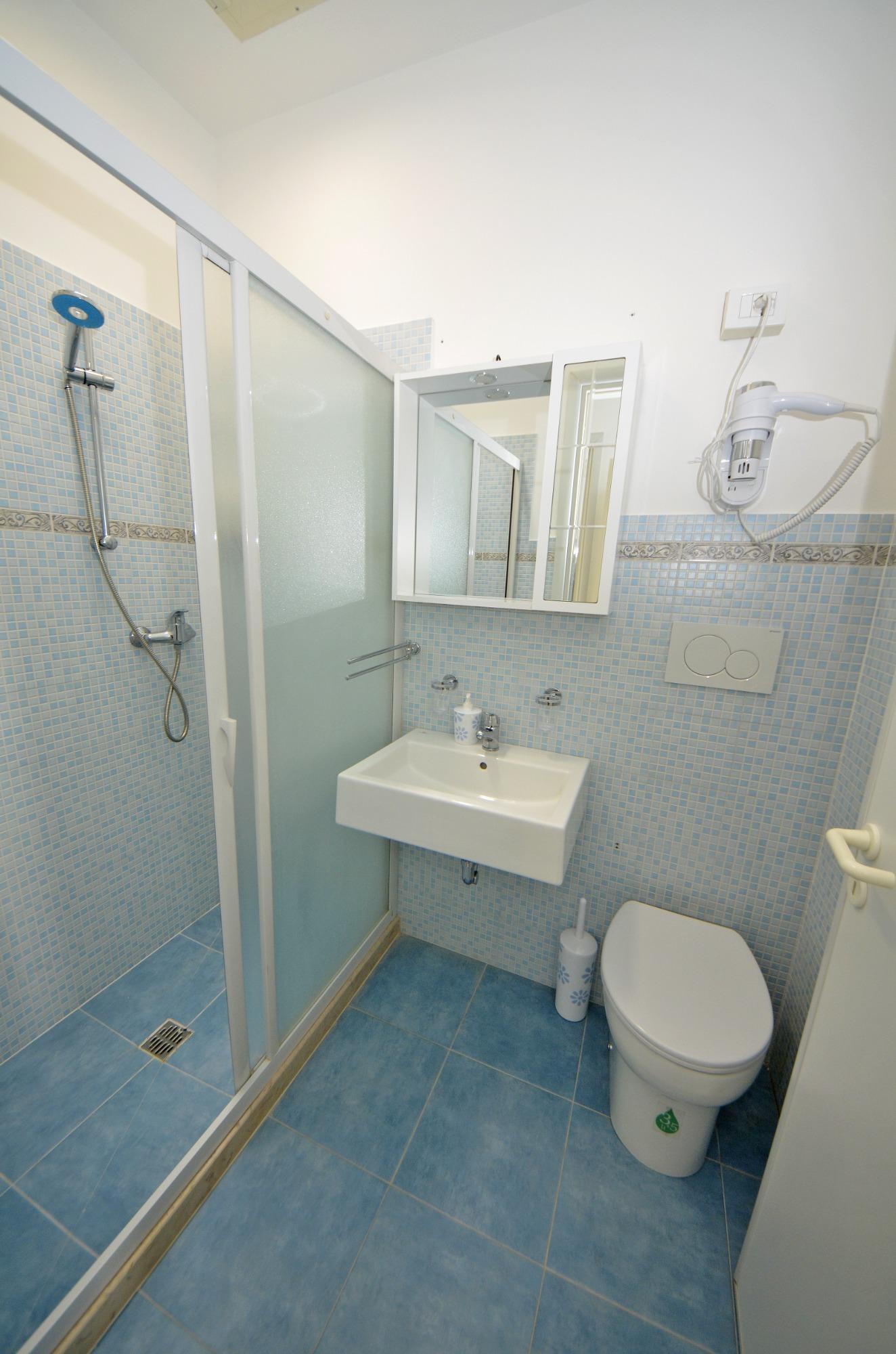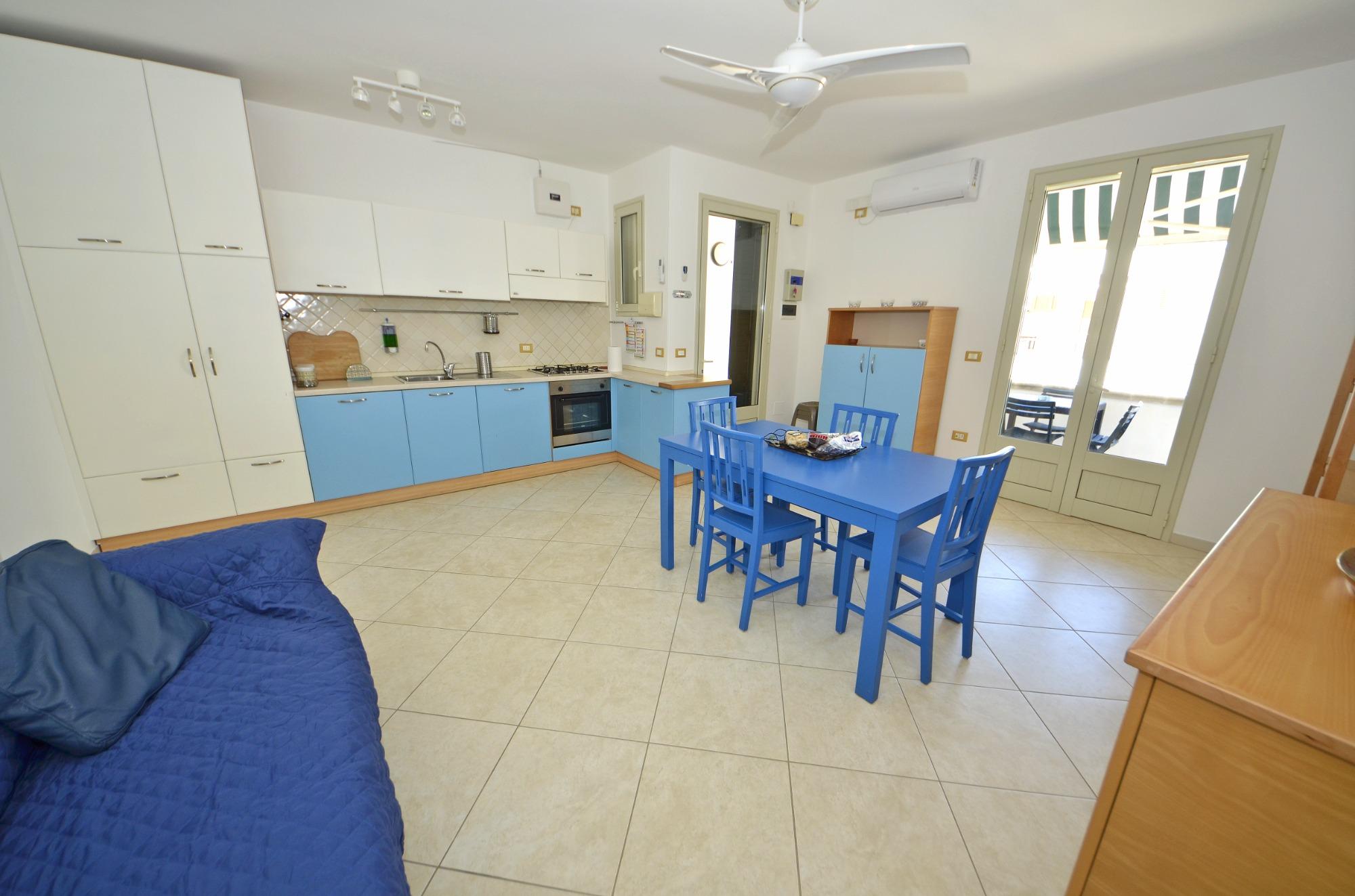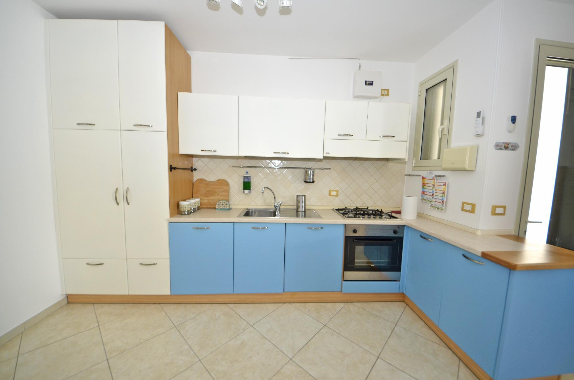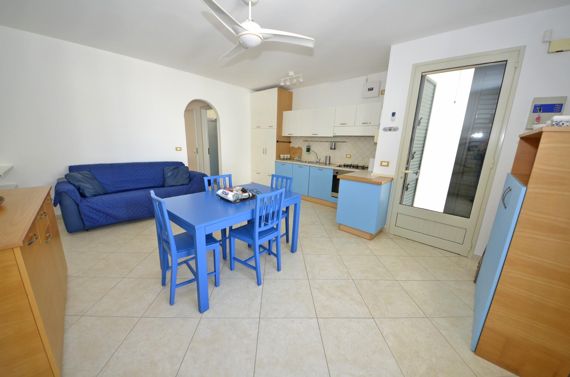 The interior spaces include a master bedroom and a second room with bunk beds, making it ideal for accommodating younger guests. The kitchen is fully equipped with all the necessary appliances, including an oven, refrigerator, dishwasher, and washing machine, allowing for a completely independent stay. The internal bathroom features a shower and is complemented by a convenient outdoor shower designed for rinsing off after a day at the beach. Air conditioning and a TV enhance the comfort, making the stay even more enjoyable.