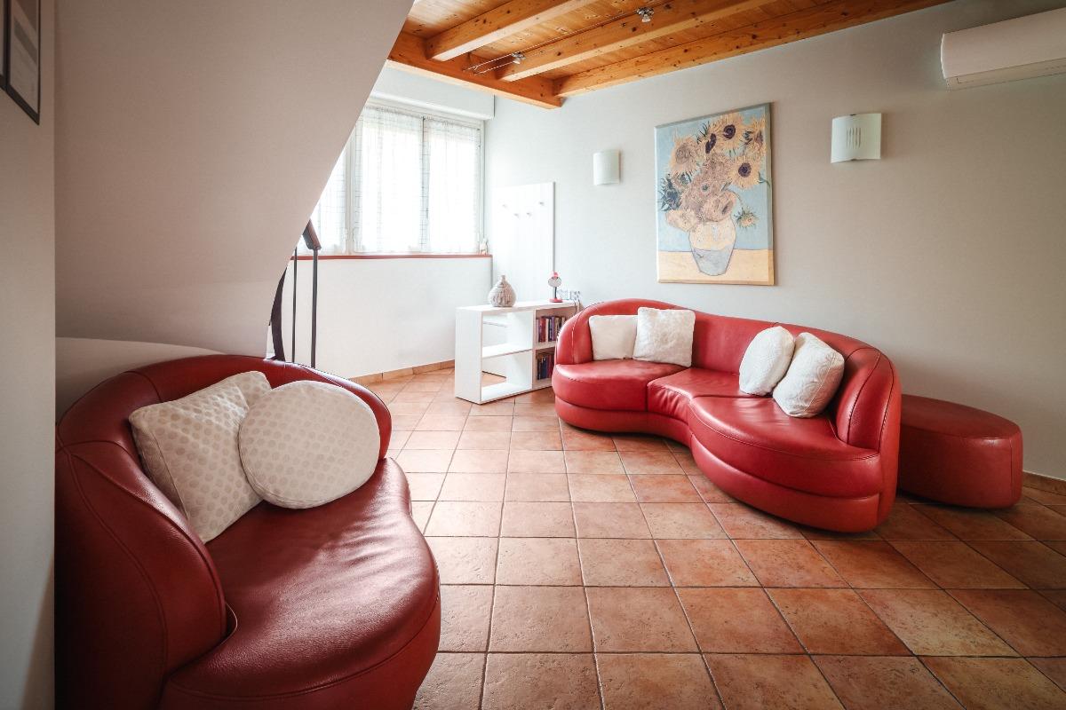 Al piano terra troverete un ampio salotto con area relax, una cucina completamente attrezzata e un bagno familiare con doccia. Al piano superiore, raggiungibile tramite una scala, si trova la zona notte con due camere da letto matrimoniali, una zona studio e un altro bagno familiare con vasca.