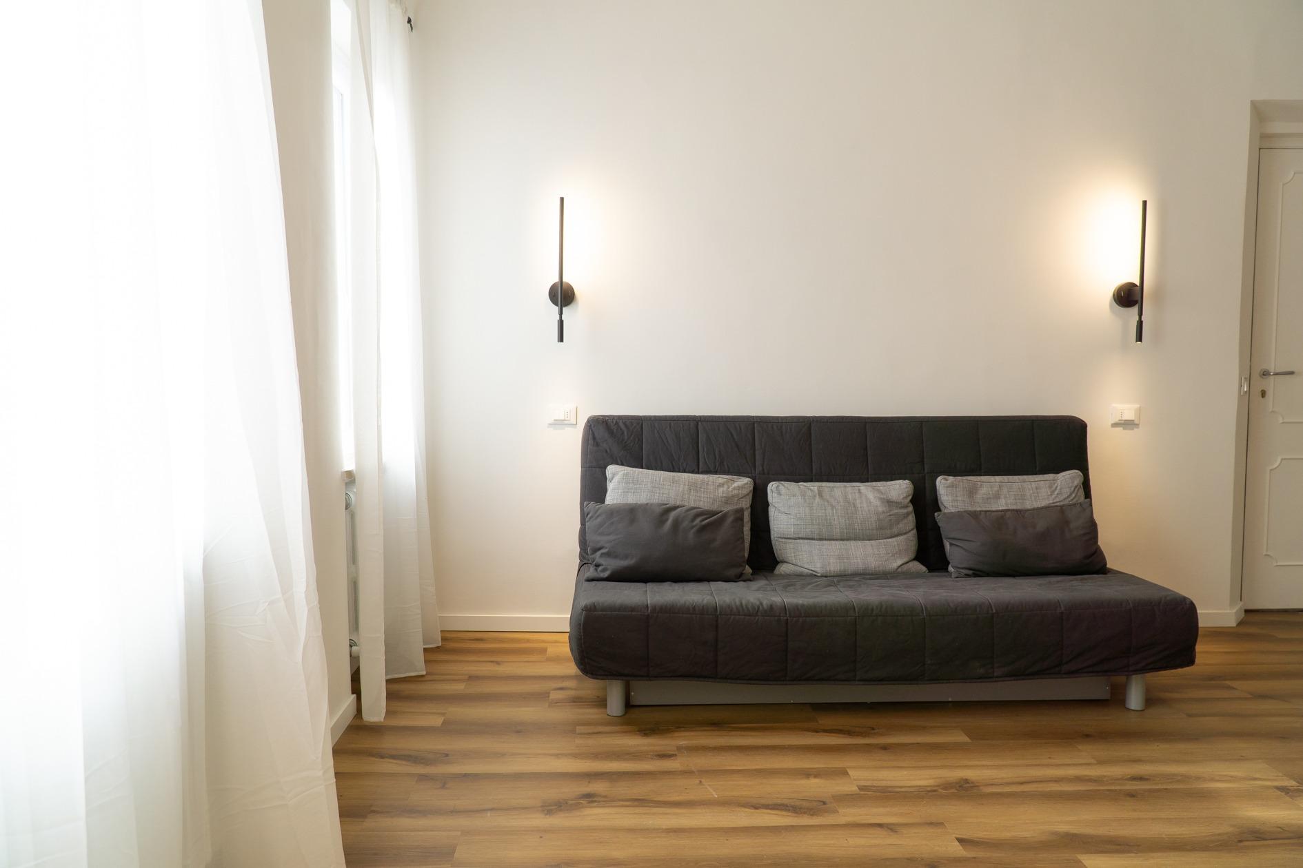 Les intérieurs sont agencés de manière pratique : le salon accueille les visiteurs avec un canapé-lit et une entrée lumineuse, tandis que la chambre principale, spacieuse et dotée d'un balcon, assure un sommeil agréable. La salle de bain, avec fenêtre et douche, est conçue pour offrir confort et fonctionnalité. La cuisine séparée permet de préparer les repas de manière autonome et est également équipée d'un lave-linge.