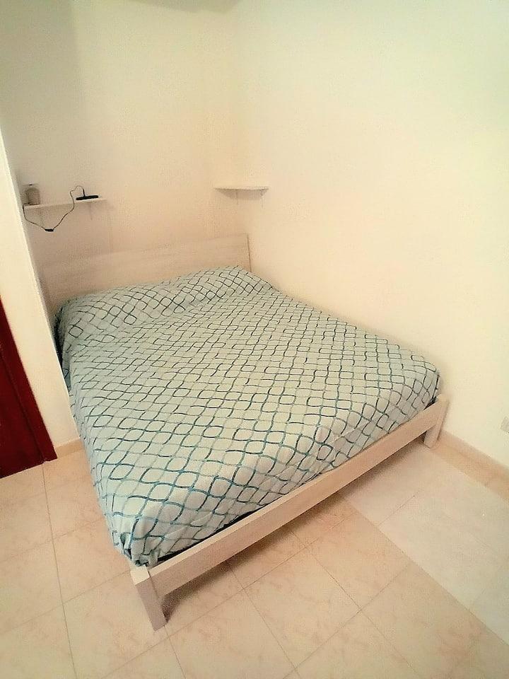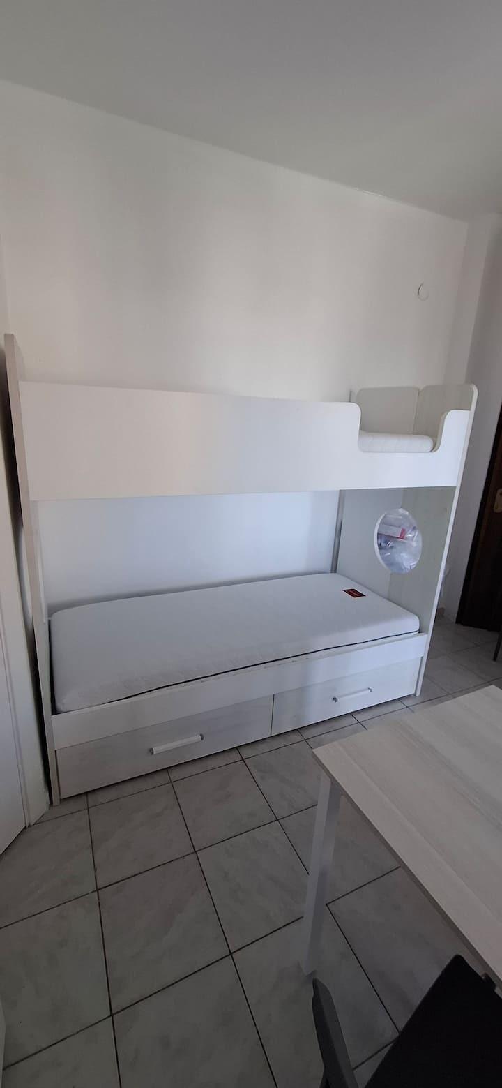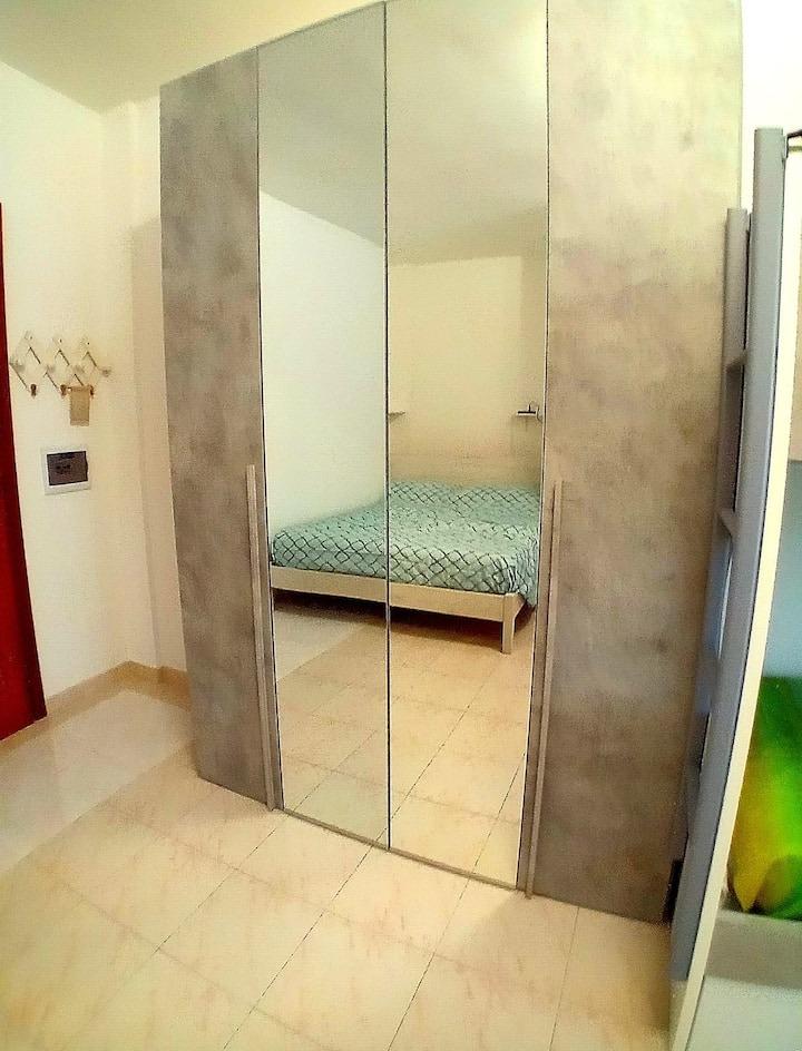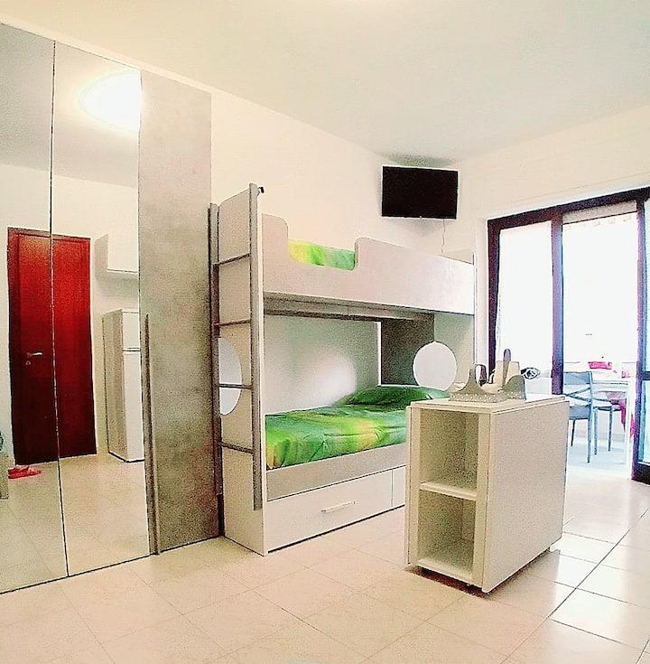 L’ambiente, curato e funzionale, è pensato per accogliere fino a quattro ospiti grazie alla presenza di un letto matrimoniale e di un letto a castello. La cucina è completamente attrezzata e dotata di piano cottura a induzione, ideale per preparare pasti in autonomia. La zona bagno comprende antibagno e bagno con moderna colonna doccia idromassaggio, per concedersi momenti di relax al rientro dal mare.