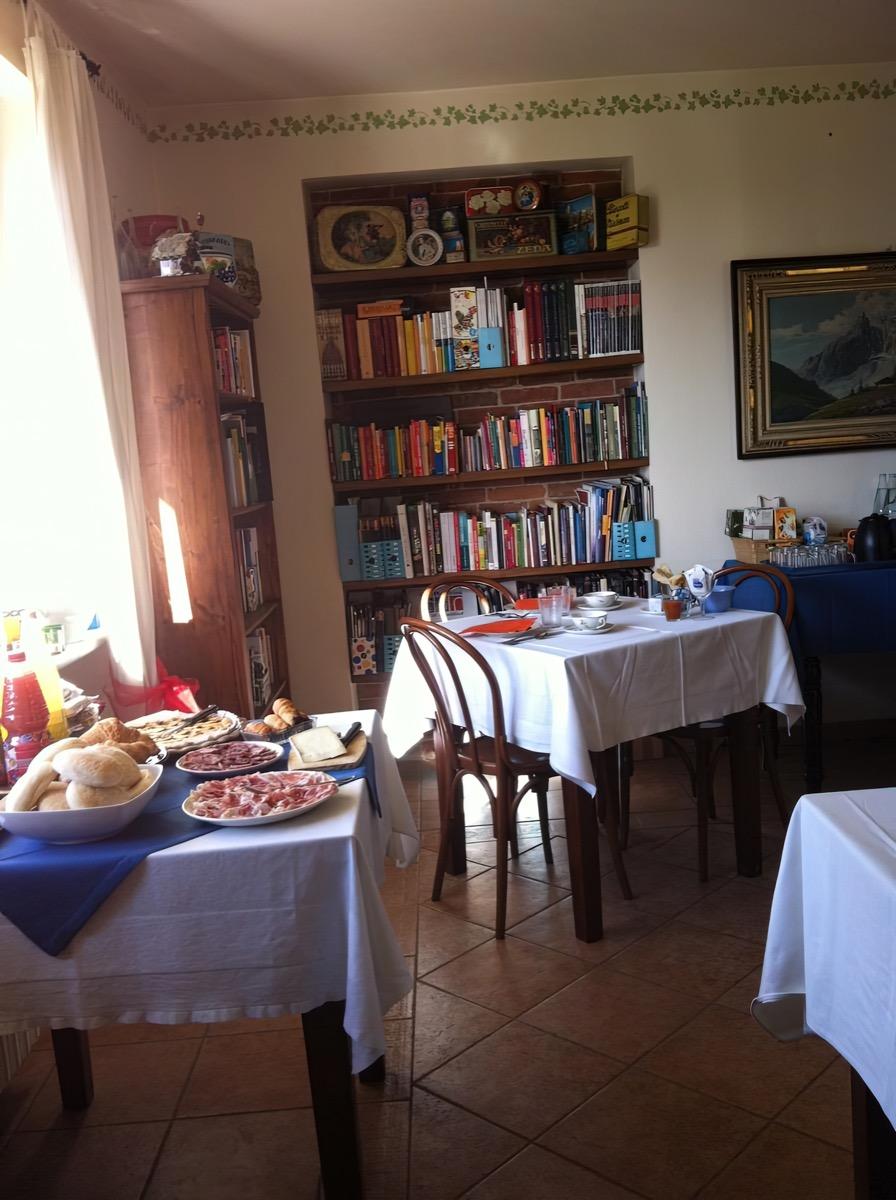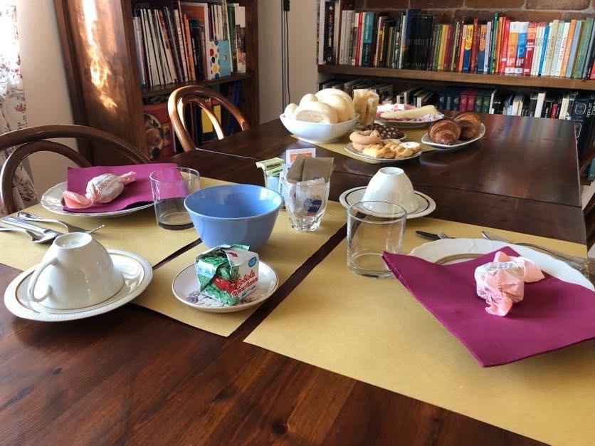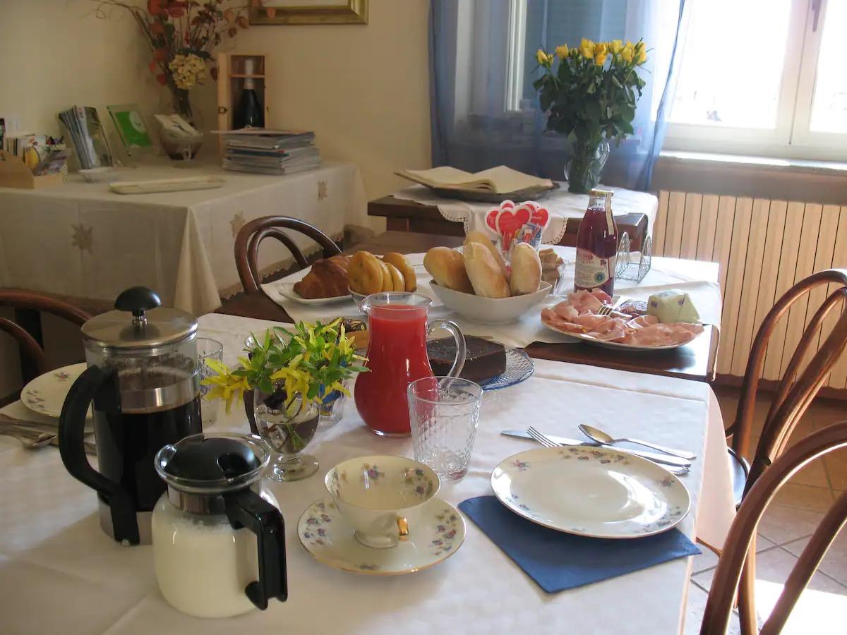 Ein reichhaltiges Büfettfrühstück mit süßen und herzhaften Optionen, darunter frisches Brot, Focaccia oder Pizza, Croissants, hausgemachter Kuchen, Kekse, Fruchtsäfte, Marmeladen aus Früchten unseres Bauernhofs, eine Platte mit Aufschnitt und Käse, Joghurt und frischem Obst.